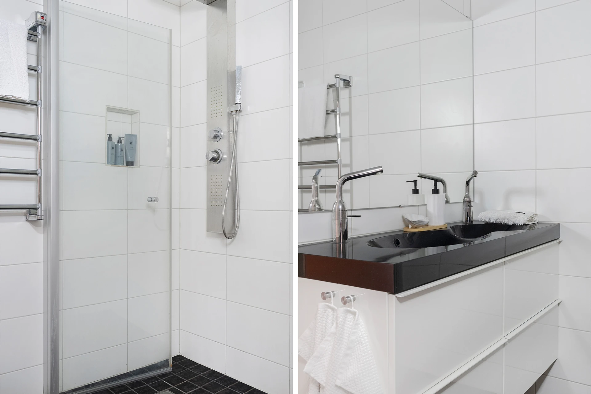 Golv: klinker. Väggar: kakel. Utrustning: dubbeltvättställ, dubbeldusch, golvvärme, spotlights, handdukstork.