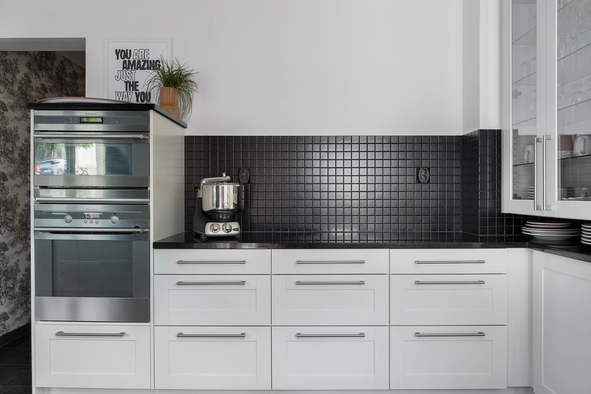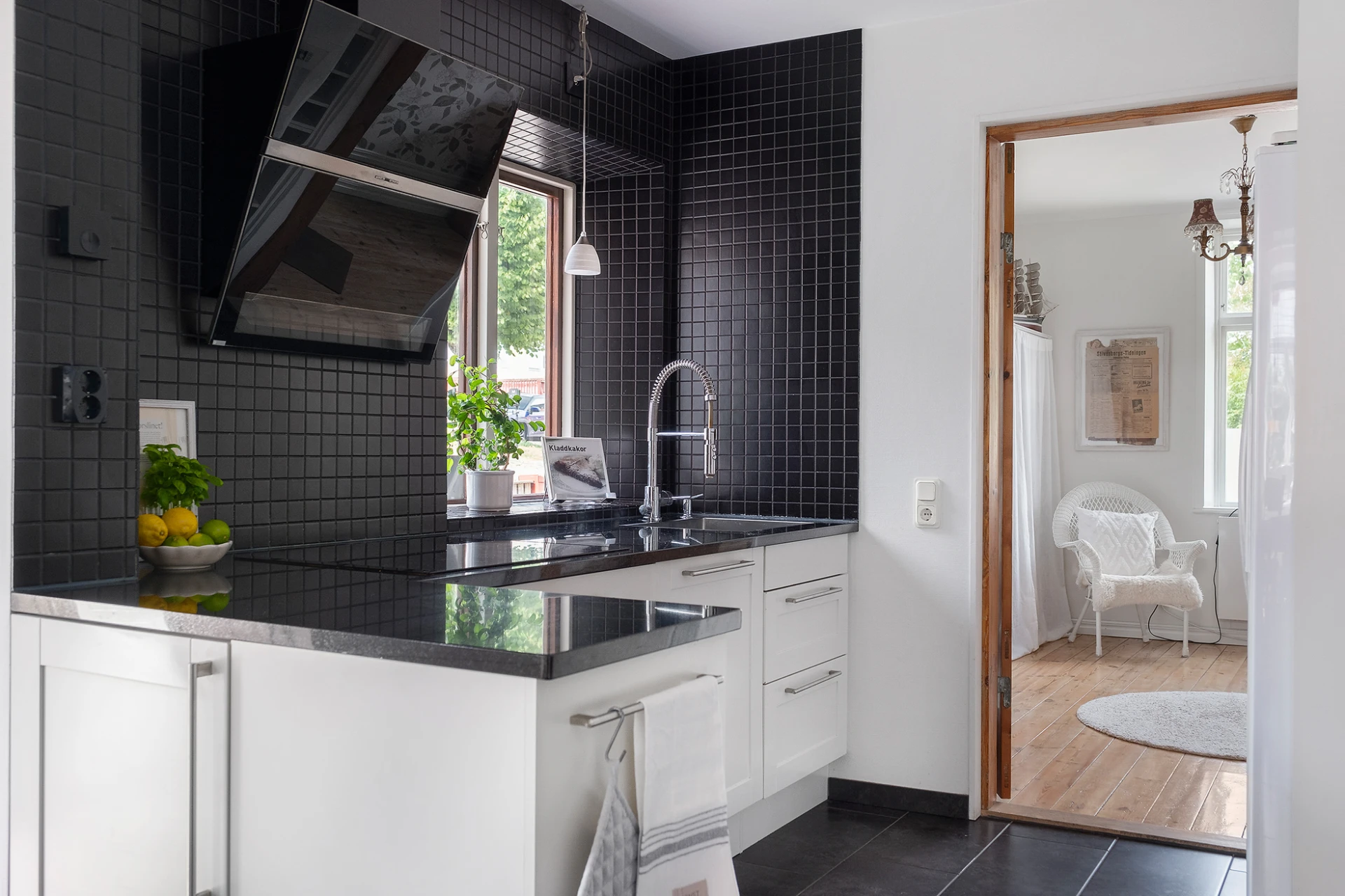 Golv: golvvärme. Utrustning: spishäll, inbyggd varmluftsugn, spisfläkt, inbyggd mikrovågsugn, Side by Side, diskmaskin, kakel, granitbänkskiva, spotlights.