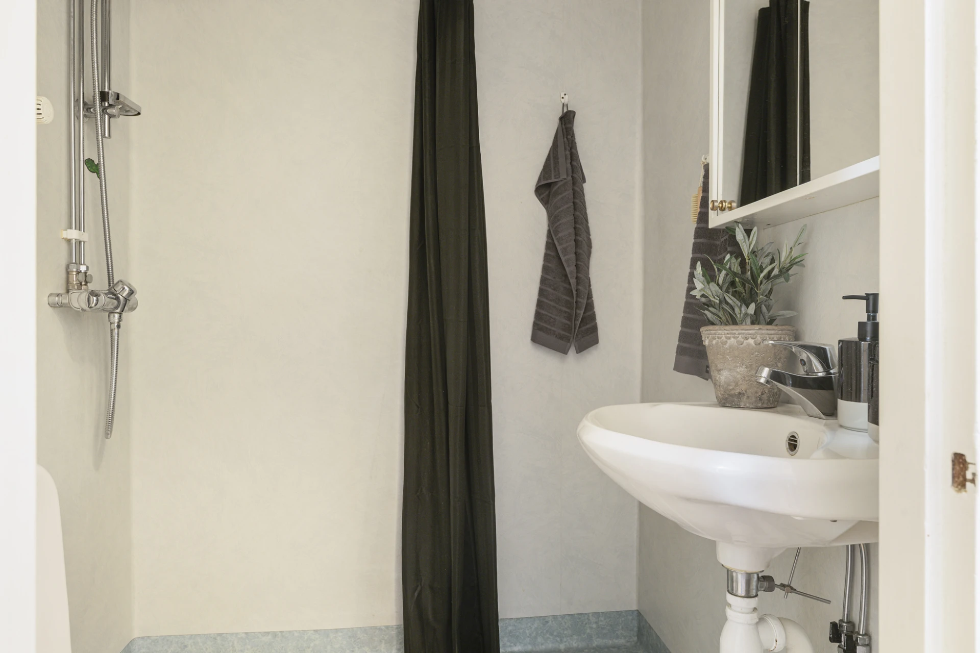 Badrummet är funktionellt och utrustat med dusch, handfat och spegelskåp som ger praktisk förvaring. Väggarna är ljusa vilket bidrar till en fräsch känsla.