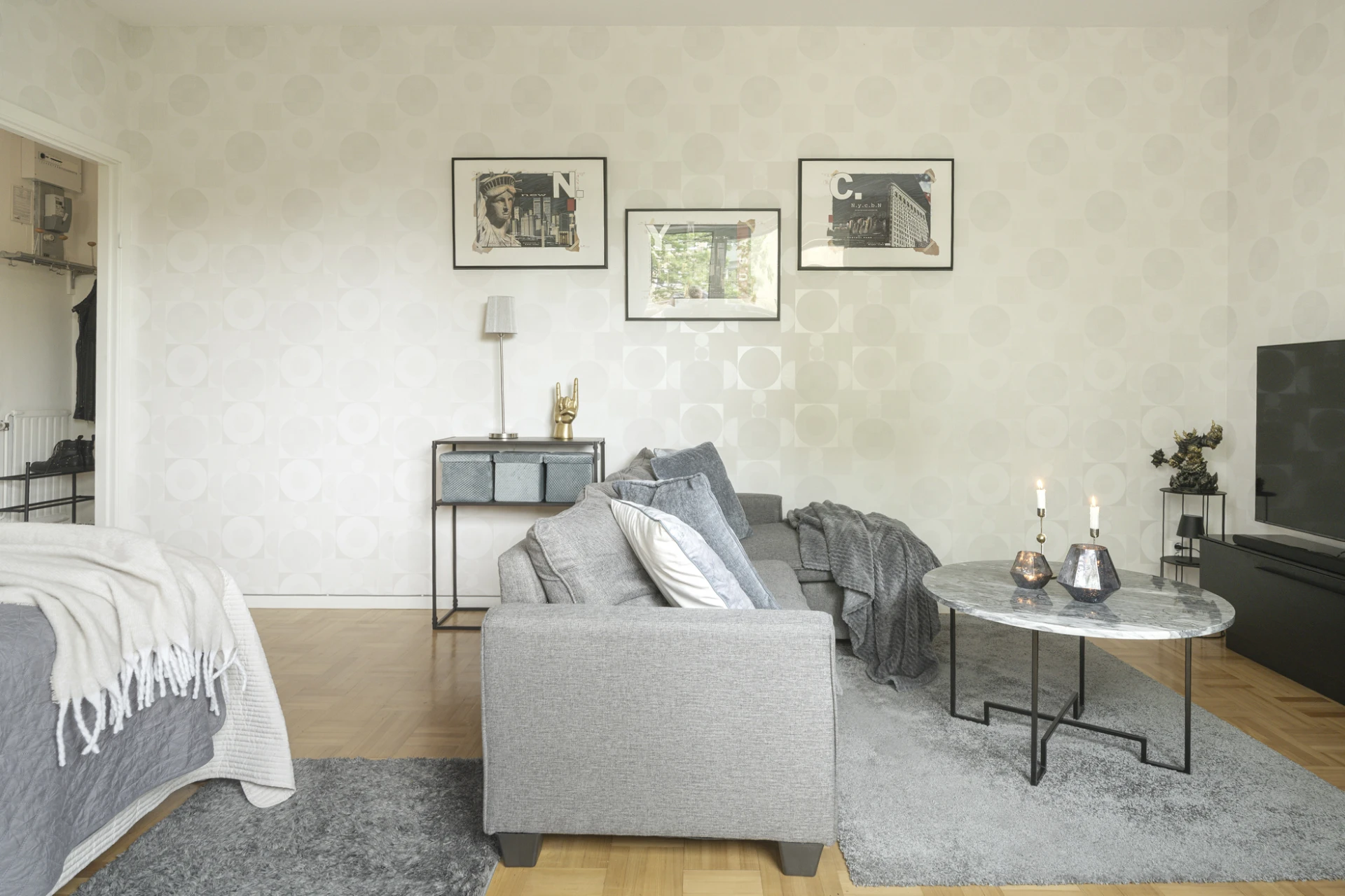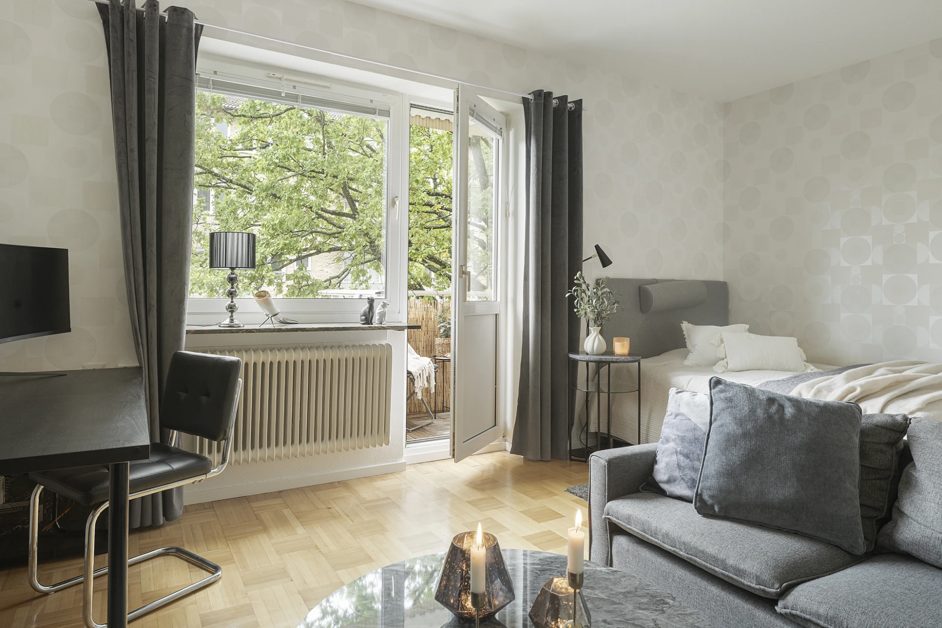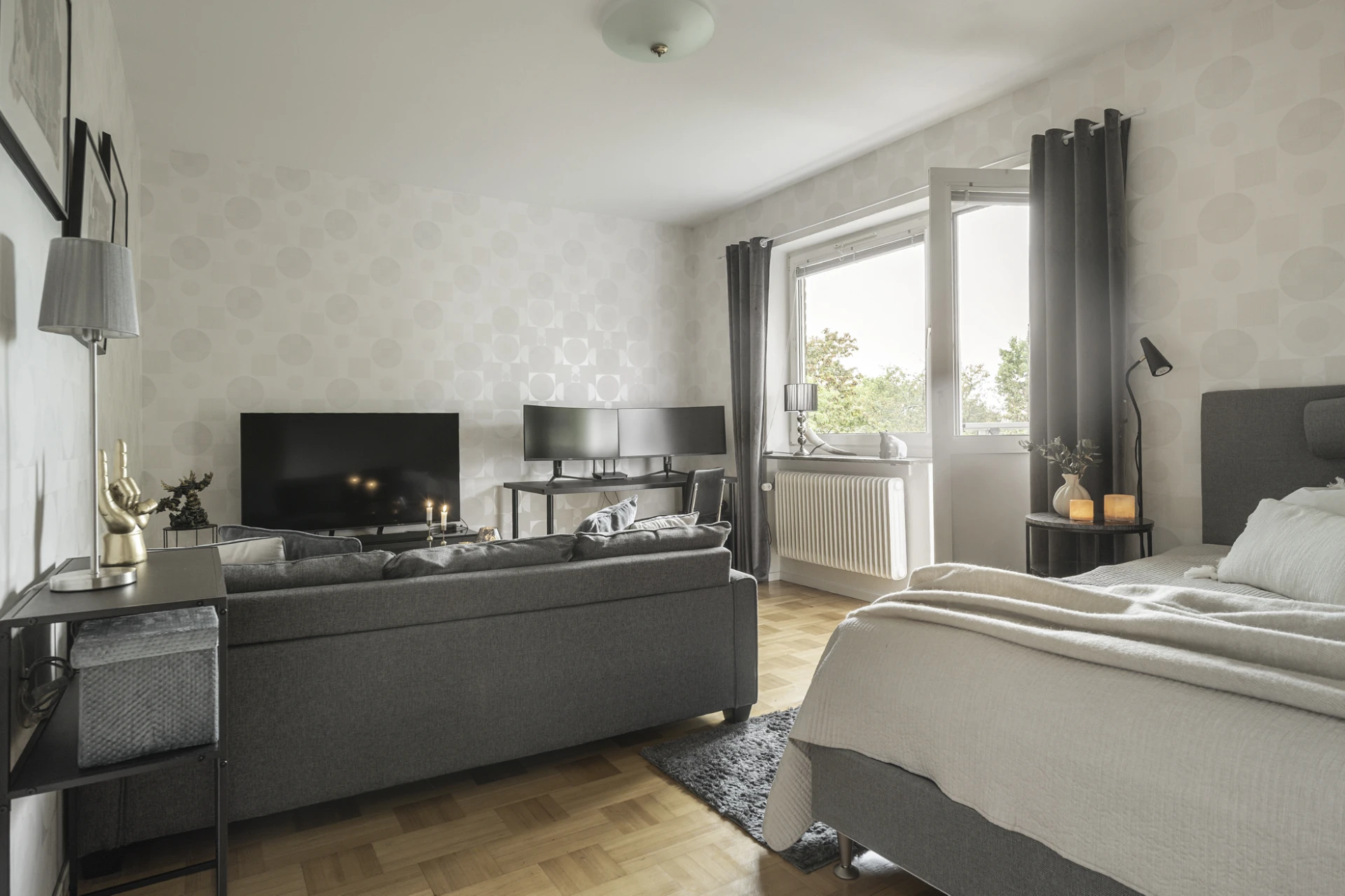 Rummet är ljust och luftigt med generösa fönsterpartier som släpper in gott om dagsljus. Härifrån nås även en trevlig balkong med utsikt mot grönskande omgivningar. Väggarna är tapetserade i en ljus ton med ett diskret mönster som ger rummet karaktär utan att ta över. Golvet består av klassisk parkett som skapar en varm och tidlös känsla. Planlösningen är yteffektiv och gör det enkelt att kombinera olika funktioner såsom sovdel, arbetsplats och vardagsrum i samma rum. Takhöjden tillsammans med rummets rektangulära form gör det lättmöblerat och flexibelt för olika behov.