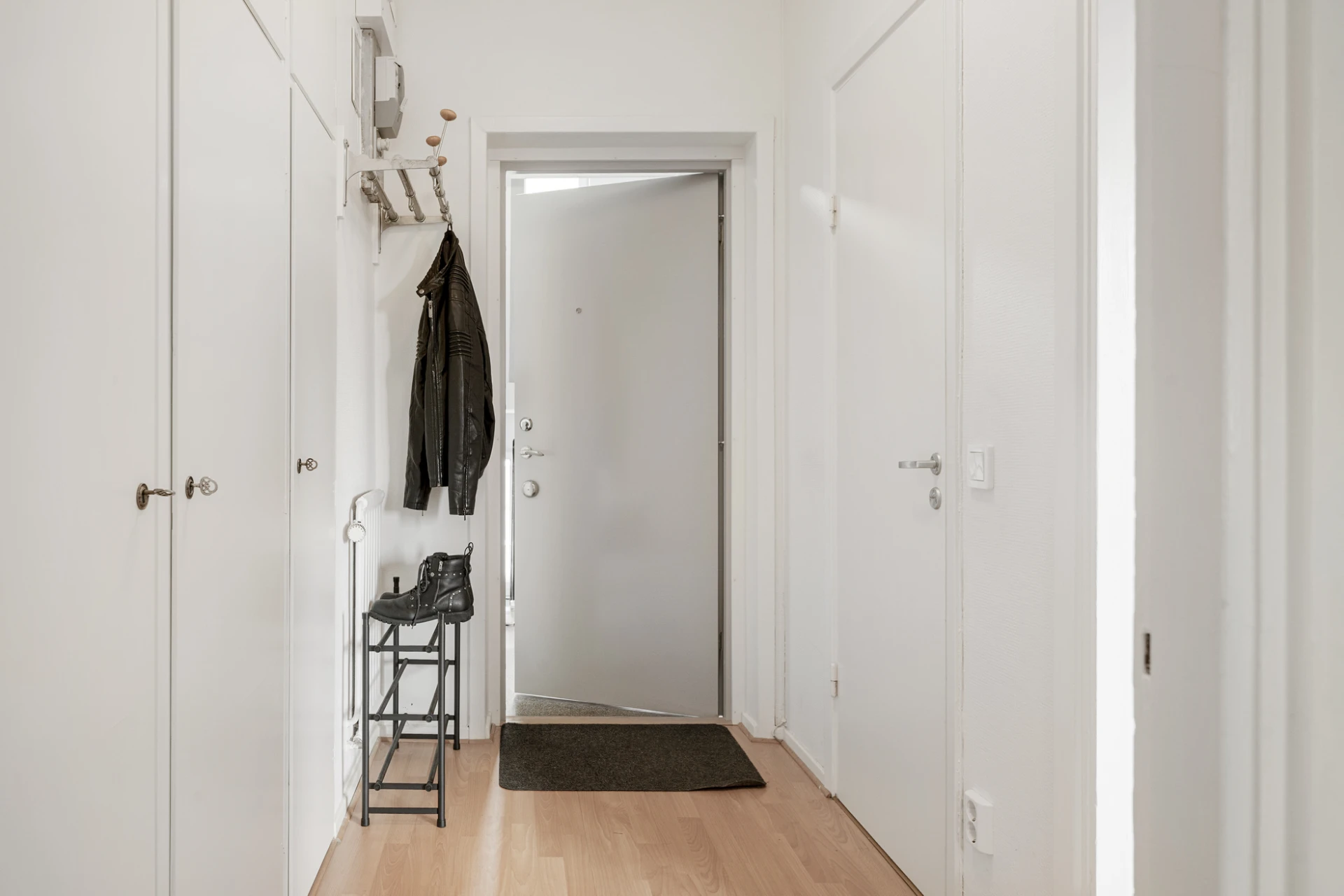 Välkomnande hall med ljusa väggar och praktiskt golv i träimitation. Här finns gott om förvaring i form av flera inbyggda garderober. Hallen erbjuder plats för avhängning och skoförvaring samt utgör en naturlig knutpunkt som leder vidare till bostadens övriga rum.