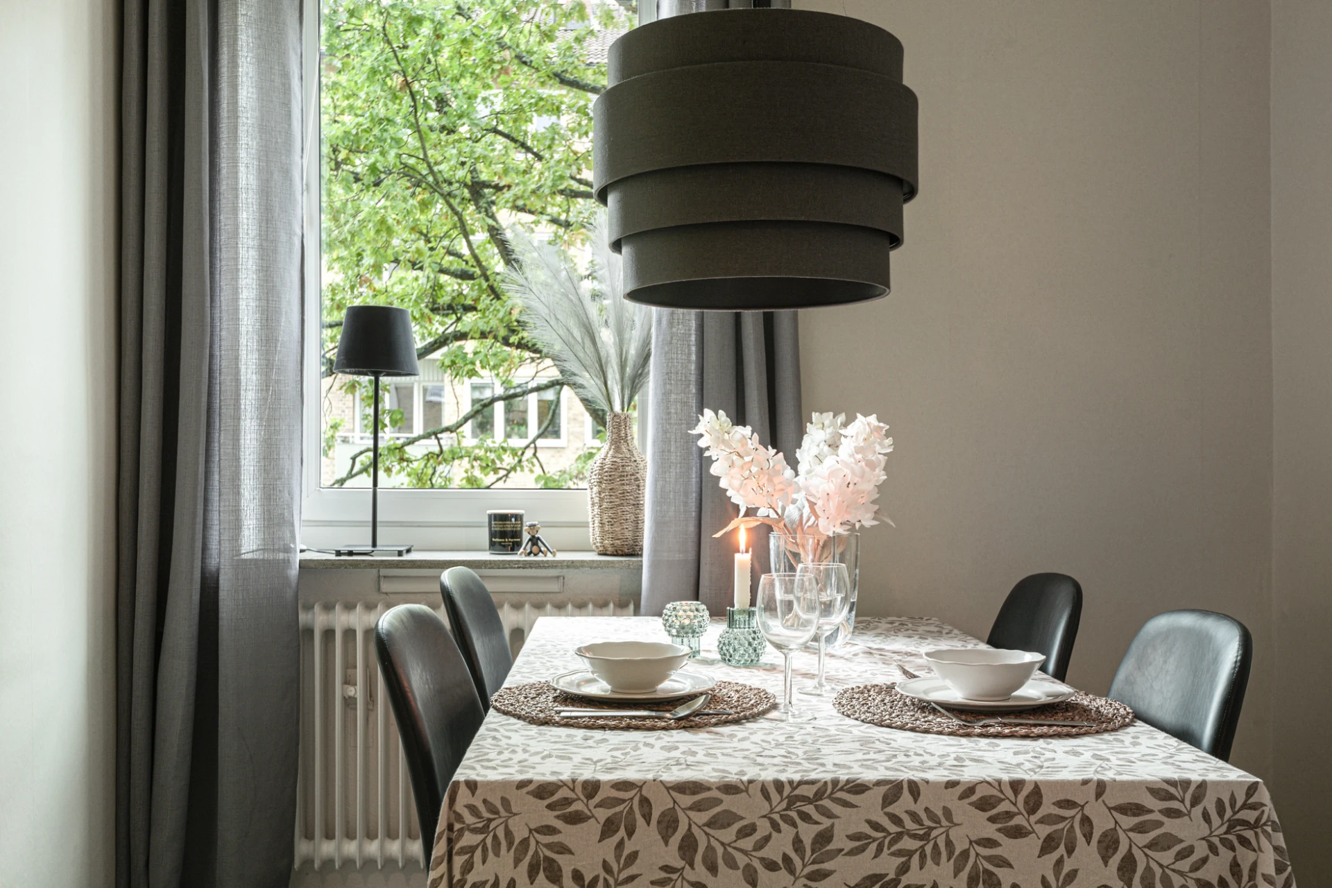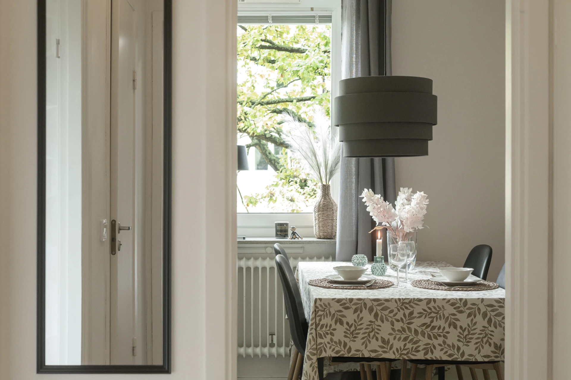 Genomgångsrummet fungerar utmärkt som en rymlig matplats. Här finns gott om plats för ett matbord och fönstret mot gården släpper in rikligt med dagsljus, vilket skapar en ljus och trivsam miljö. Rummet ligger i anslutning till köket. De ljusa väggarna och golvet ger en neutral bas som enkelt kan anpassas efter olika inredningsstilar.