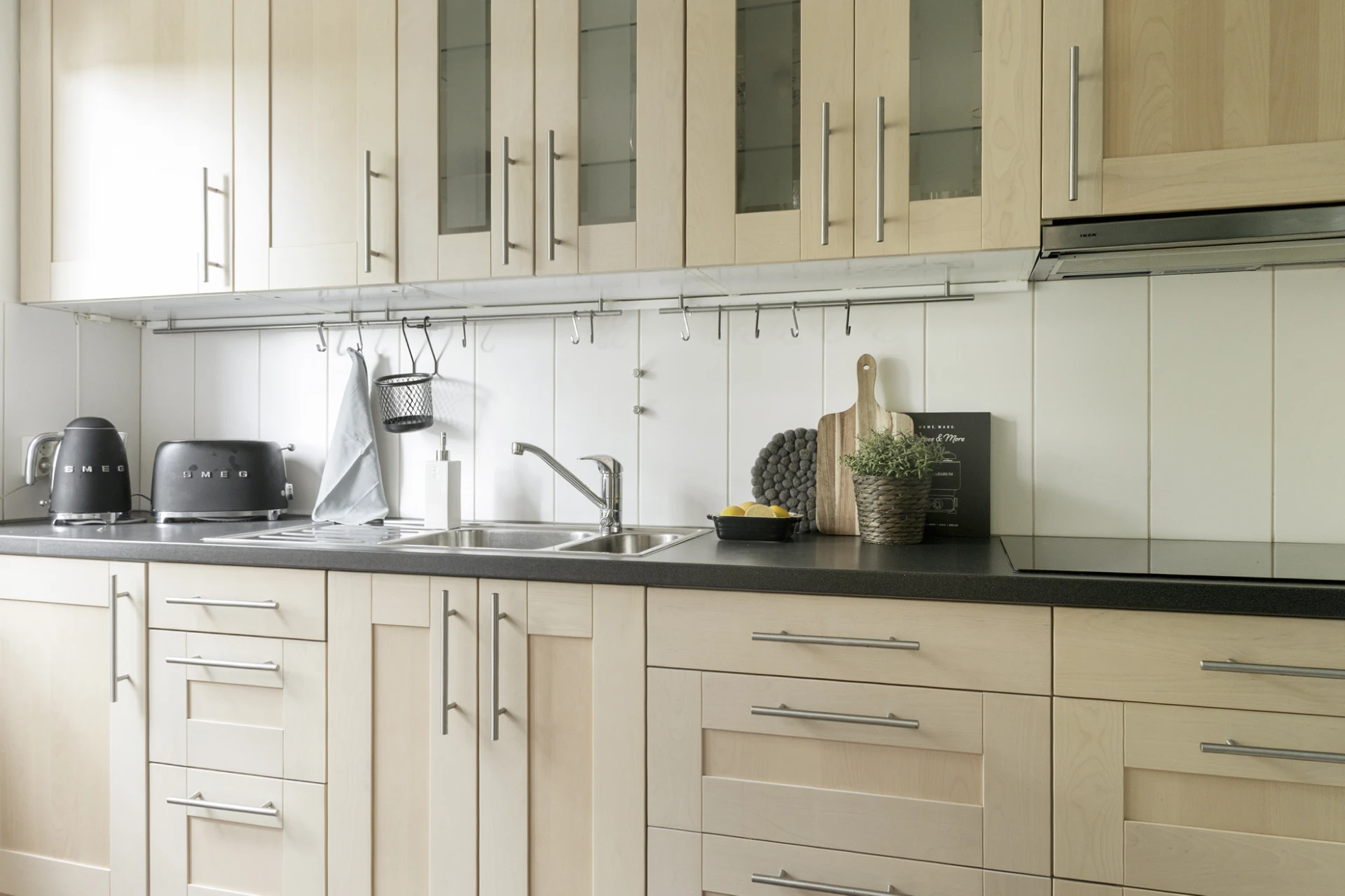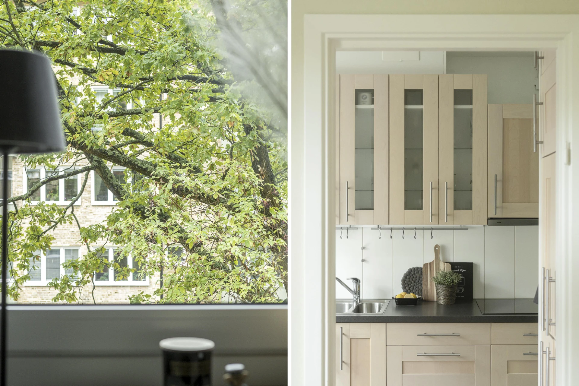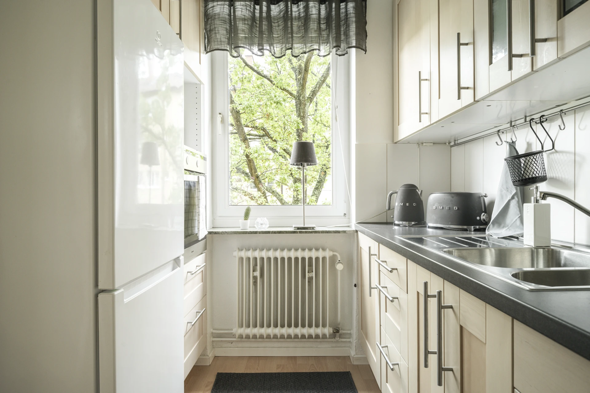 Köket är praktiskt utformat med gott om både arbetsyta och förvaring i över- och underskåp. De ljusa träfronterna tillsammans med bänkskivan i mörk kontrast skapar en tidlös och stilren känsla. Ett fönster i gavelläge ger ett fint ljusinsläpp och skapar en trivsam arbetsmiljö. Här finns moderna vitvaror och bra arbetsytor som gör matlagningen enkel. Den genomtänkta planlösningen utnyttjar ytan på ett effektivt sätt och ger samtidigt en luftig känsla.