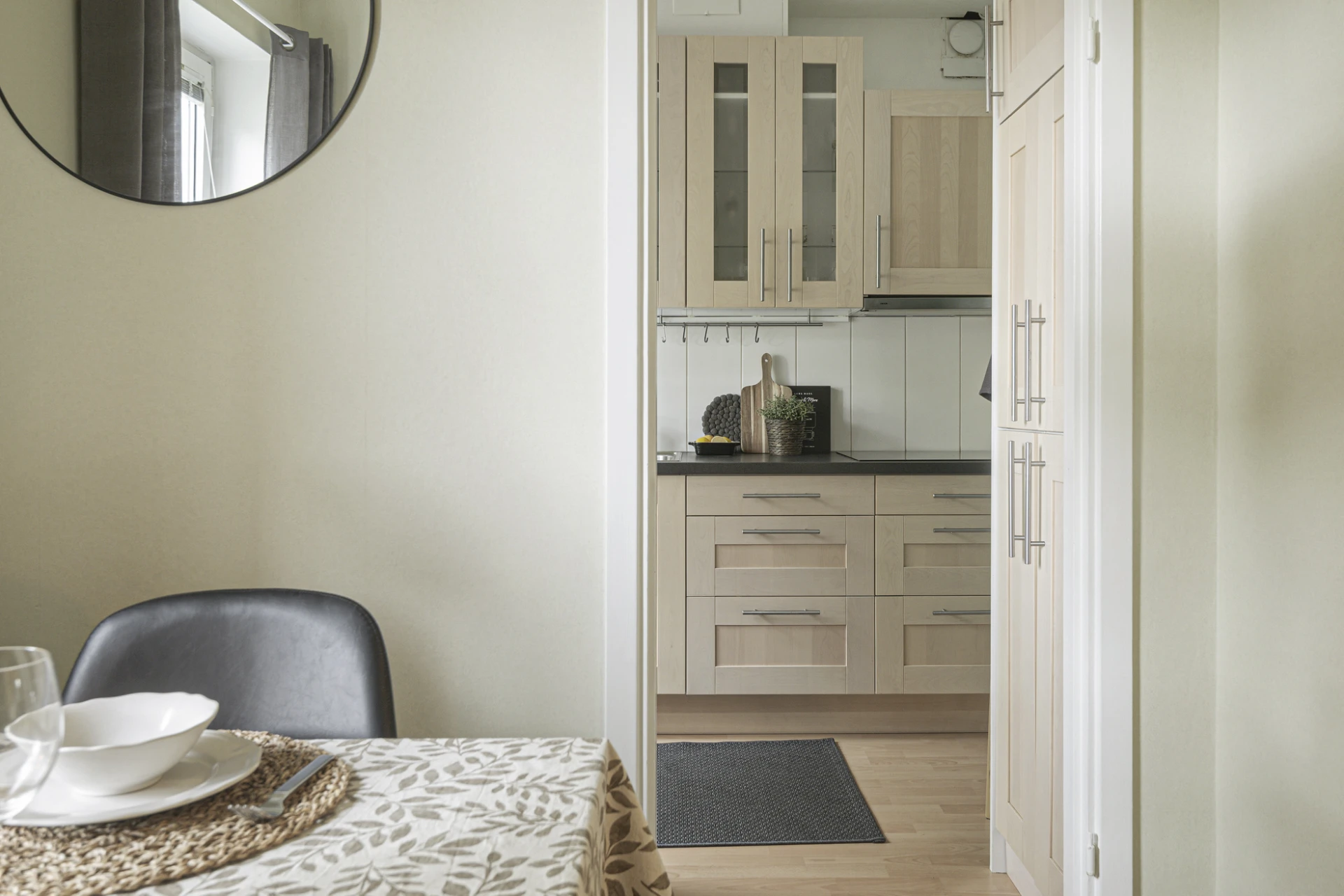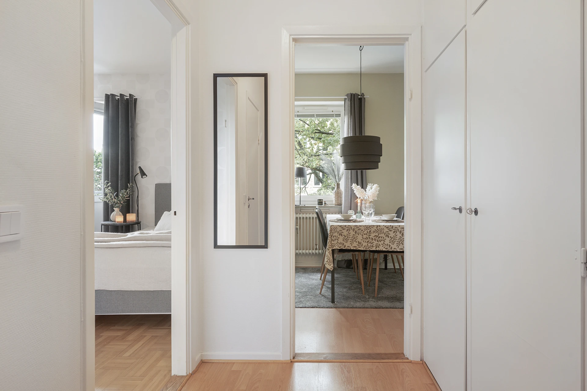 Bostaden erbjuder en rymlig hall med bra förvaringsmöjligheter, ett praktiskt kök med gott om arbetsytor, en matplats med plats för umgänge, samt ett ljust vardagsrum som rymmer både sociala ytor och avskild sovdel. Här finns även ett badrum i tidlös stil. Som pricken över i:et har bostaden en balkong med utsikt över grönska, perfekt för morgonkaffet eller en stunds avkoppling.