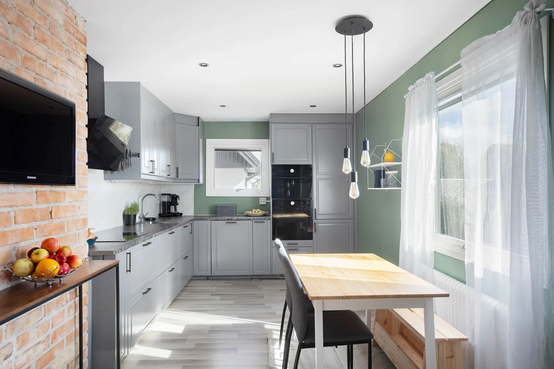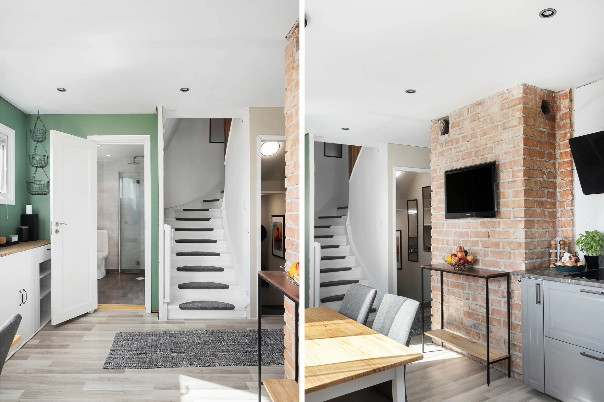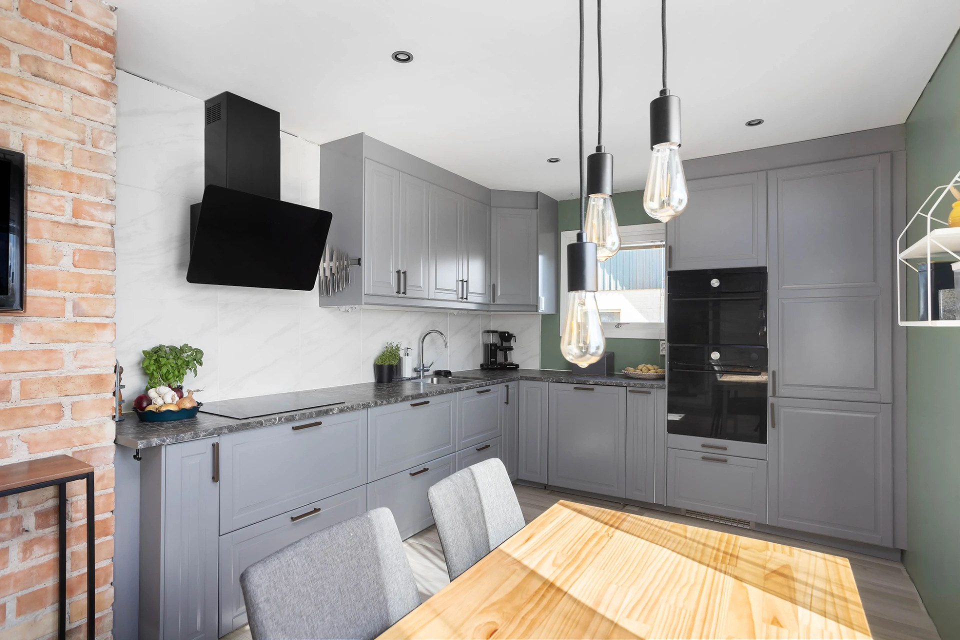 Utrustning: induktionshäll, kolfilterfläkt, inbyggd kombimikrovågsugn, inbyggd varmlufts/ångugn, diskmaskin, kakel.
