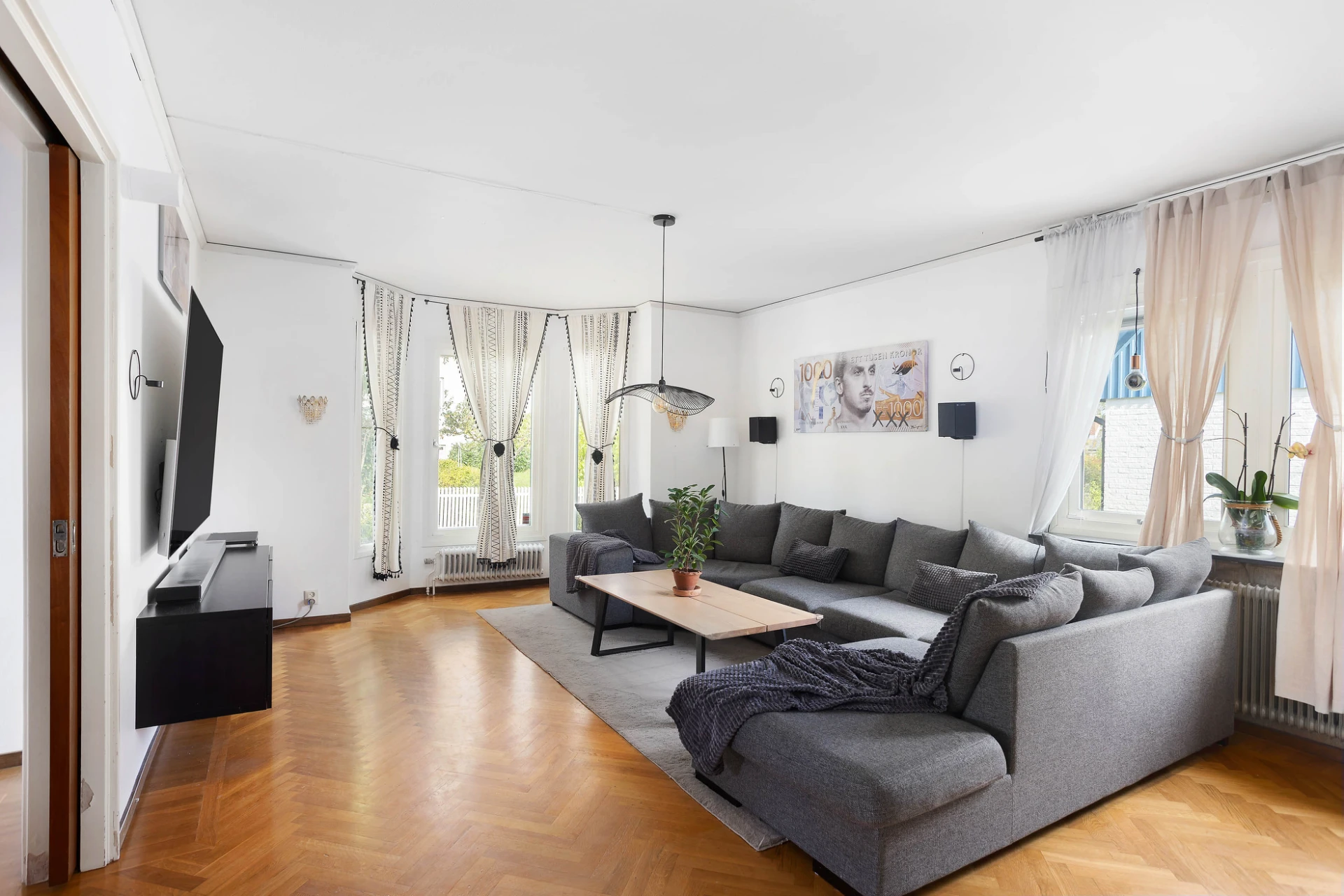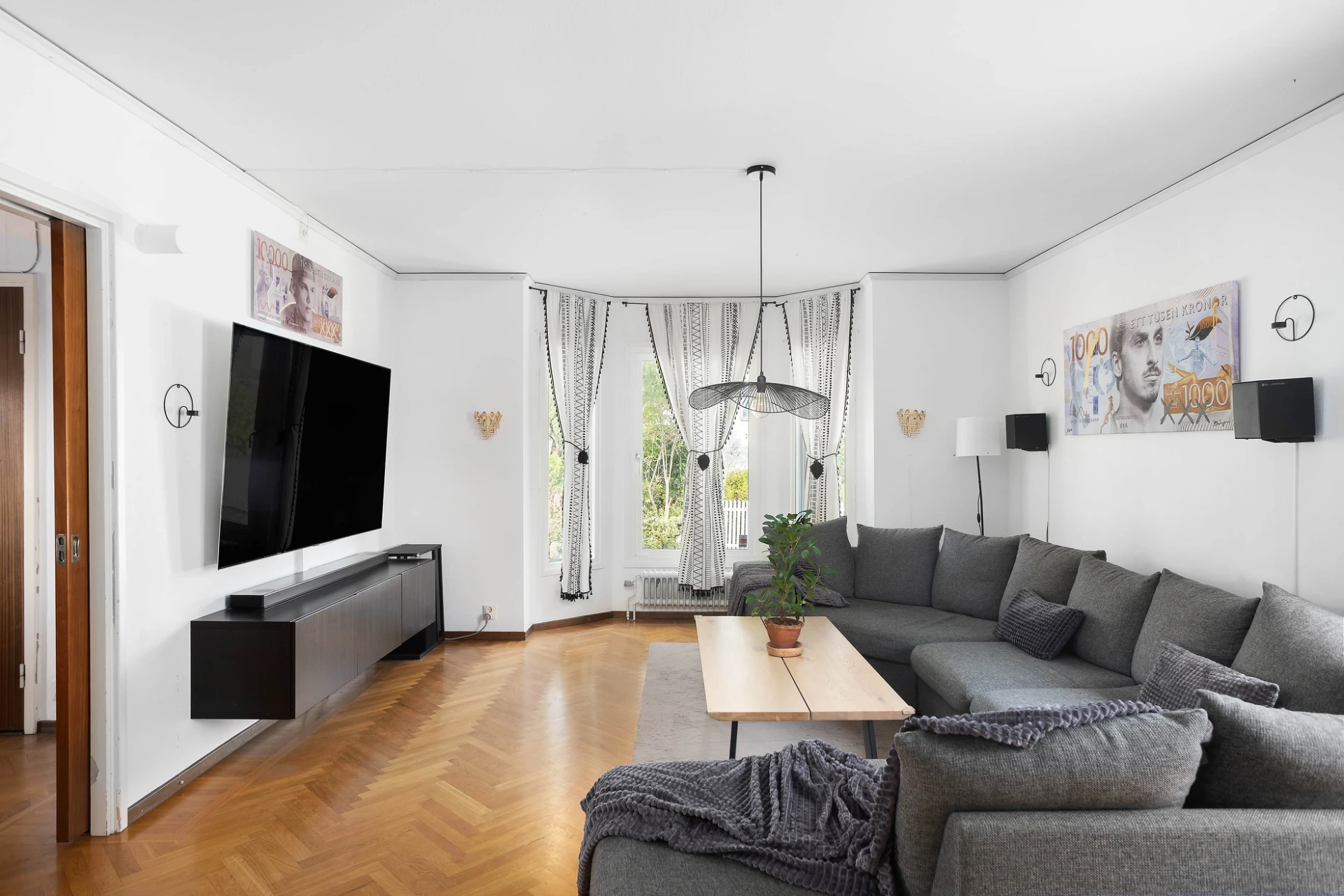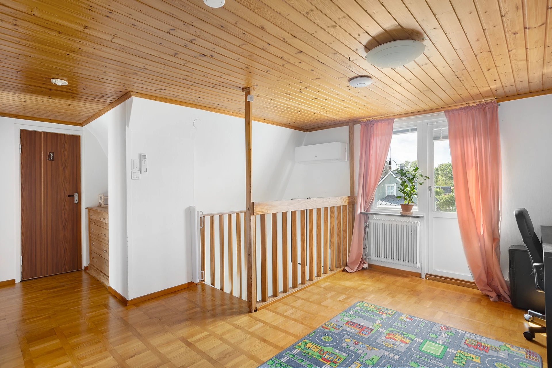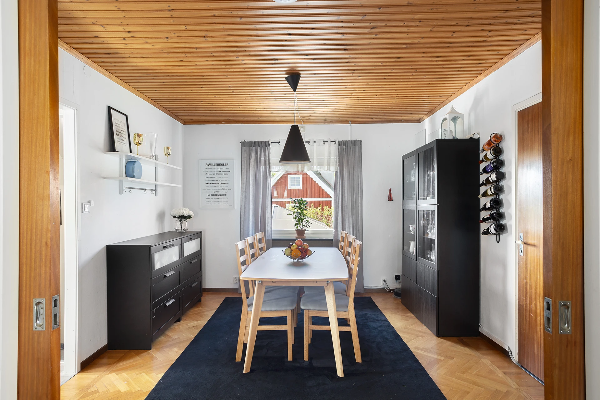 Entré, matrum - allrum med möjlighet till att installera t ex kamin i öppen planlösning med burspråk och fiskbensmönstrat parkettgolv med friis, nytt kök med matplats, duschrum, en trappa ner finns groventrén.