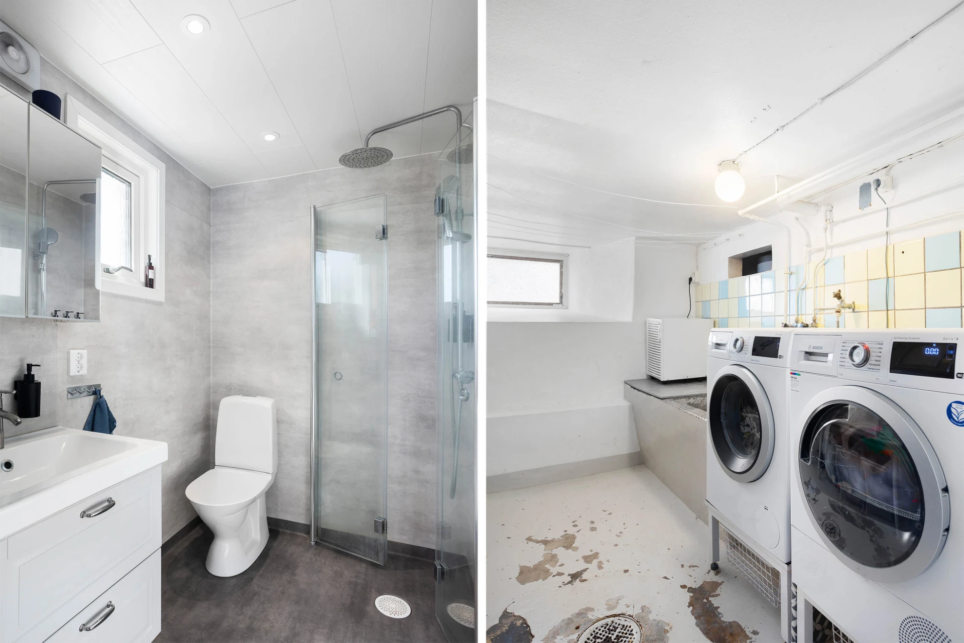 Golv: målad betong. Väggar: betong. Utrustning: tvättmaskin, torktumlare.