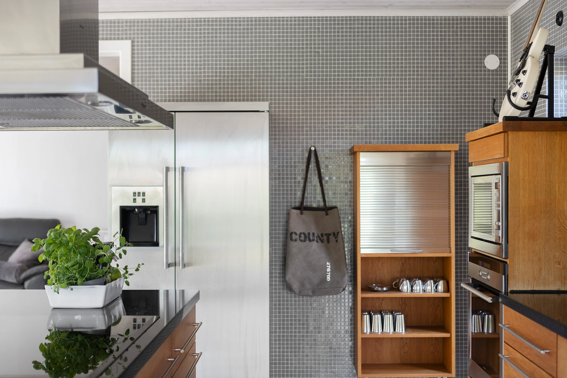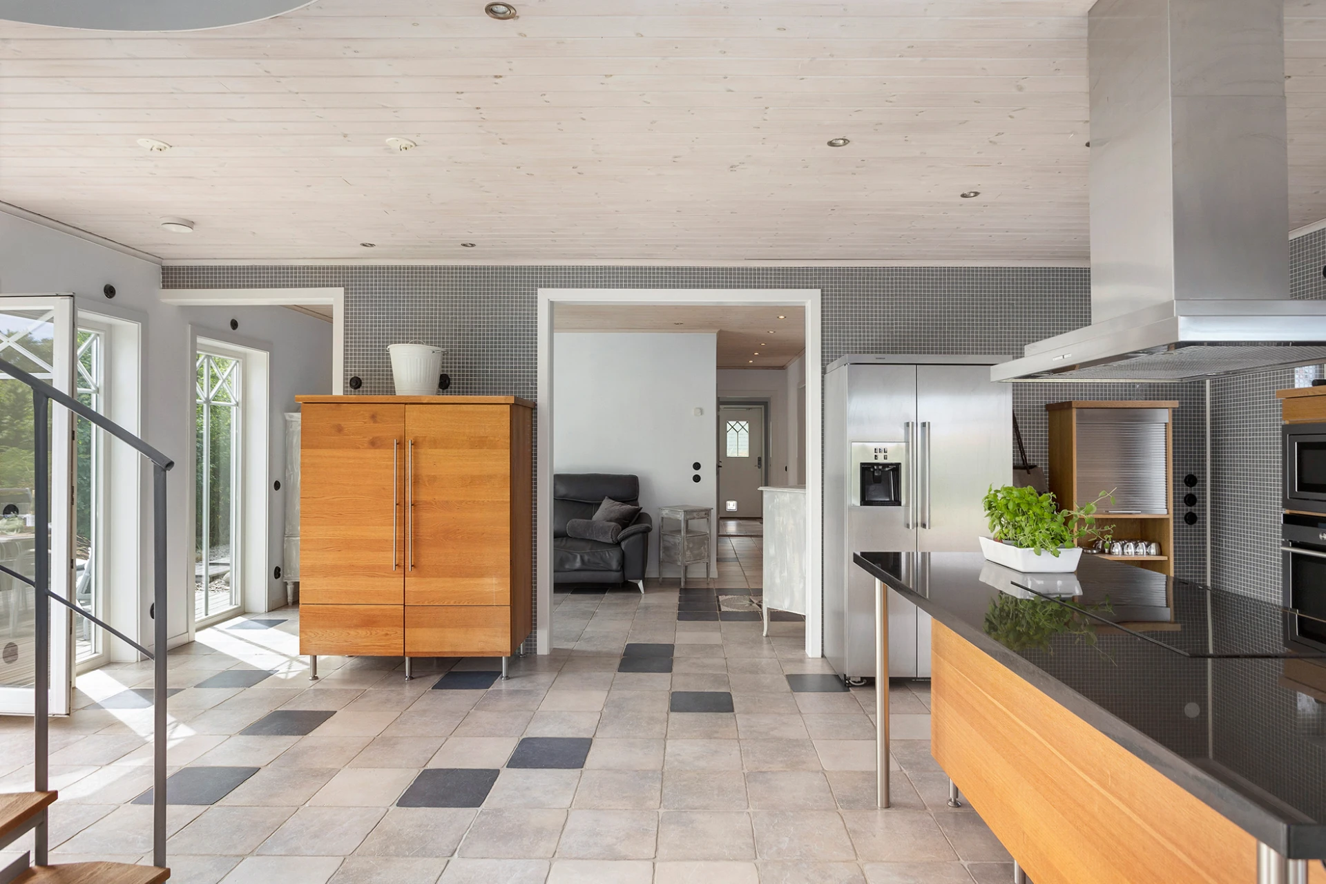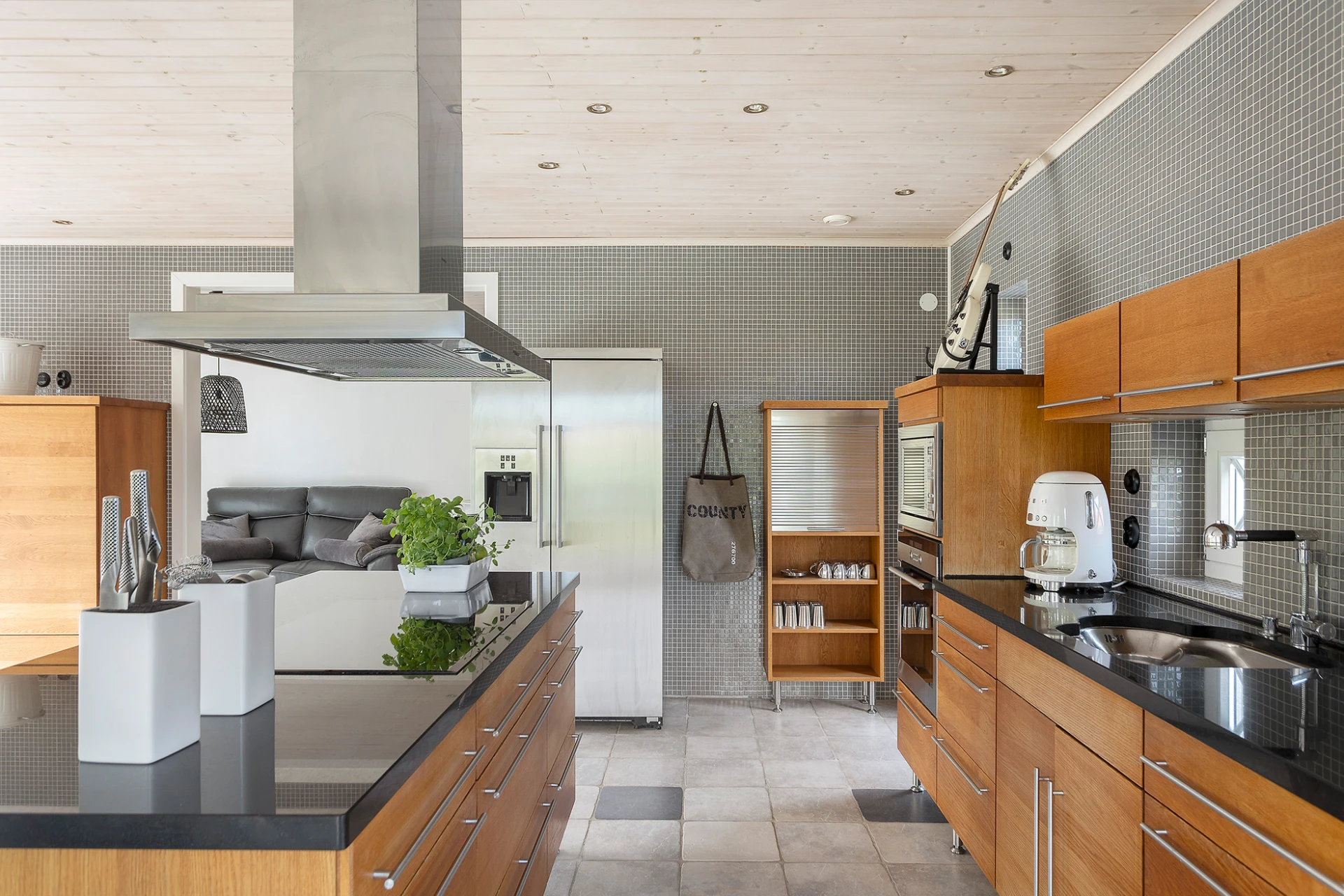 Golv: klinker. Väggar: mosaik, panel. Utrustning: köksö med induktionshäll, spisfläkt, varmluftsugn, mikrovågsugn, Side by Side(vatten och is), diskmaskin i arbetshöjd, bänkskivor i granit, kakel i mosaik, kök i ek.