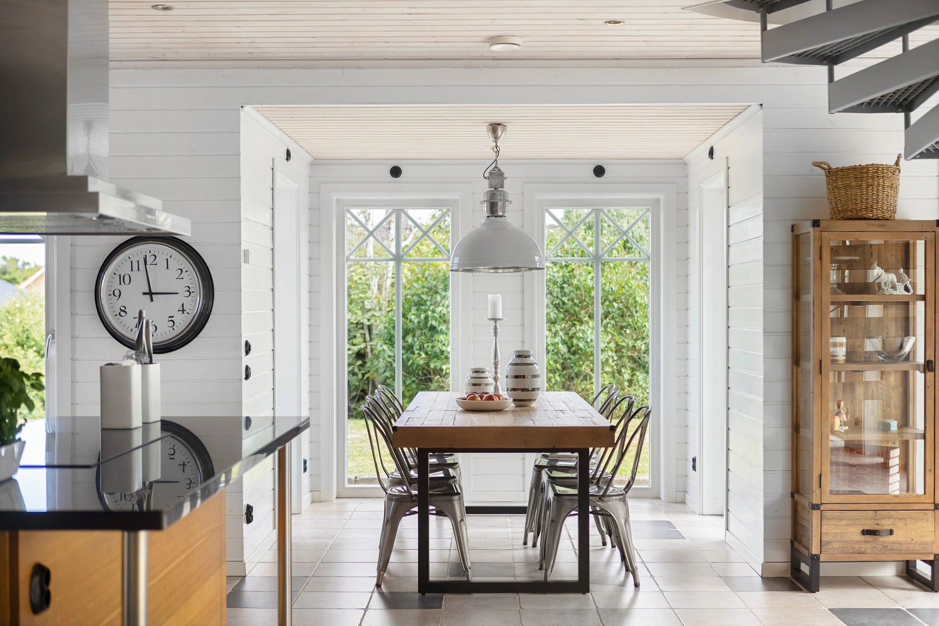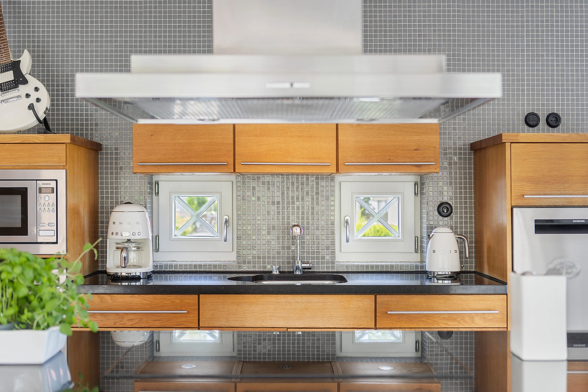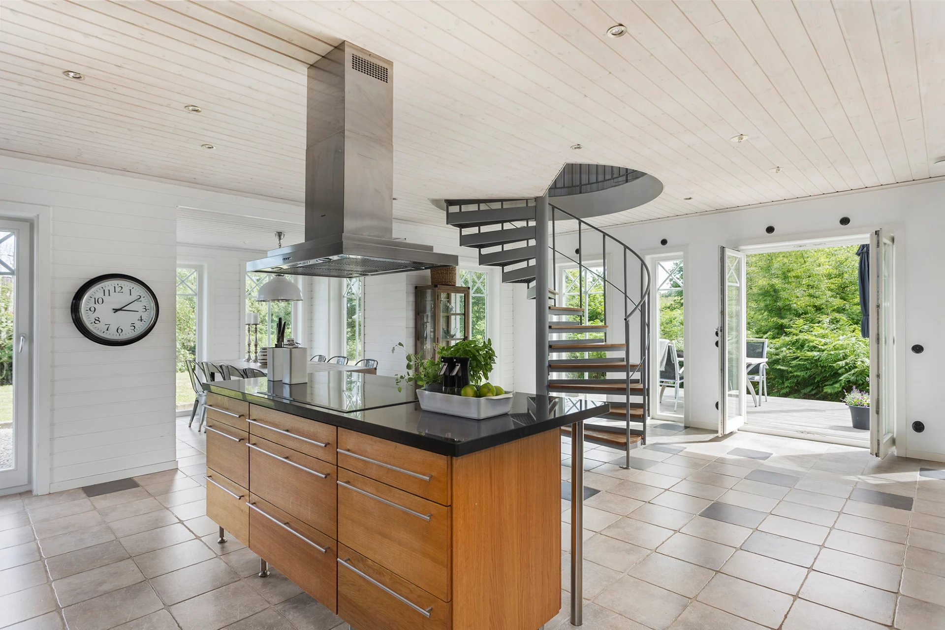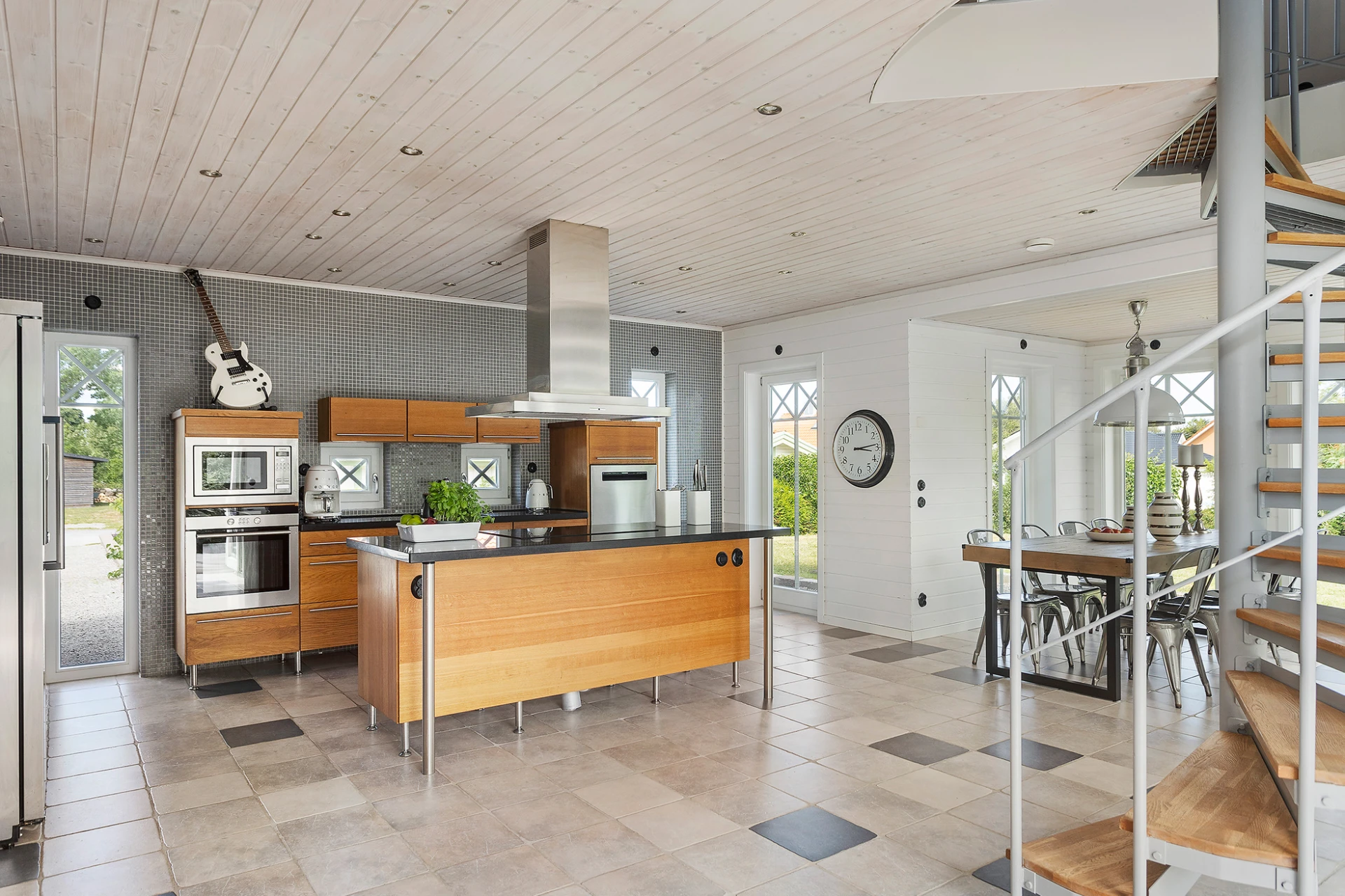 Golv: klinker. Väggar: mosaik, panel. Utrustning: köksö med induktionshäll, spisfläkt, varmluftsugn, mikrovågsugn, Side by Side(vatten och is), diskmaskin i arbetshöjd, bänkskivor i granit, kakel i mosaik, kök i ek.