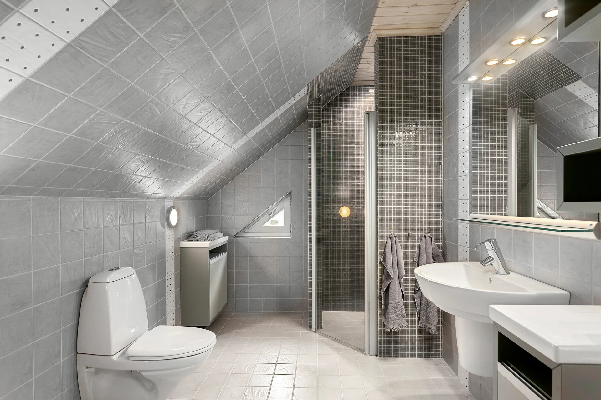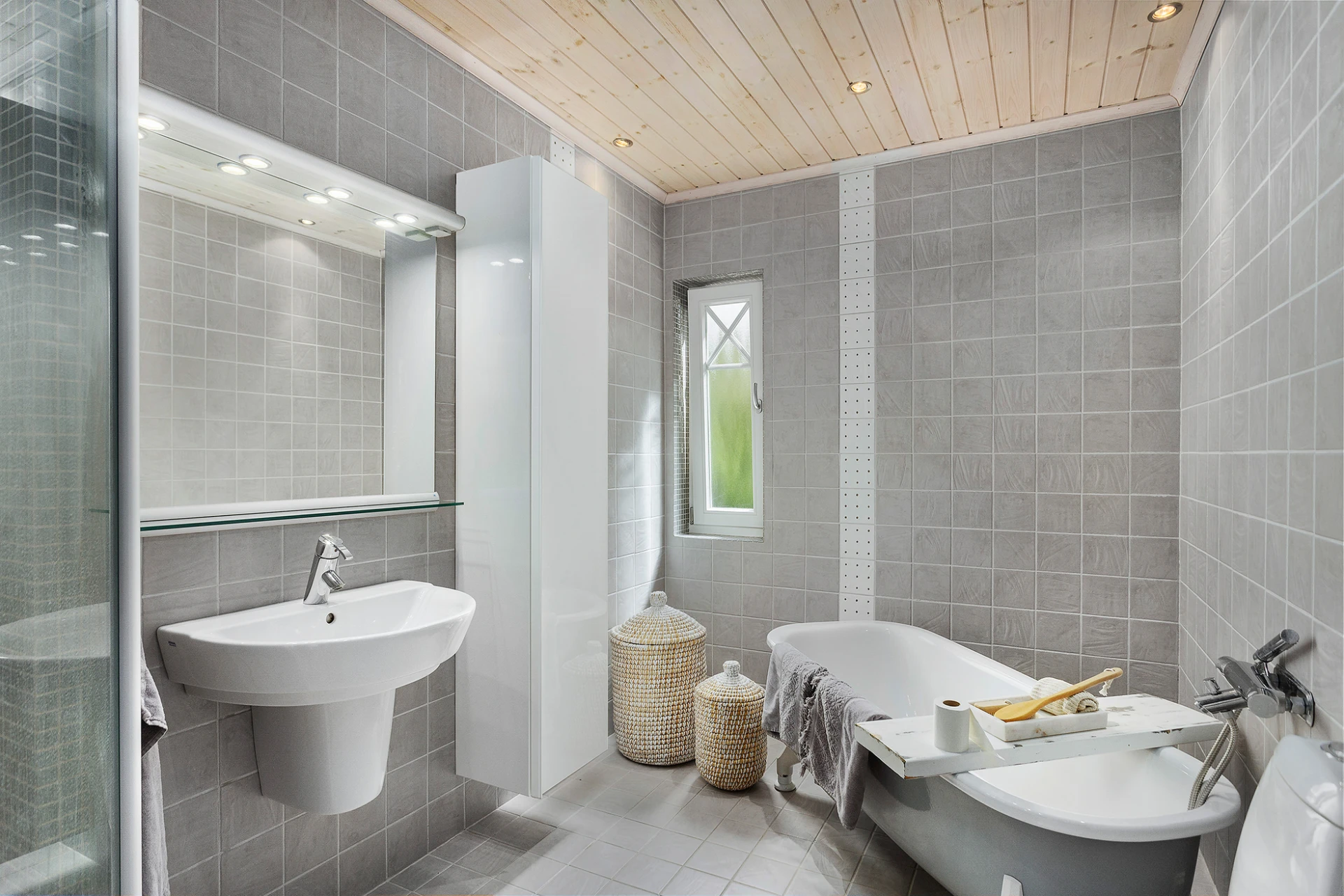 Golv: klinker. Väggar: kakel. Utrustning: vägghängd toalett, tvättställ, dusch, badkar, golvvärme, handdukstork. Förberett för bubbelbadkar.