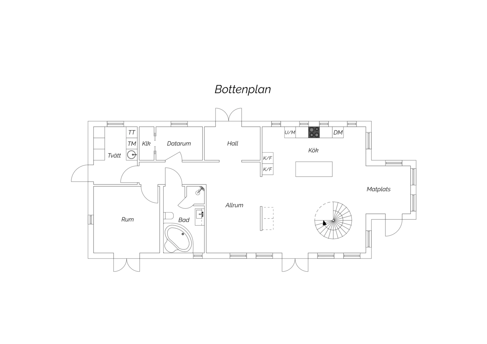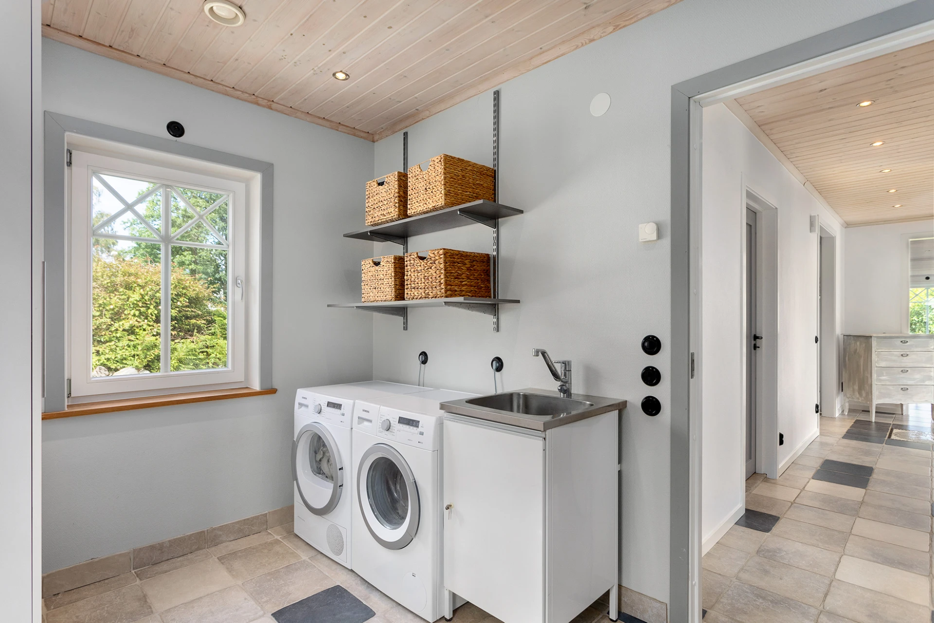 Golv: klinker. Väggar: kakel. Utrustning: tvättmaskin, torktumlare, tvättho, golvvärme, centraldammsugare.