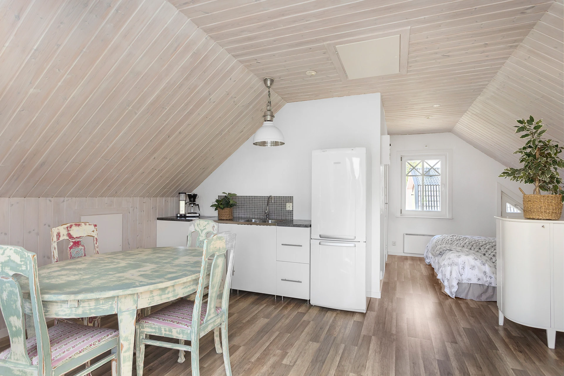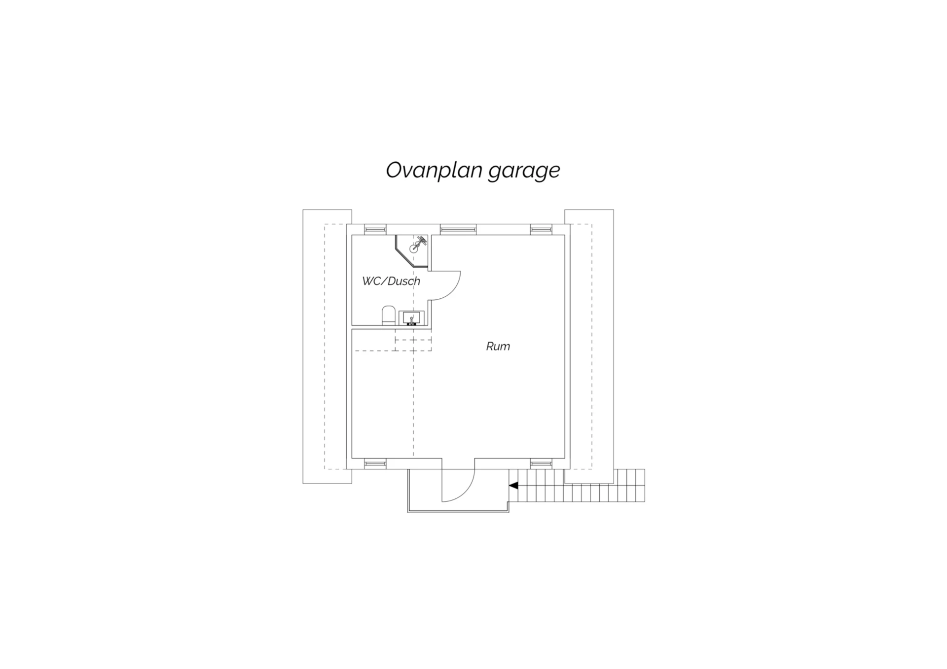 Fristående isolerat dubbelgarage med dubbla garageportar, ovanpå finns en lägenhet ca 30 kvm med allrum/sovrum med pentry och duschrum(ej färdigställt).