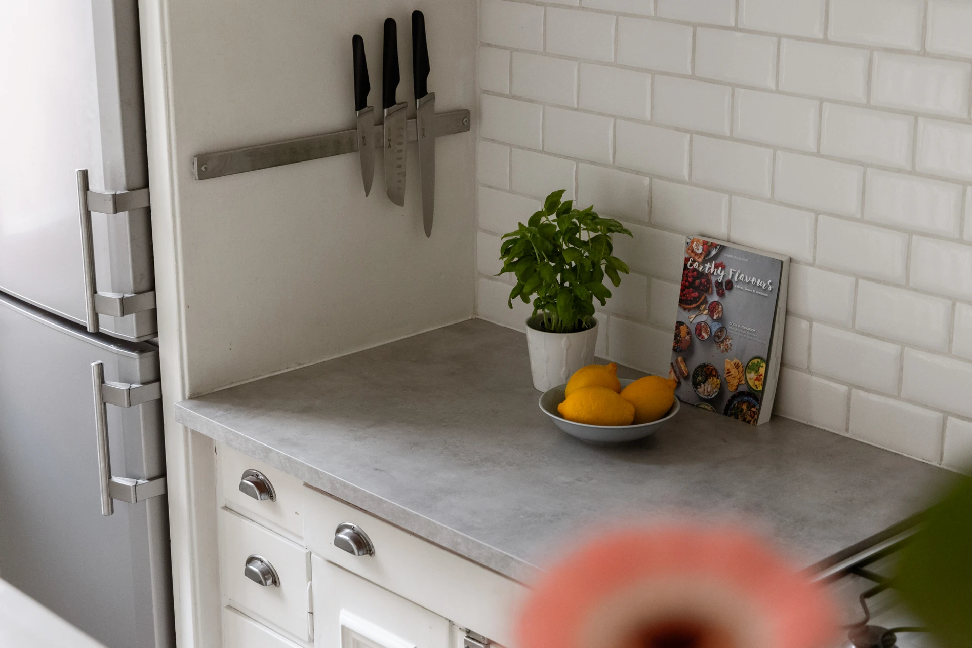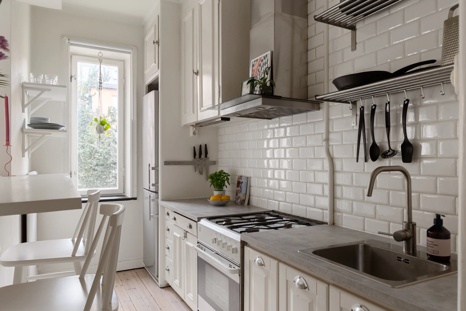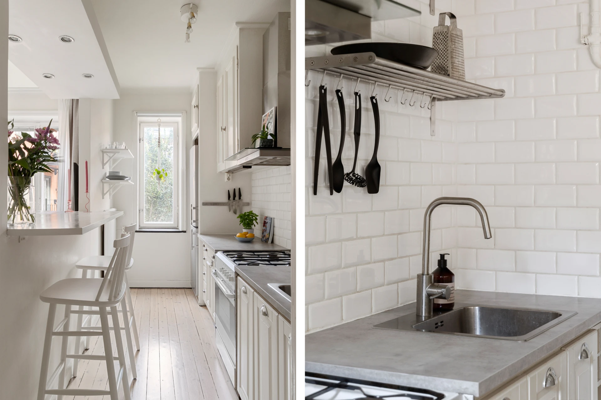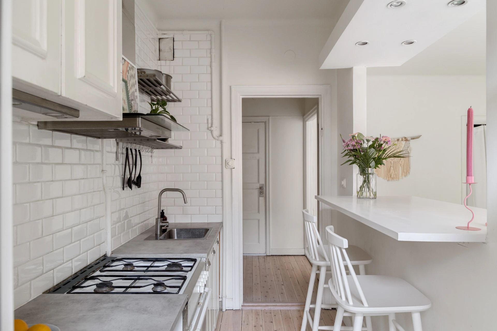 Trevligt kök med gott om förvaring bakom vita fronter. Utrustat med gasspis, diskho samt kyl och frys. Öppning mellan vardagsrum och kök skapar social och perfekt yta att äta vid eller att sitta och umgås vid.