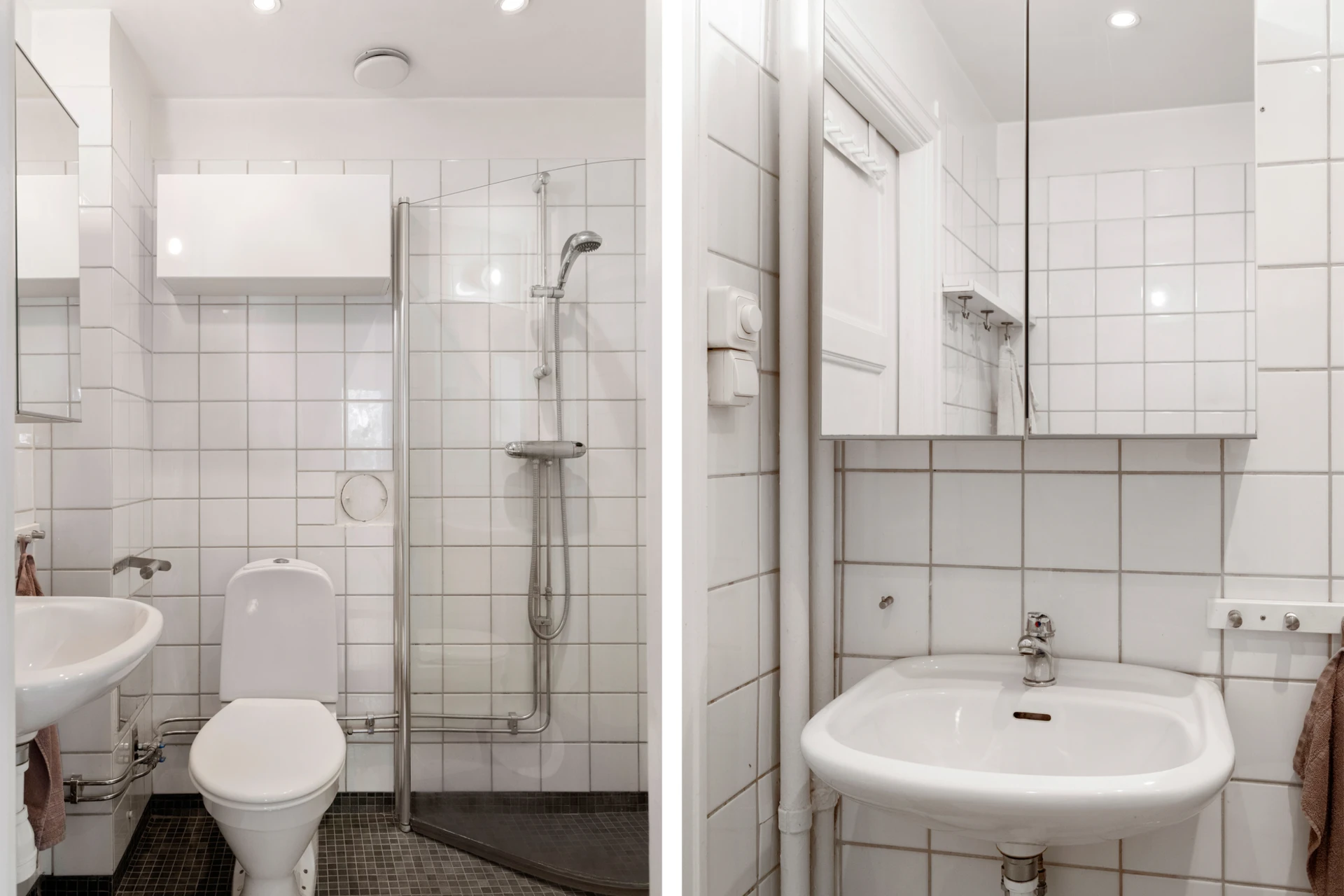 Kaklat badrum med vita kakelplattor på väggarna och grått klinker på golv. Utrustat med dusch, två förvaringsskåp, handfat och WC.