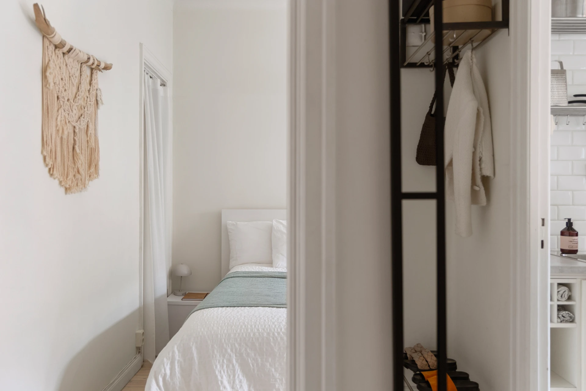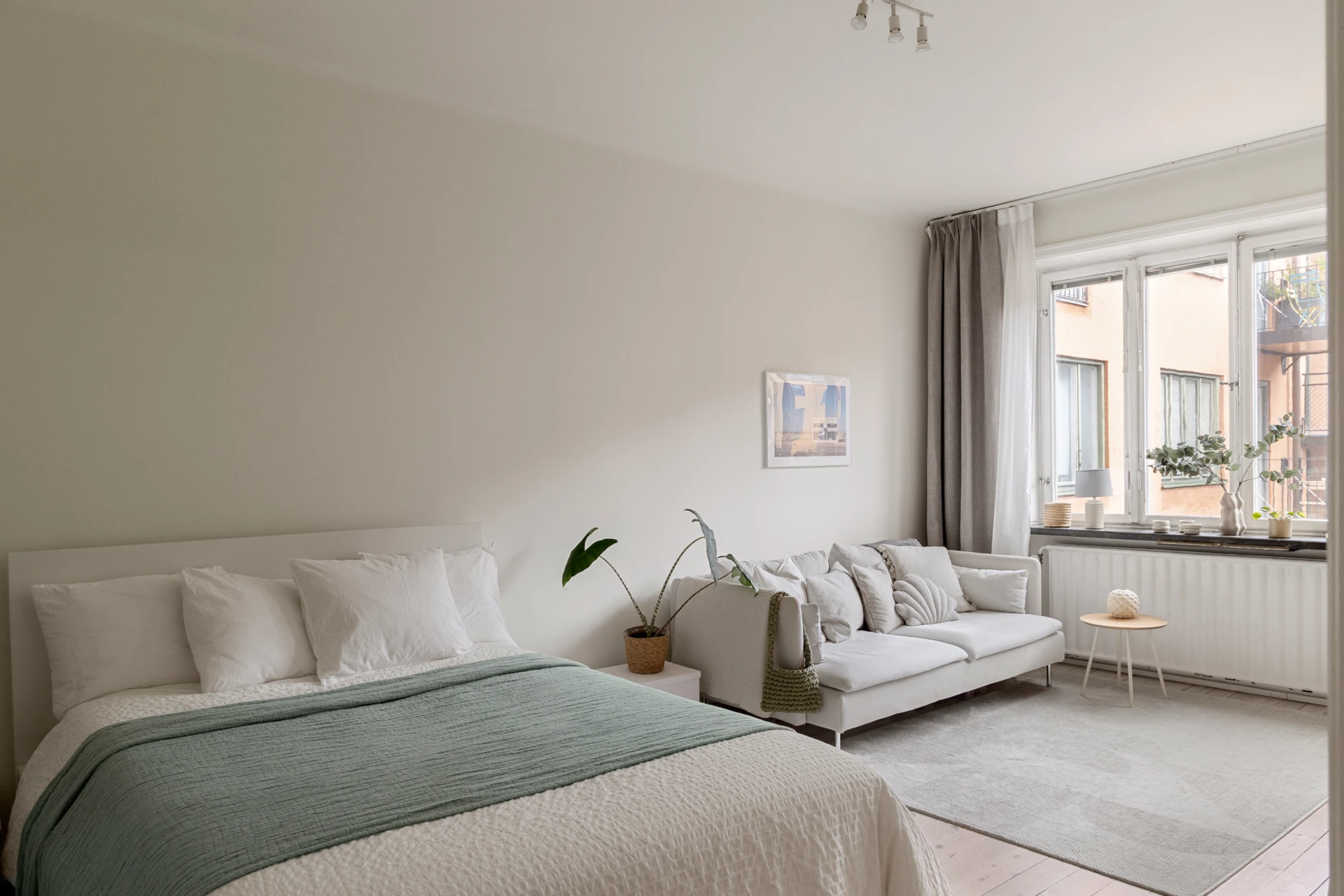 Generöst fönster som ger rummet ett vackert ljusinsläpp. Enkelt att möblera med soffgrupp säng och förvaringsmöbel. Ljusa väggar och vitlaserade furugolv. Gott om förvaring i platsbyggd garderob.