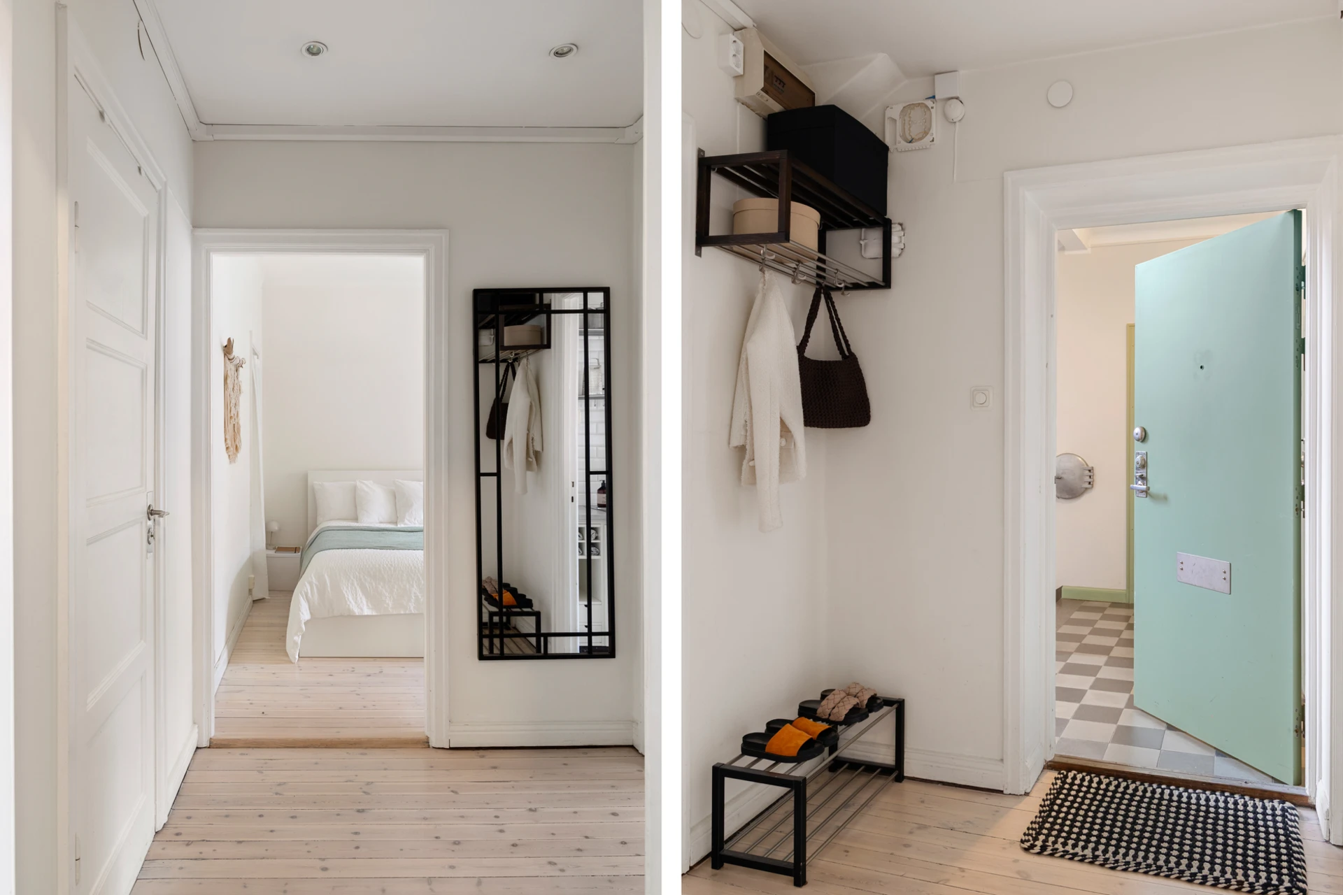 Välkomnande hall vitlaserat furugolv, vitmålade väggar och spotlights i tak. Plats för avhängning av ytterkläder och plats för skor.