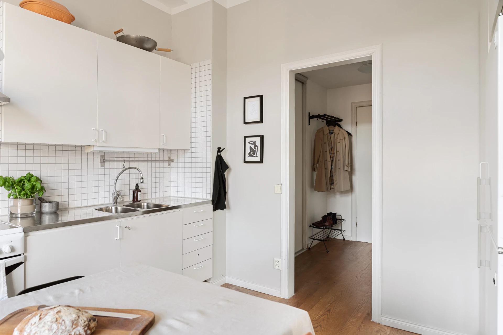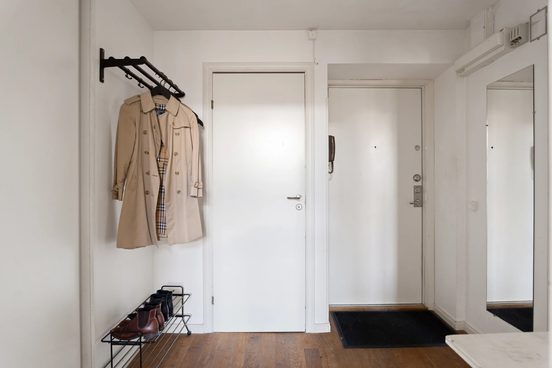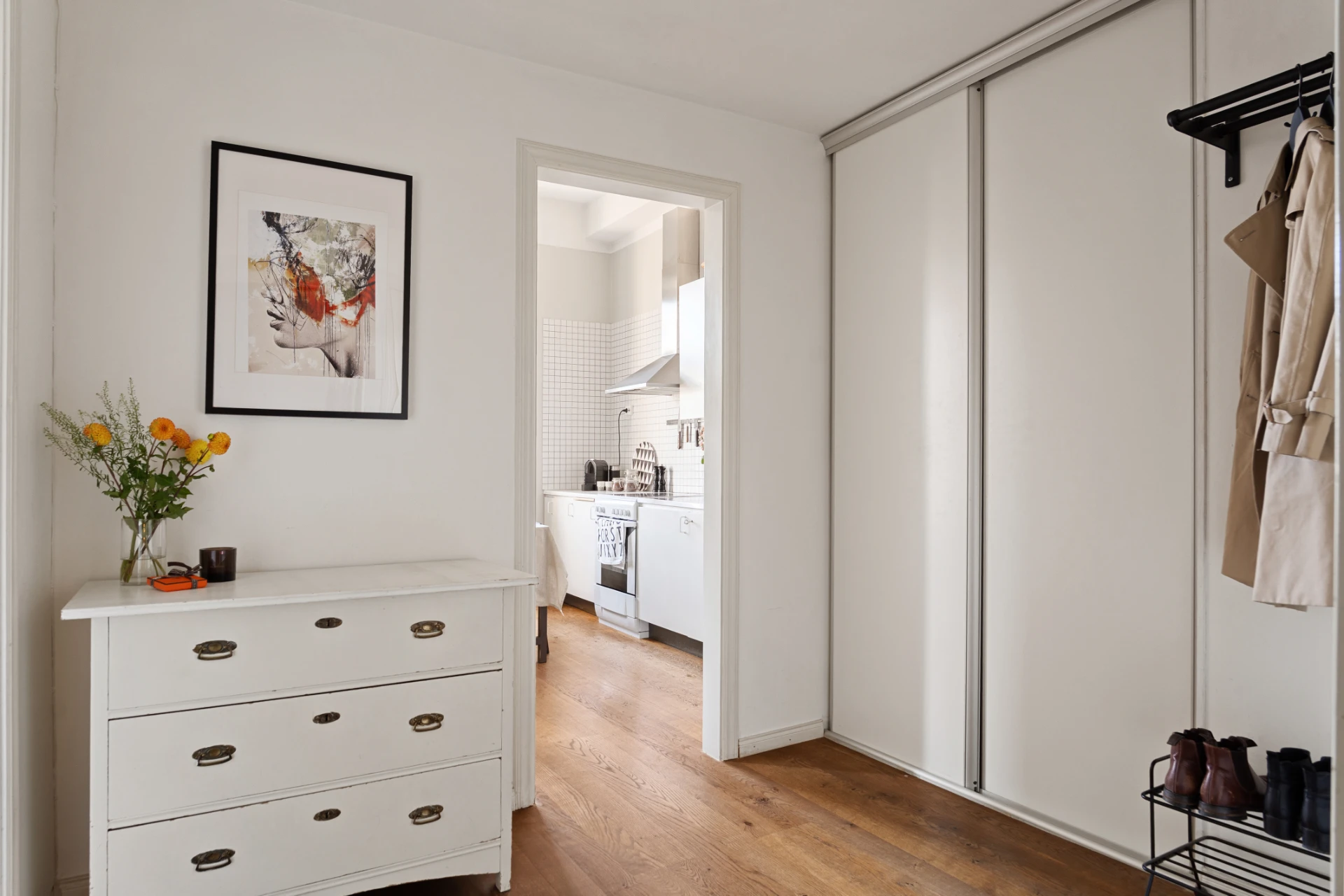 Ekparkett och ljust målade väggar. Plats för avhängning samt förvaring i skjutdörrsgarderob.