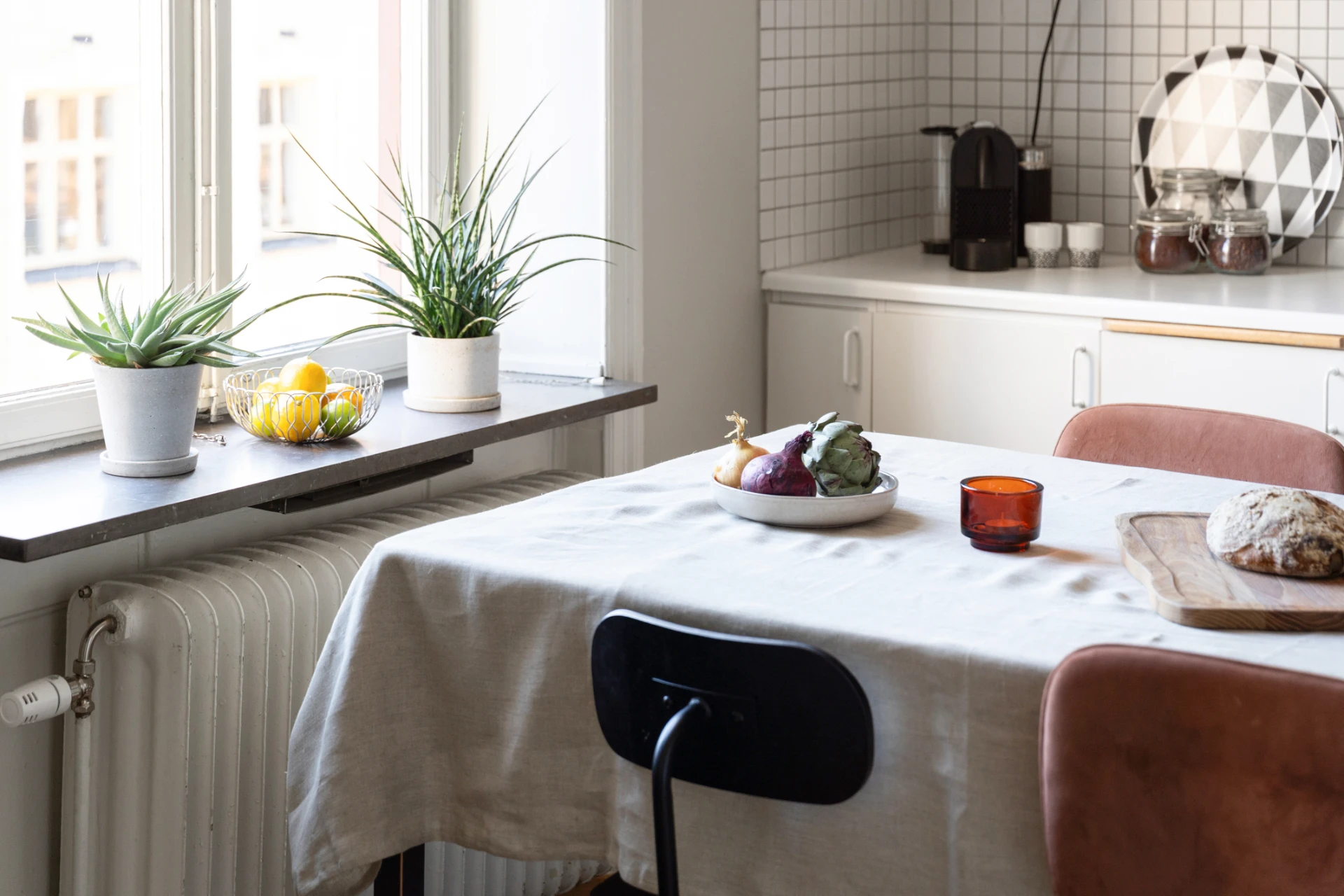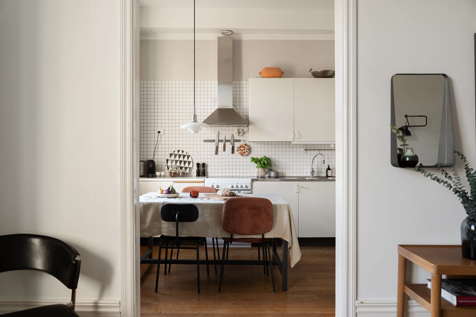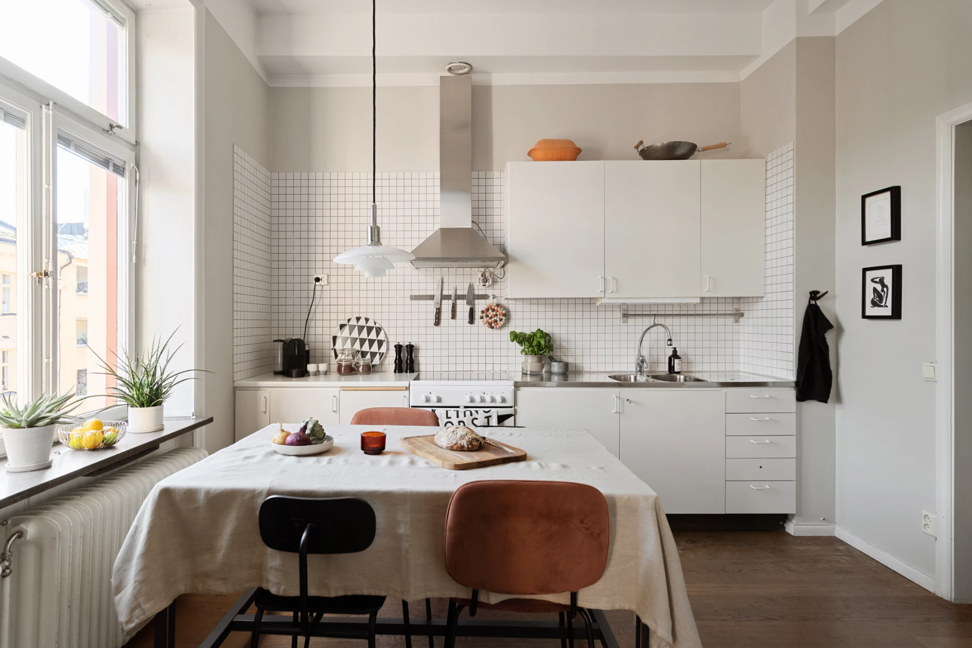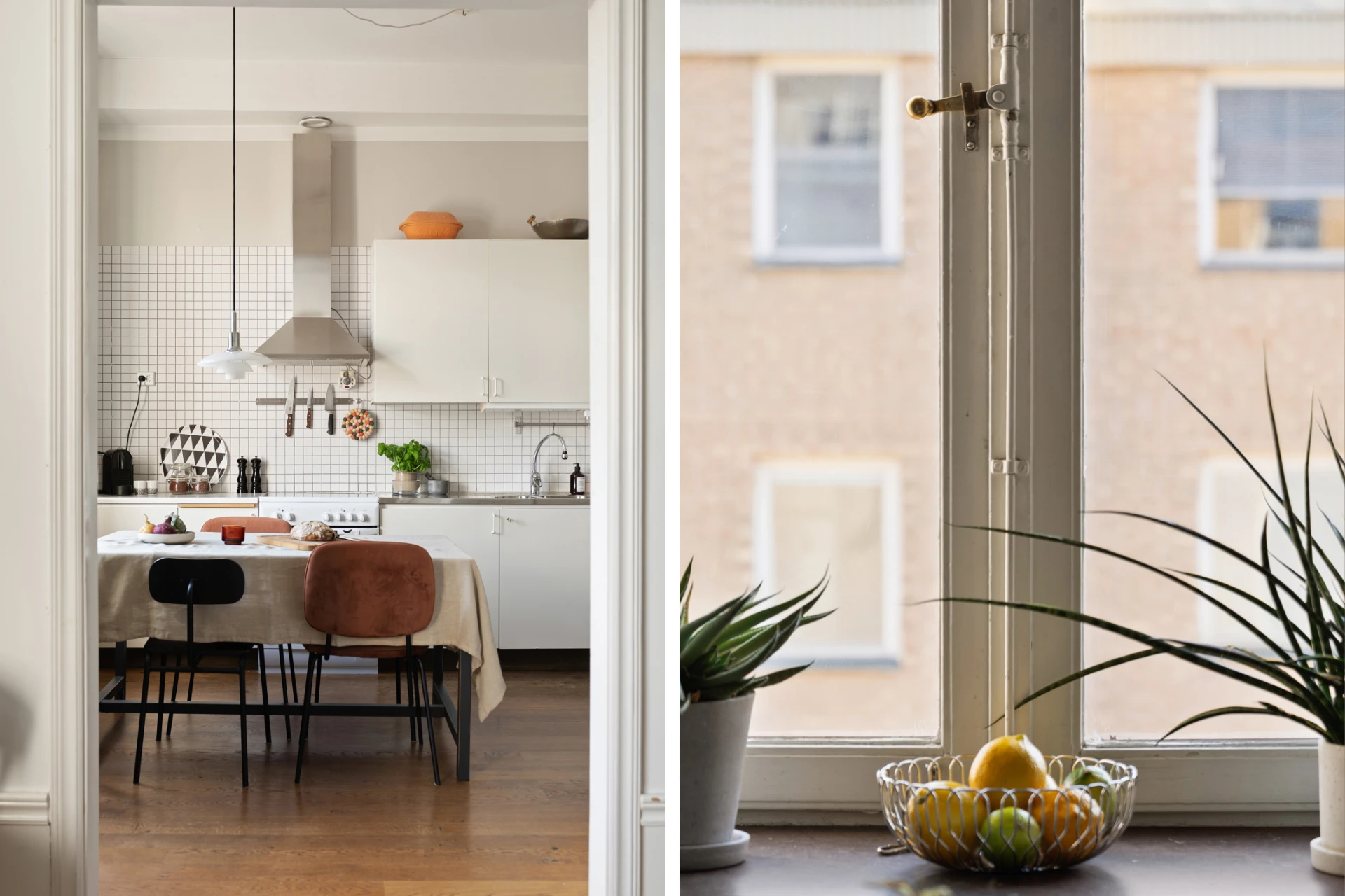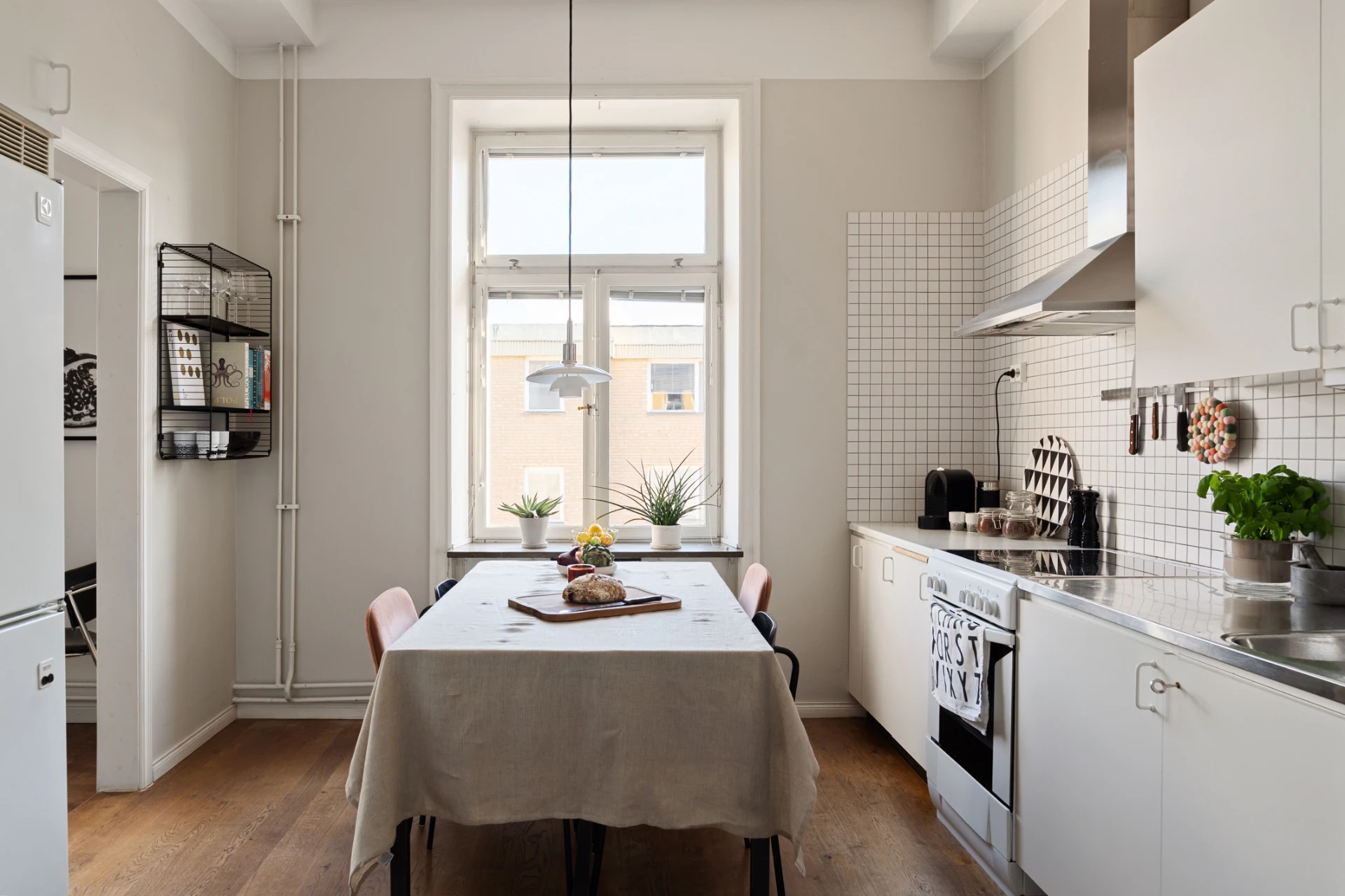 Ekparkett och ljusa väggar. Köksinredning i vitt med vitt kakel ovan arbetsytorna. Köket är utrustat med spis, ugn, fläkt, diskho samt kombinerad kyl/frys. Matplats för minst fyra personer. Ett dubbelfönster förser rummet med ett vackert ljusinsläpp.
