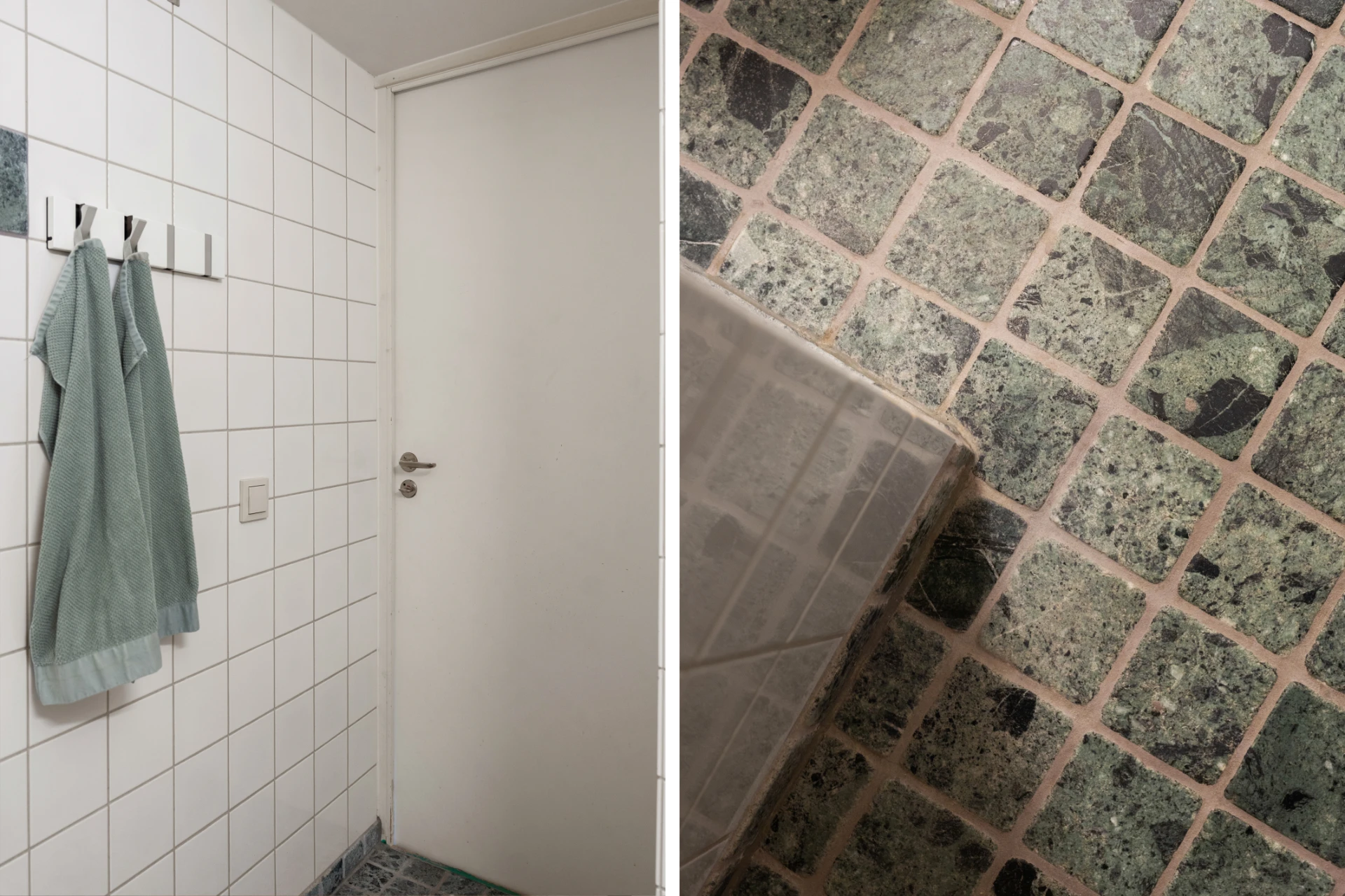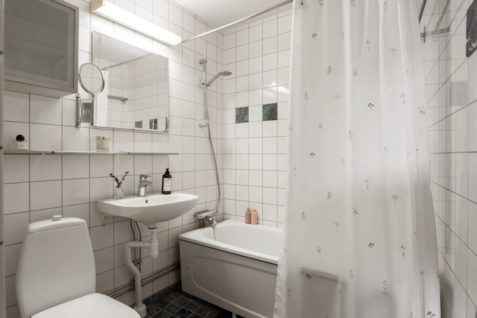 Golv klätt i grön marmor och helkaklade vita väggar. Badrummet är inrett med WC, handfat samt badkar. Förberett för tvättmaskin.