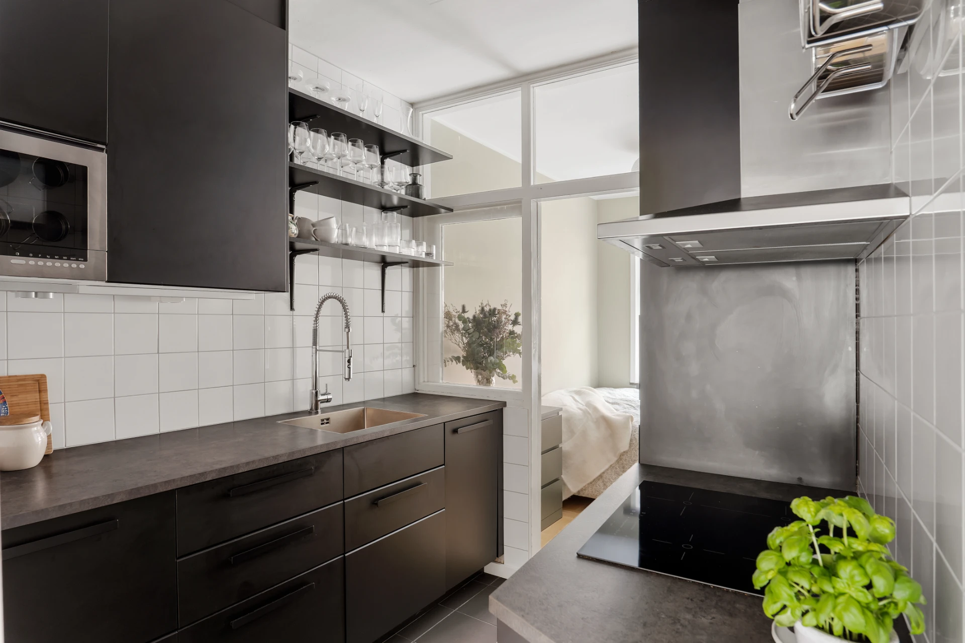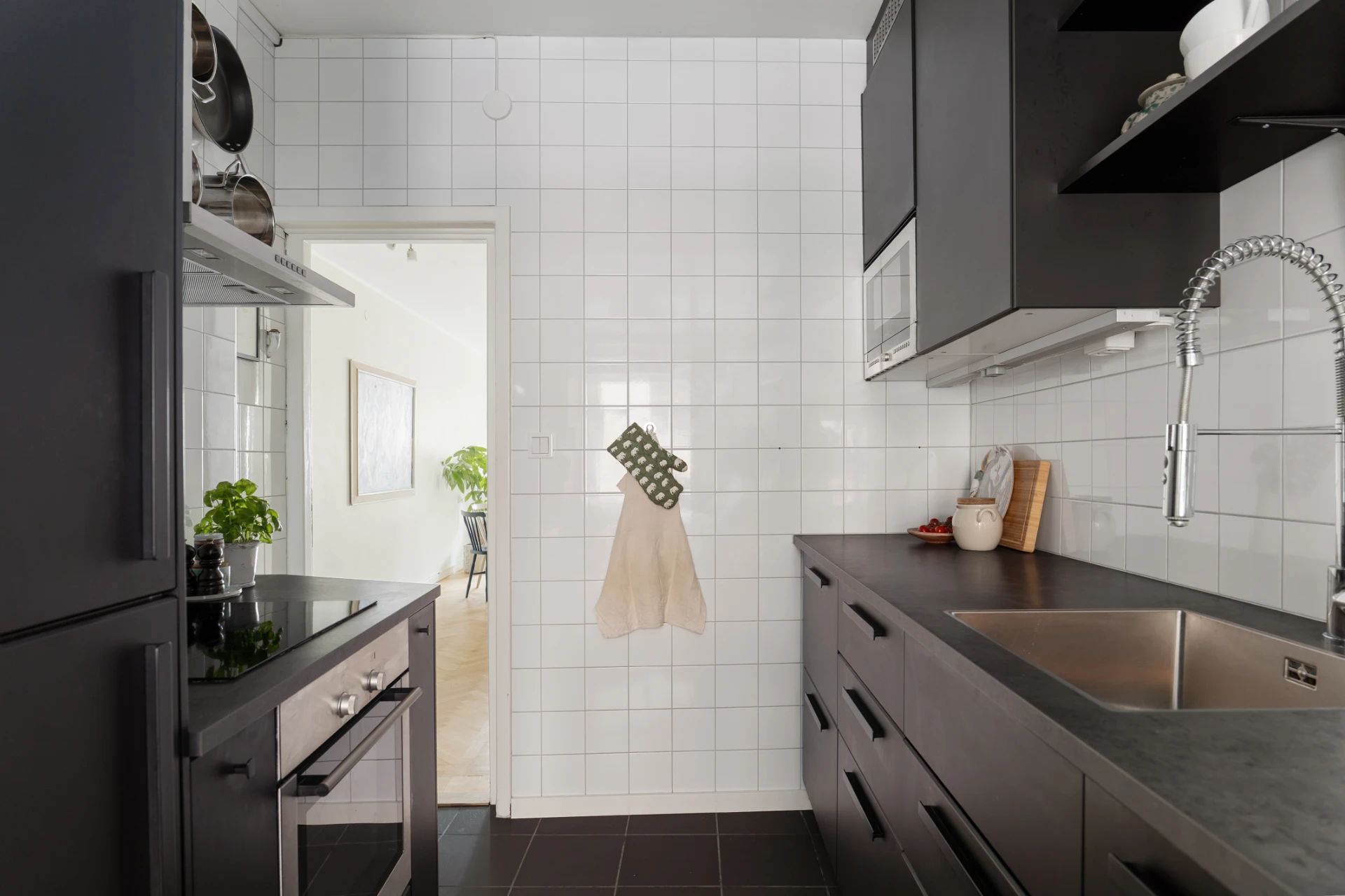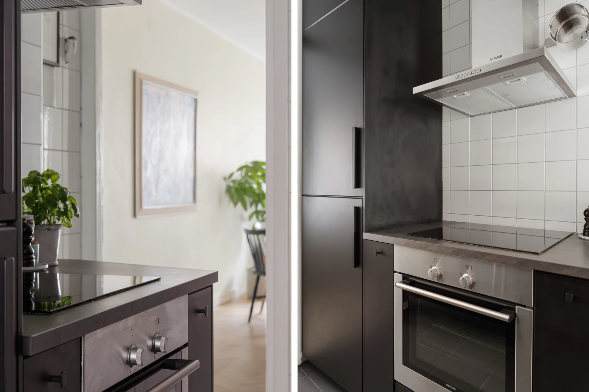 Klinkergolv, kaklade väggar, bänkskiva i laminat och svarta skåpsluckor. Köket är utrustat med integrerad kyl/frys samt diskmaskin, häll, ugn, inbyggd micro och diskho.