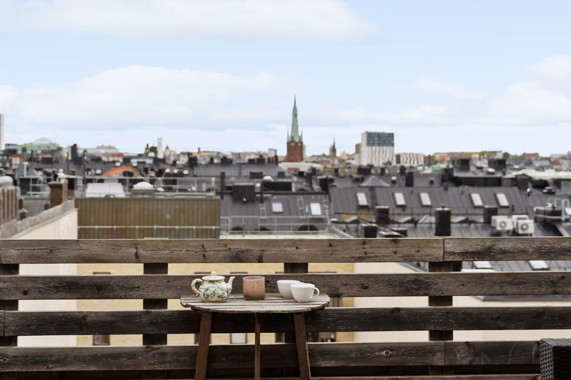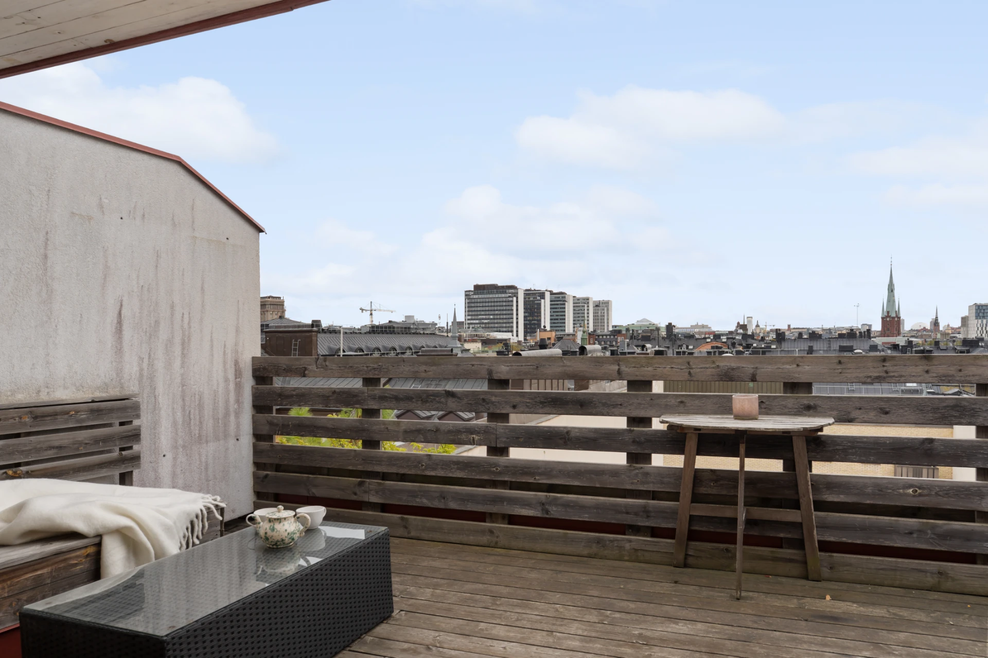 Innergård med trädäck och även en gemensam solig takterrass med utsikt över city.