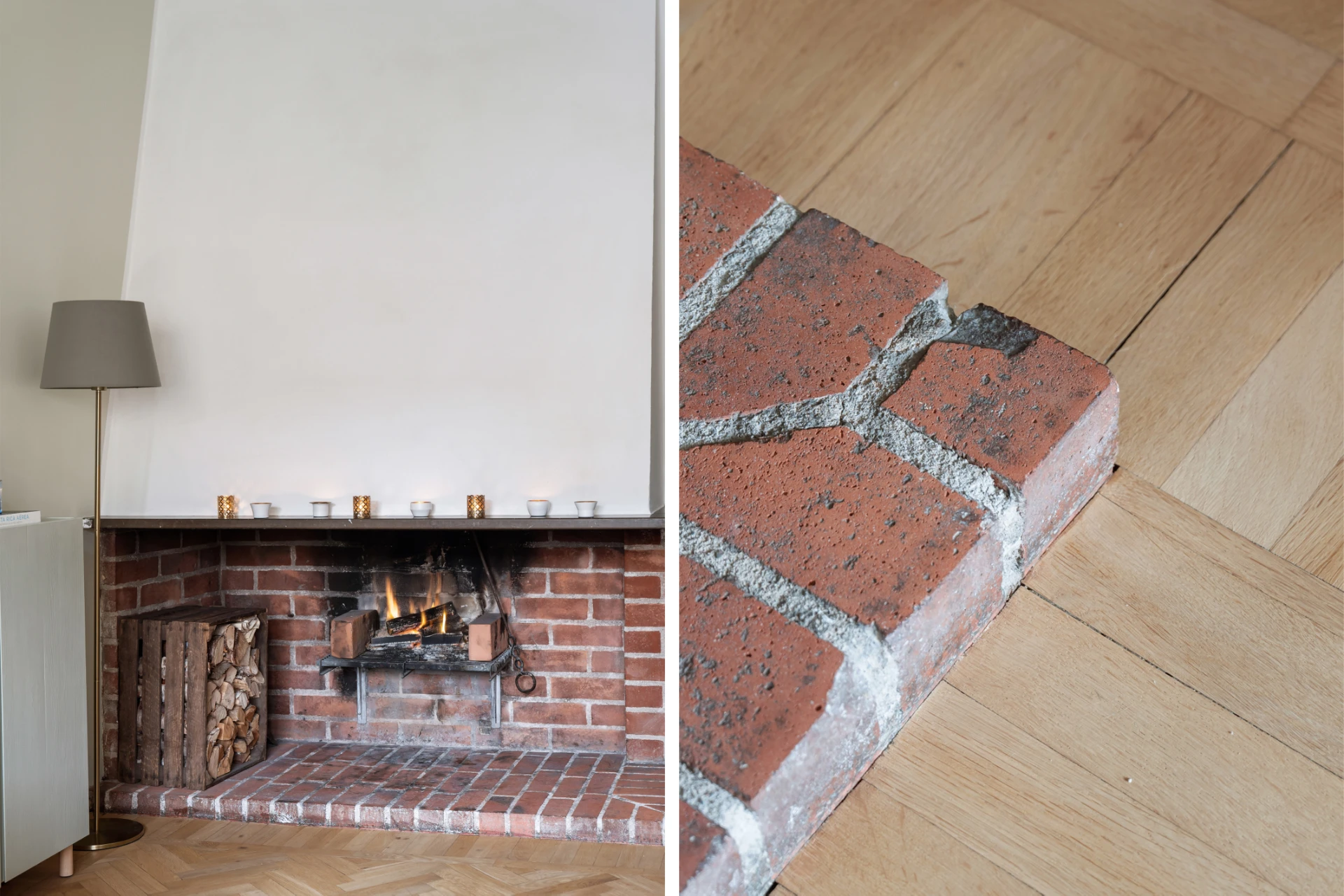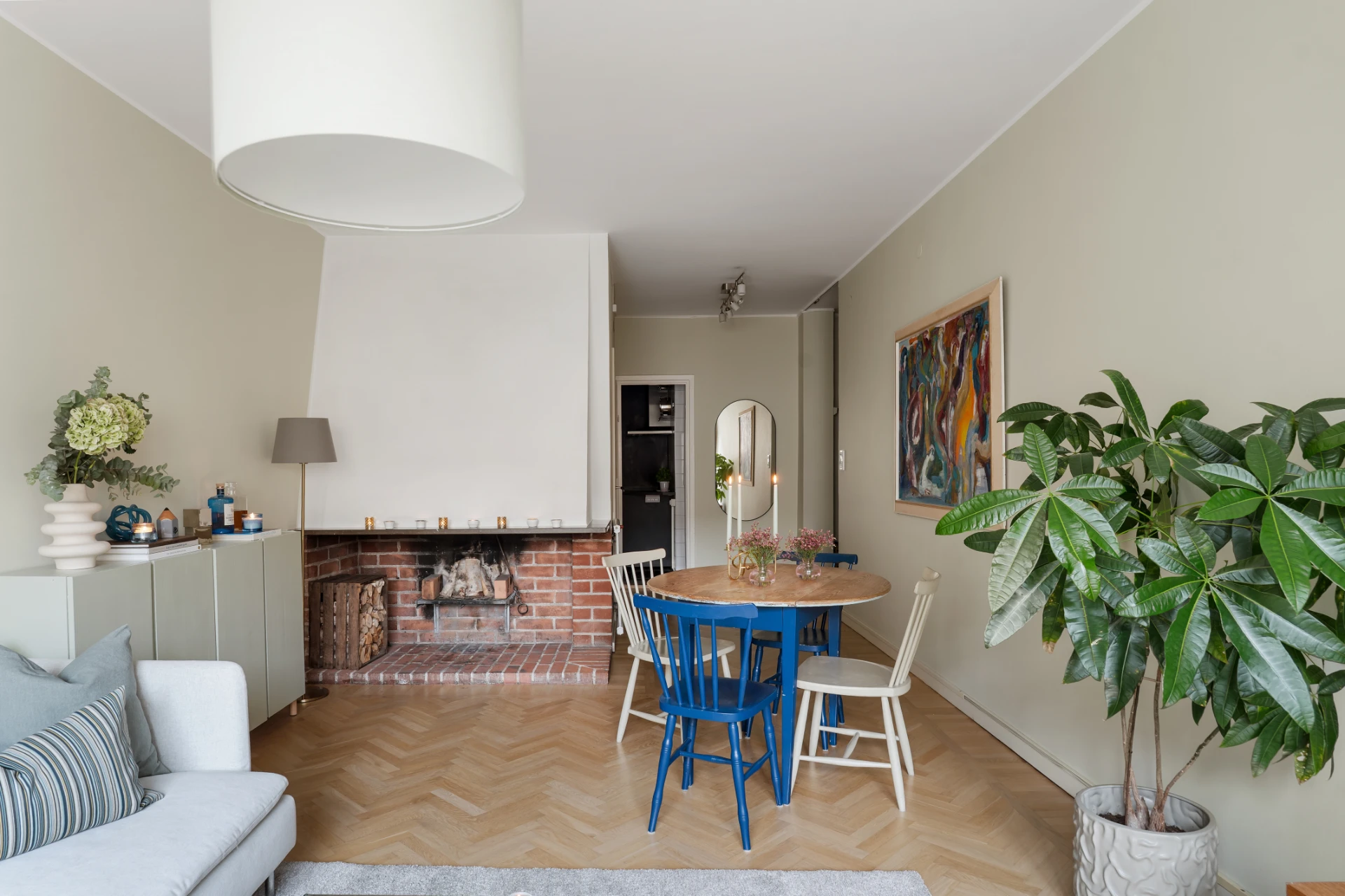 Målade väggar och vacker fiskbensparkett. Öppen spis och utgång till bostadens balkong.