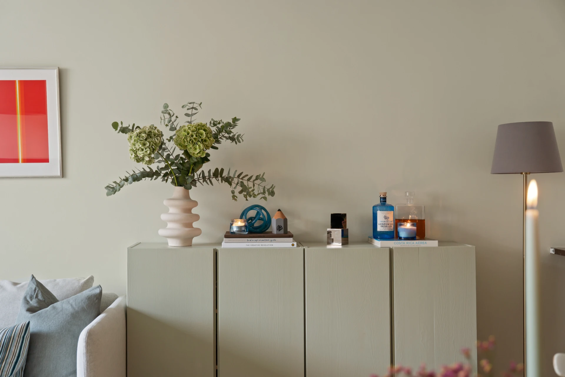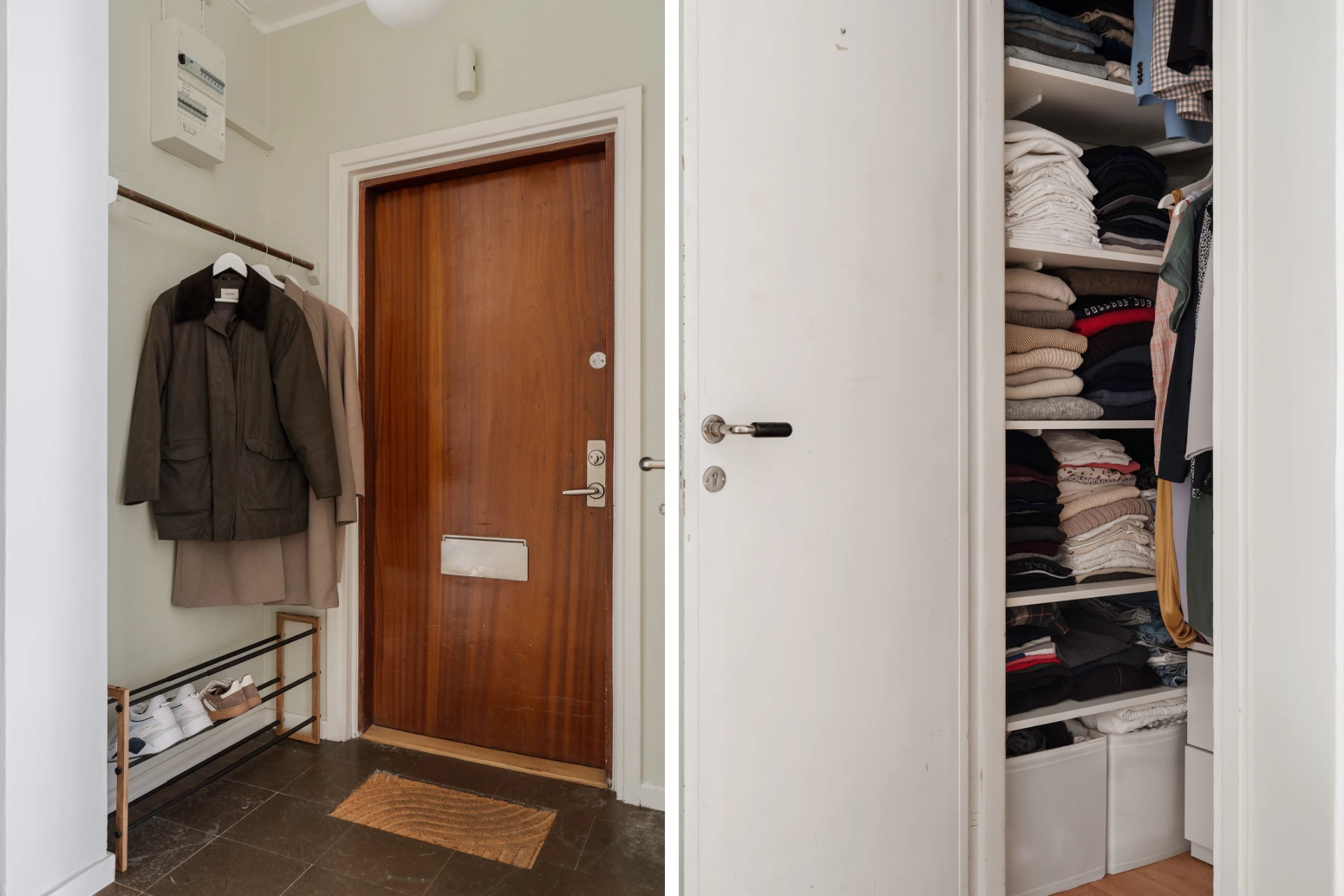Fint stengolv och målade väggar. Förvaring i form av klädkammare.