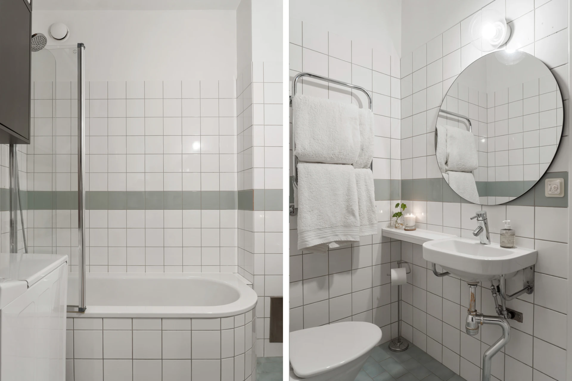 Helkaklat badrum med tvättmaskin, badkar, wc, handfat samt handdukstork.
