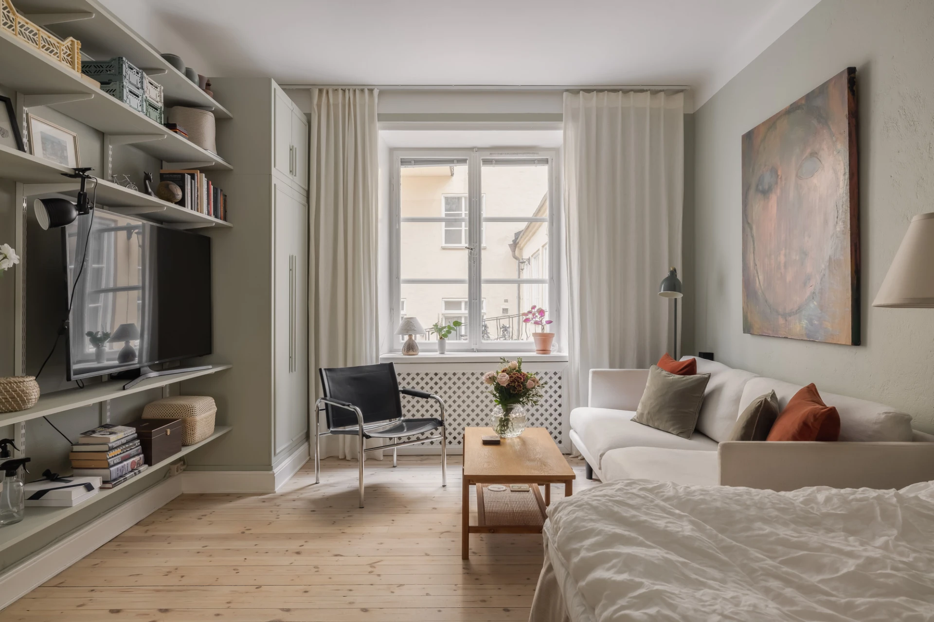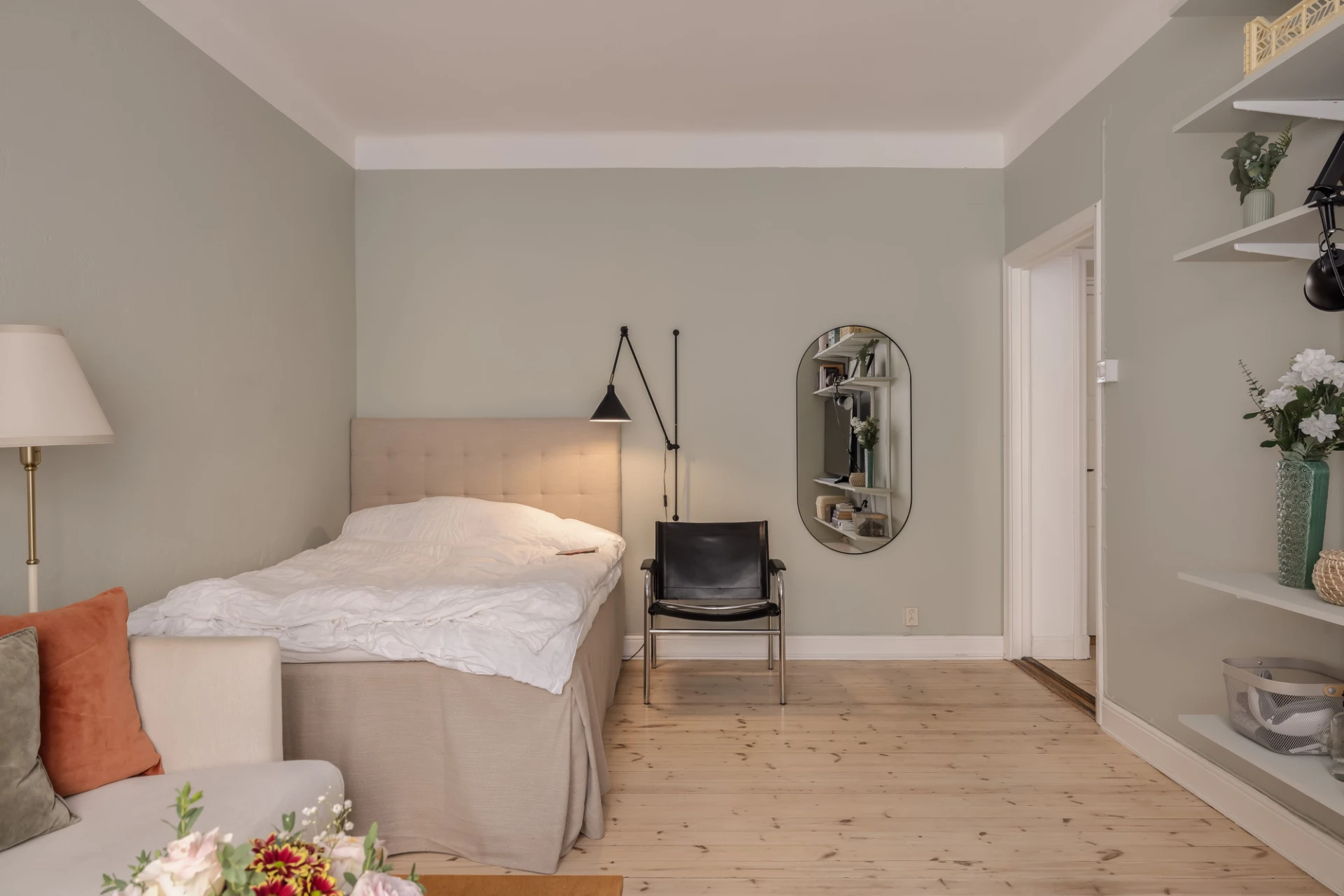 Ett rum med rymd, ljust trägolv, målade väggar i en grön fin nyans, platsbyggd garderob och hyllsystem. Stort fönster som släpper in ljus, plats för både soffa och säng.