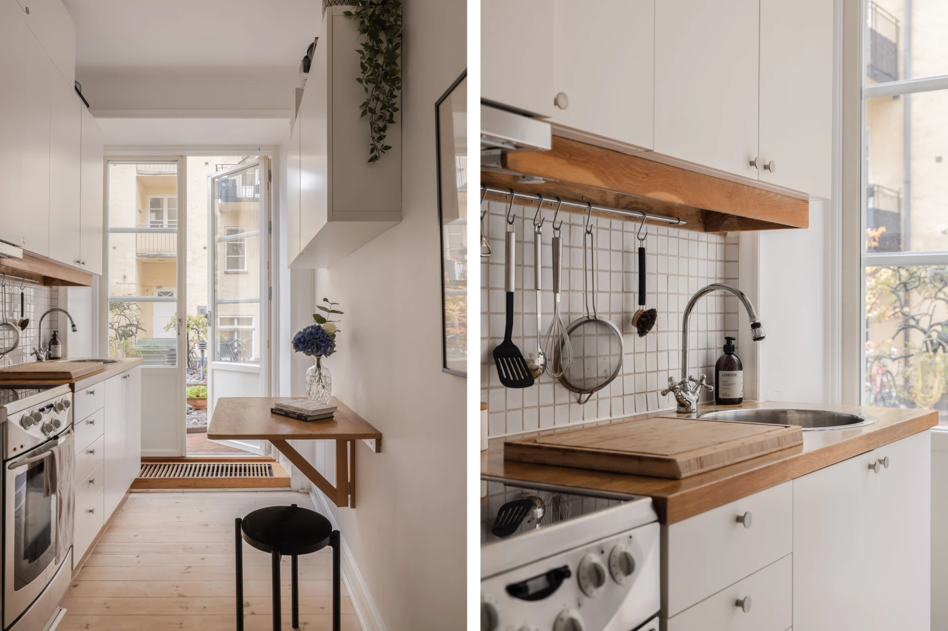Kök med utgång till innergården, ljust trägolv, vita väggar, stilrena vita skåpsluckor och bänkskiva i trä. Idag finns ett smidigt vägghängt bord som man kan fälla ned om man önskar mer plats, över bordet finns också skåp uppsatta för extra förvaring. Köket är utrustat med kyl/frys, spis med ugn, diskho och bänkdiskmaskin installerad under bänken.