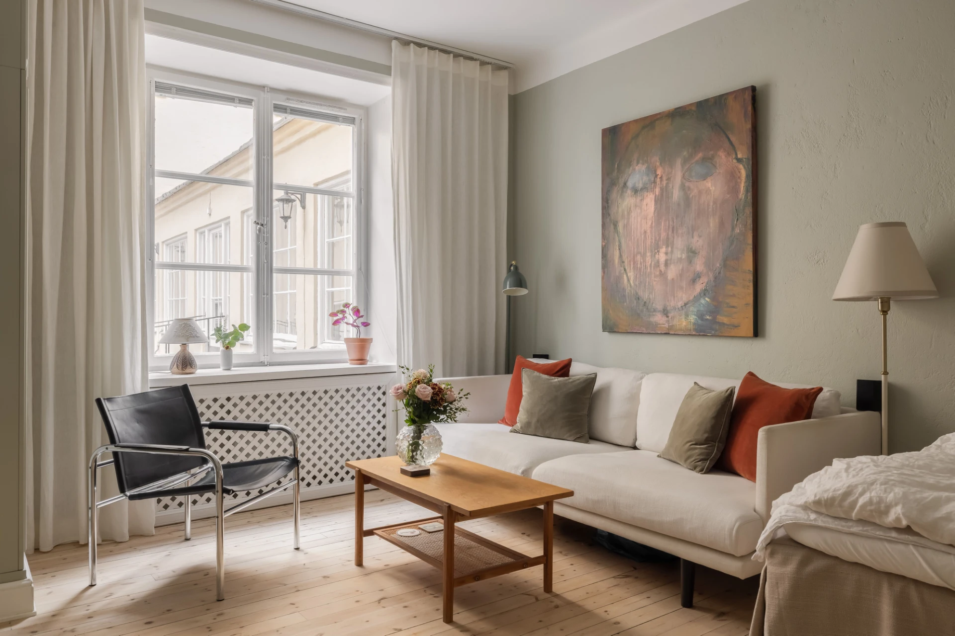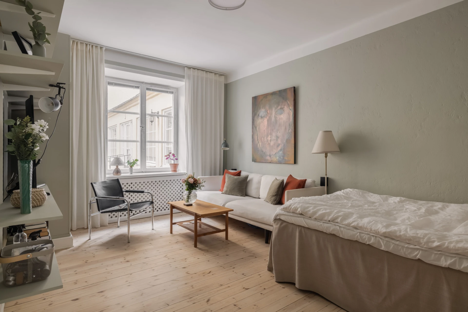 Optimalt belägen 20-talspärla invid Sankt Eriksplan med låg avgift i välskött förening. Charmig bostad som stoltserar med smakfull interiör, vackra trägolv, tilltalande takhöjd, djupa fönsternischer och fint ljusinsläpp. Du kliver in i en välkomnade hall där förvaring finns i form av en klädkammare, vidare in i köket har du egen utgång mot den färggranna gården (det finns ingen del av innergården som tillhör lägenheten), i det stora rummet finns gott om plats för både soffa och säng, stilren platsbyggd garderob som smälter in bra i rummet.