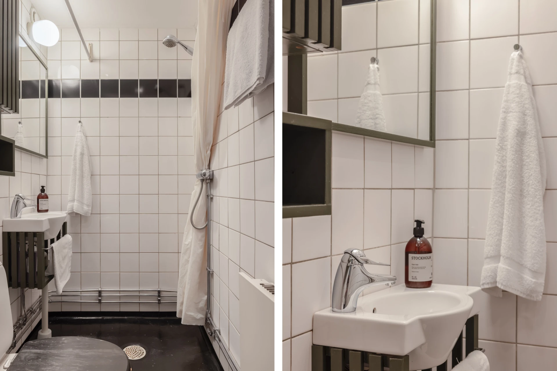 Svart golv och kaklade vita väggar. Badrummet är utrustat med dusch, handdukstork, WC, kommod med spegel ovan och vägghängt skåp för förvaring.