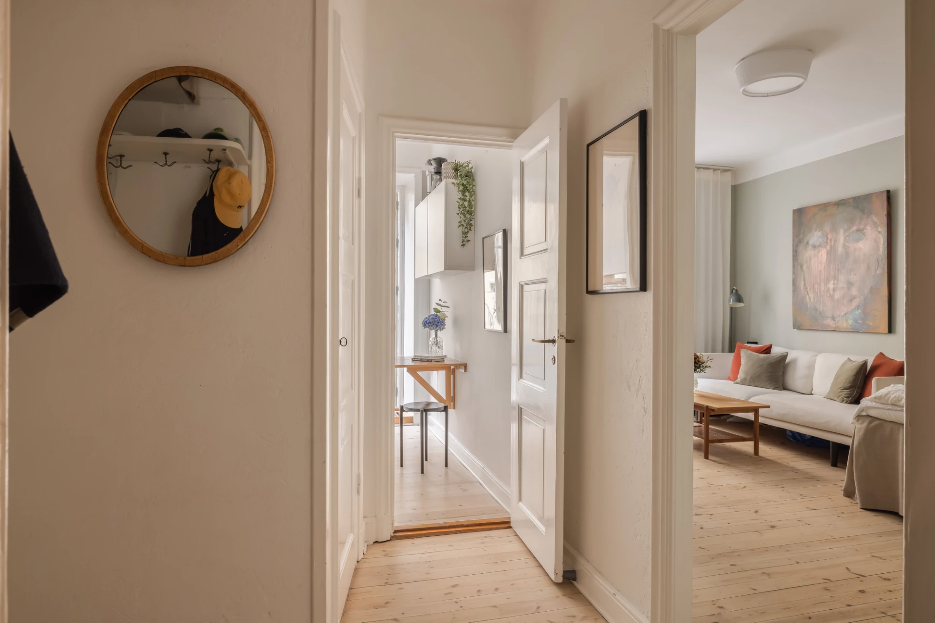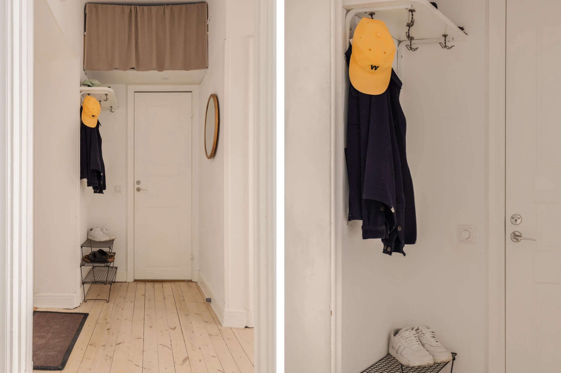 Välkomnande hall med säkerhetsdörr, ljust trägolv och vita väggar, förvaring i form av klädkammare. Från hallen nås bostadens badrum.