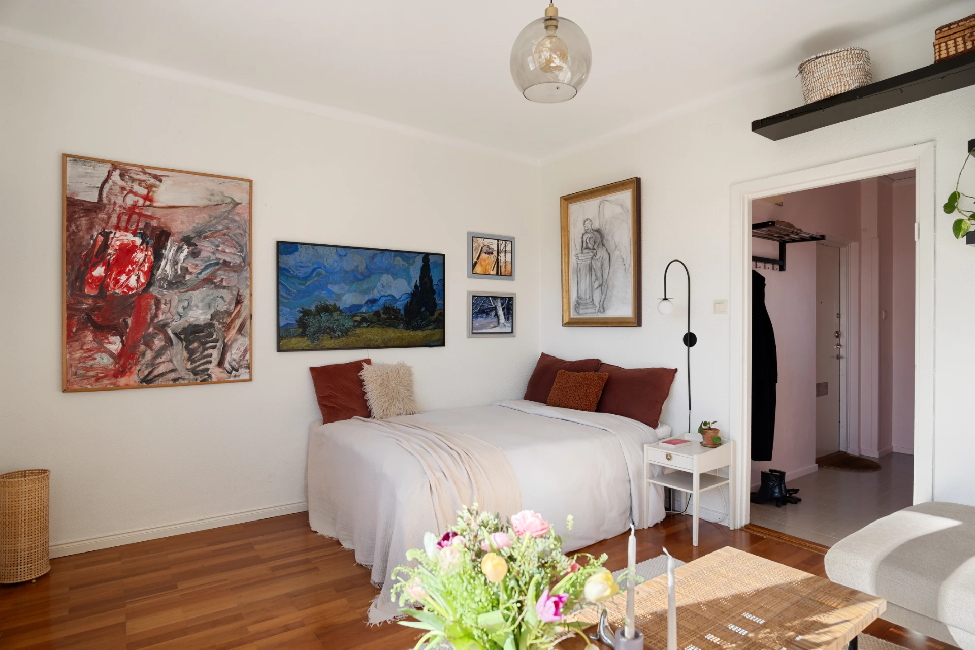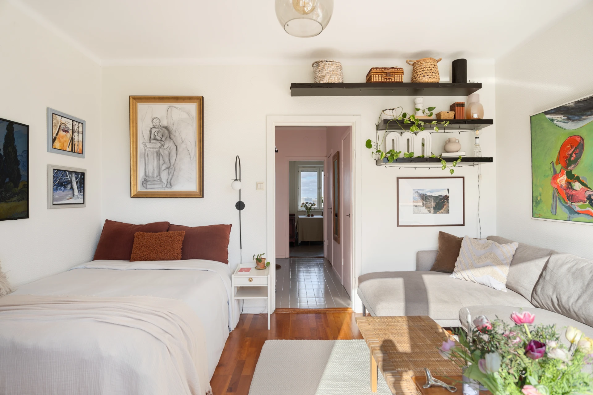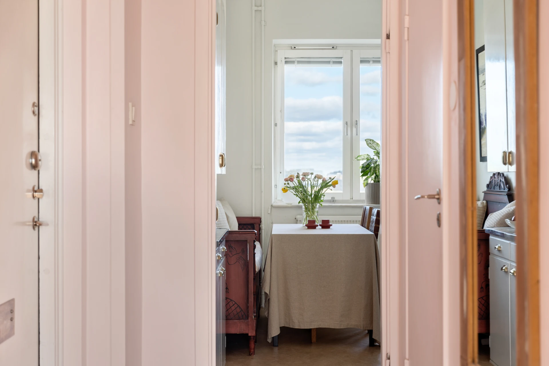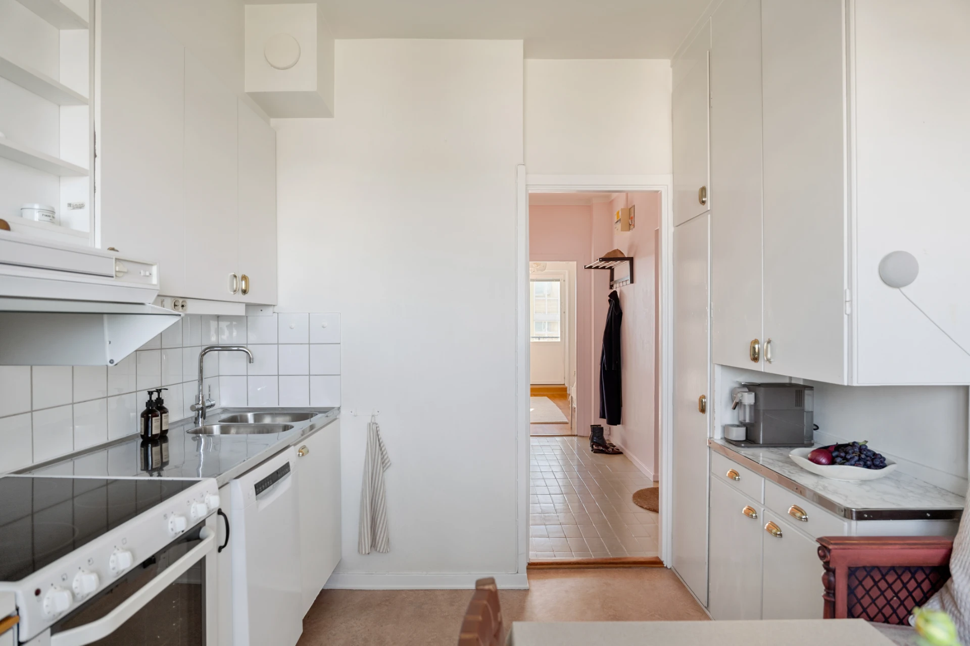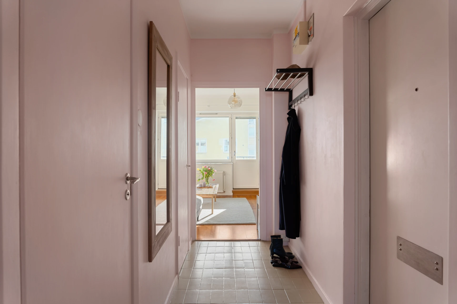 Hallen välkomnar dig med en vacker rosa nyans på väggarna, klinkergolv samt goda avhängningsmöjligheter för ytterkläder och skor. Här finns även en rymlig klädkammare som ger generös förvaring och håller hemmet stilrent och organiserat. Det ljusa och luftiga allrummet har en naturlig rymd tack vare det stora fönstret och den öppna planlösningen. Här får du plats med både soffa, soffbord och säng utan att kompromissa med känslan av rymd. Från rummet når du balkongen, som blir en härlig förlängning av bostaden med sol under dagens bästa timmar. Köket är klassiskt och tidlöst med vita skåpluckor, bra arbetsytor och gott om förvaring. Den öppna planlösningen gör det lätt att umgås medan du lagar mat, och matplatsen rymmer enkelt fyra personer – perfekt för både vardagsmiddagar och sociala tillställningar. Badrummet är nyrenoverat i stilrena grå toner och erbjuder en modern atmosfär med smakfulla detaljer. Här finns WC, handfat med kommod och spegel samt en rymlig dusch med svarta detaljer och infällbara glasväggar – en perfekt kombination av elegans och funktion.