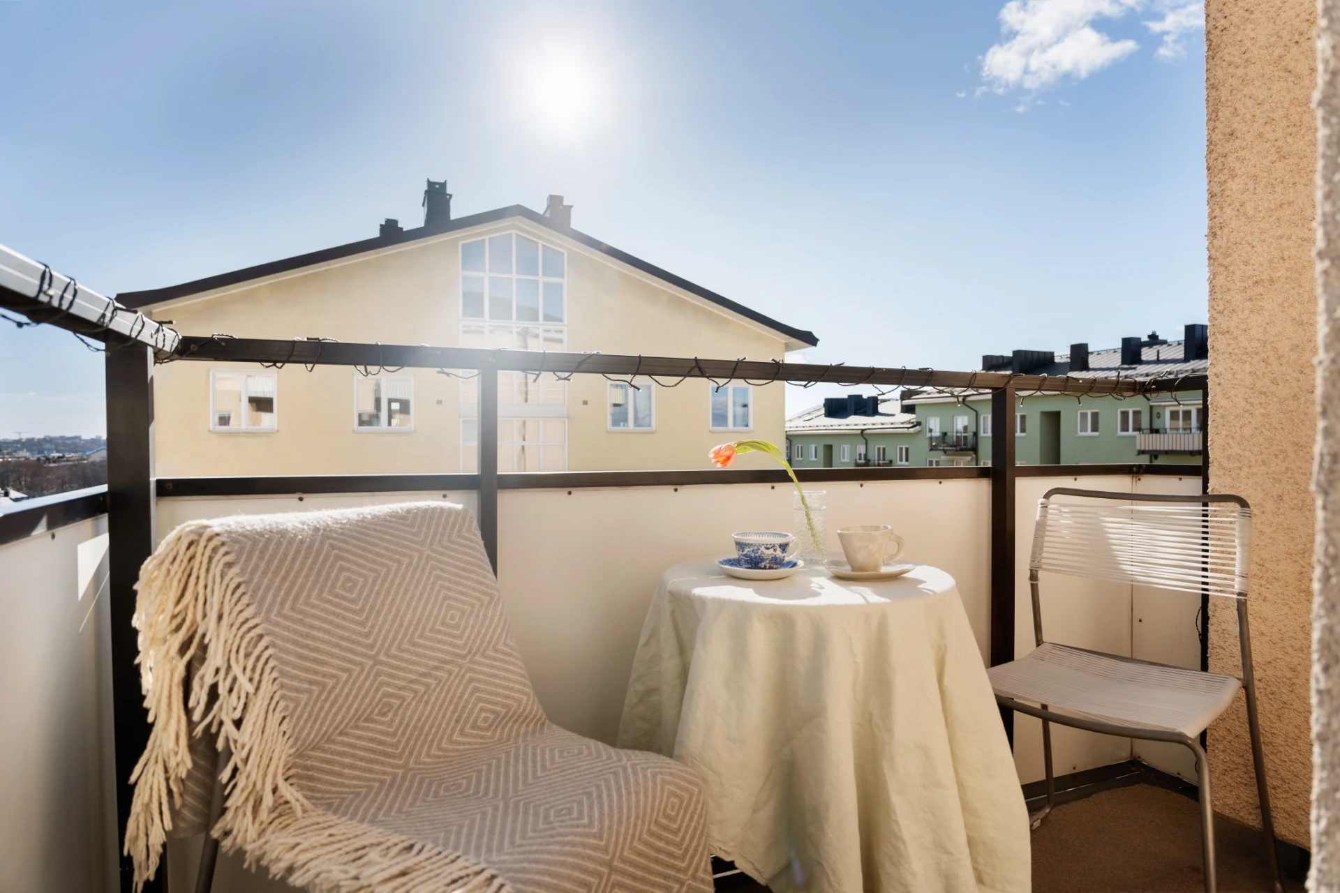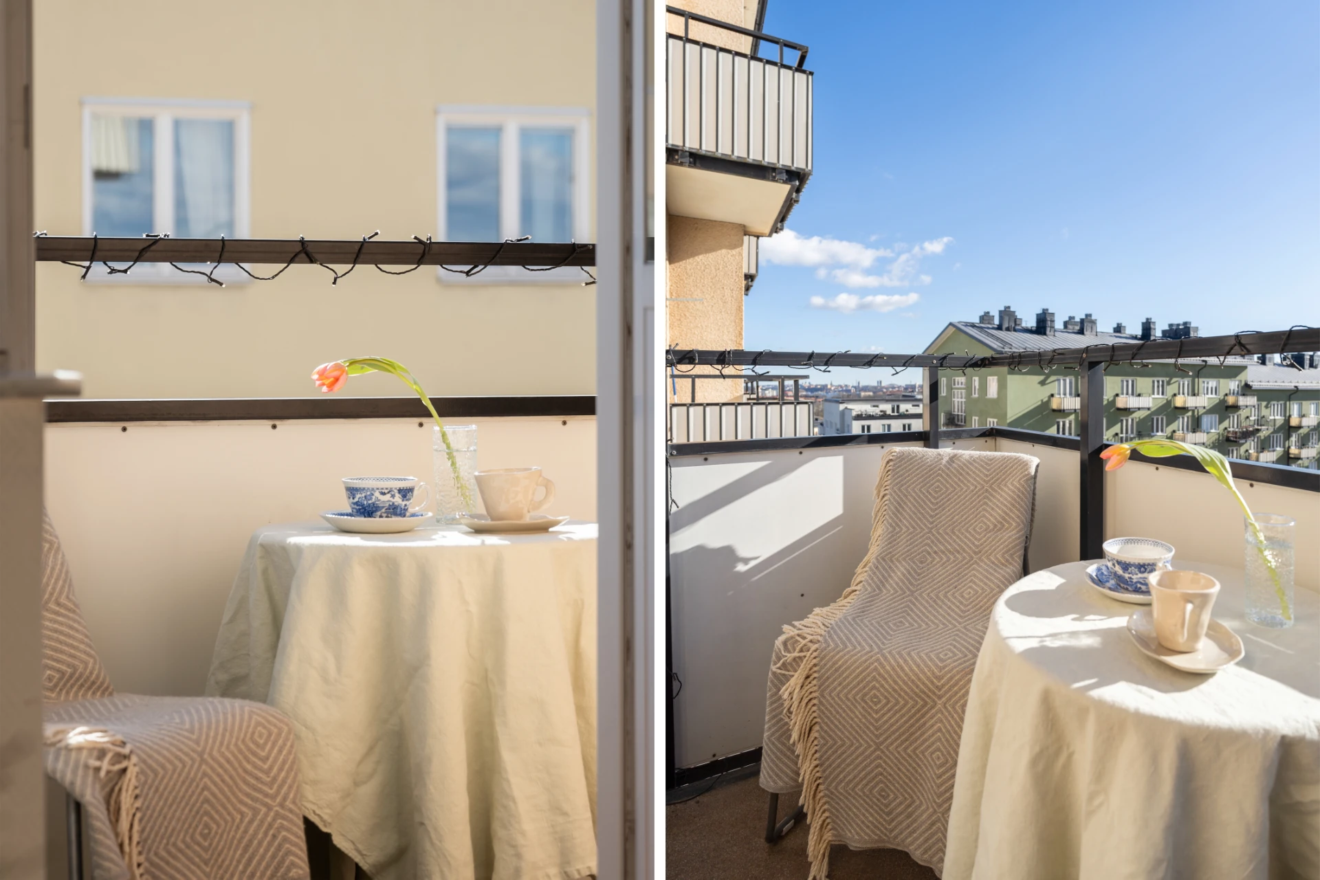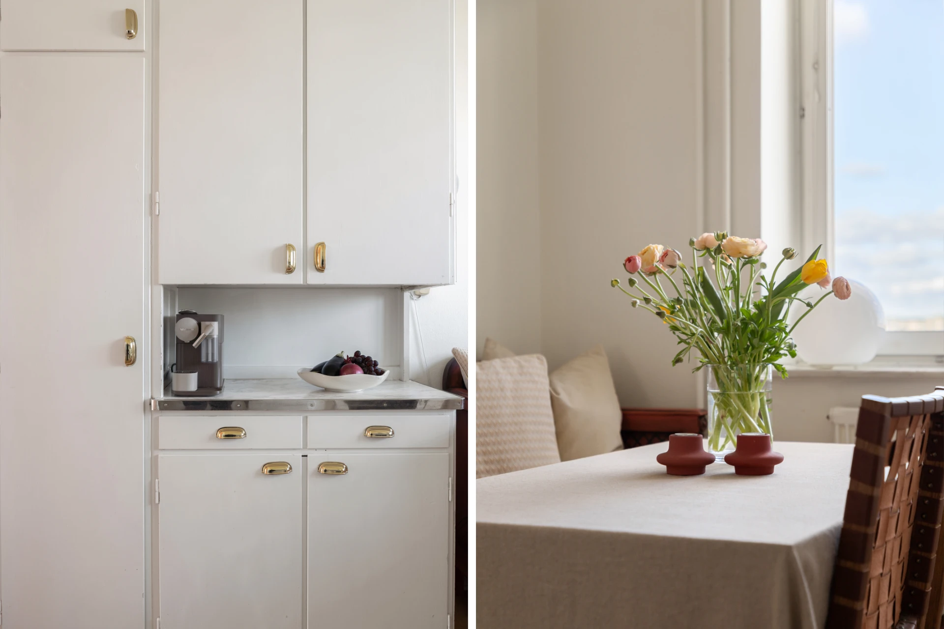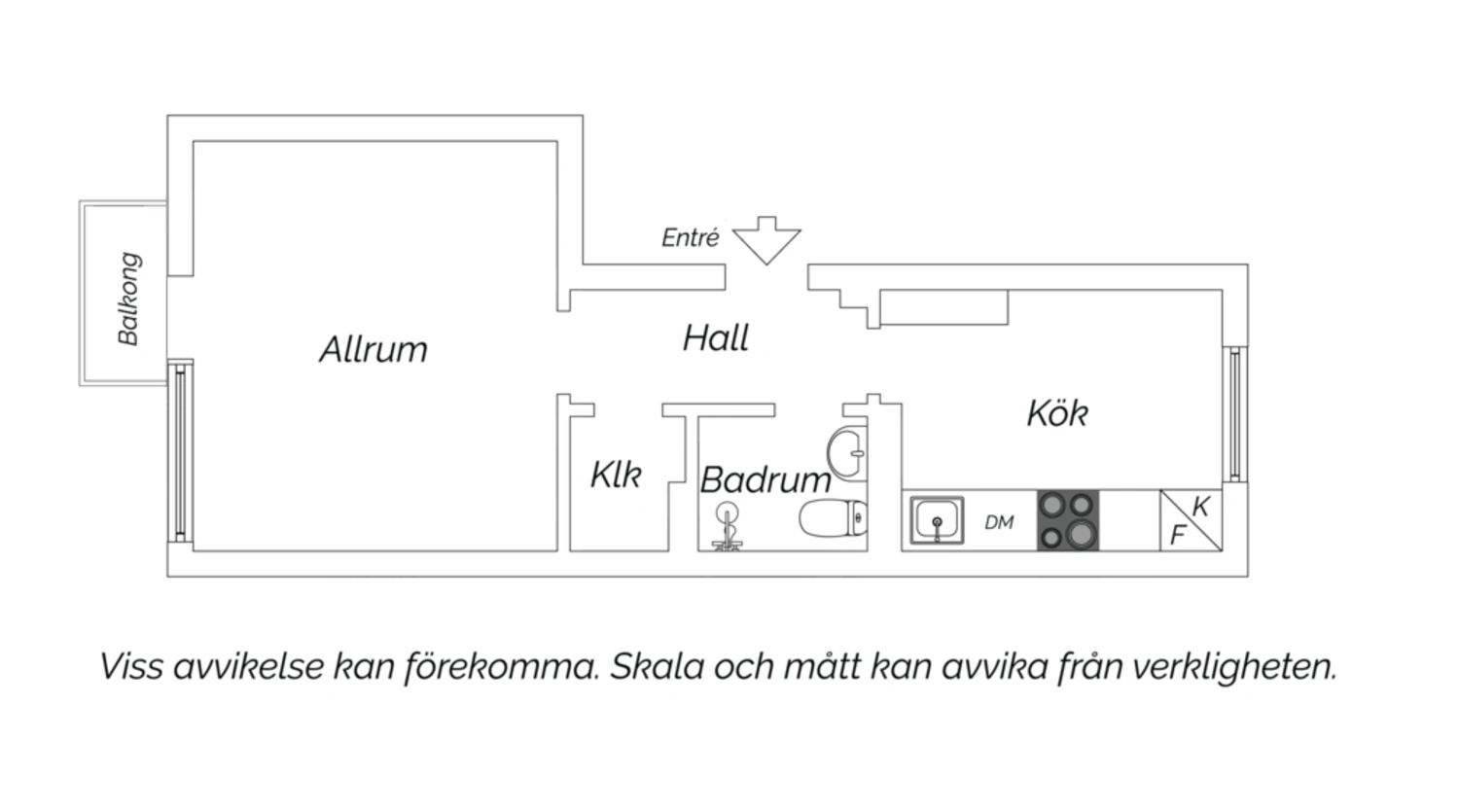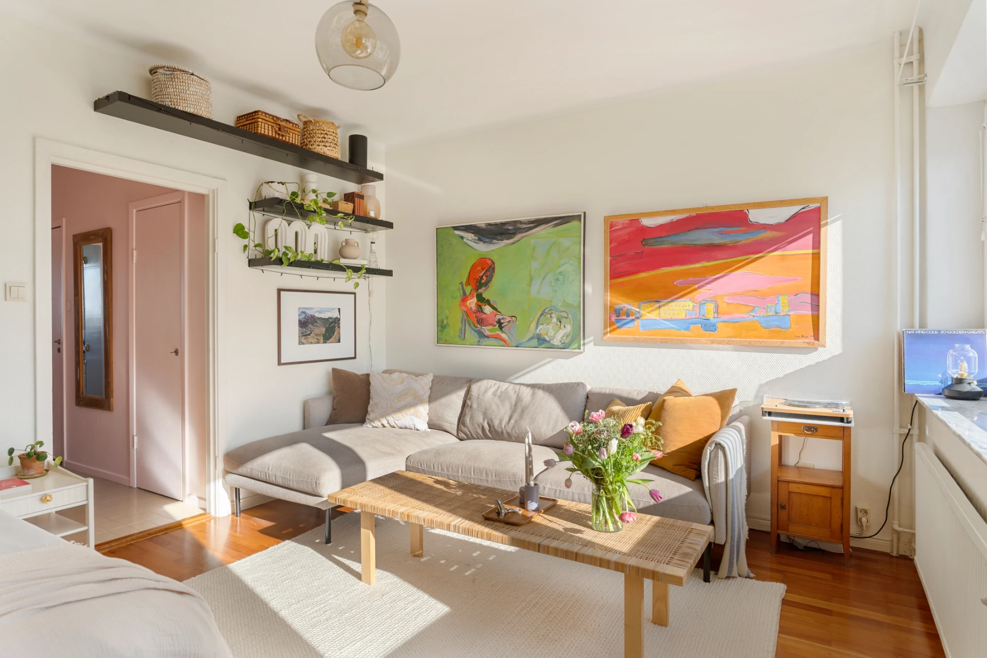 Hallen välkomnar dig med en vacker rosa nyans på väggarna, klinkergolv samt goda avhängningsmöjligheter för ytterkläder och skor. Här finns även en rymlig klädkammare som ger generös förvaring och håller hemmet stilrent och organiserat. Det ljusa och luftiga allrummet har en naturlig rymd tack vare det stora fönstret och den öppna planlösningen. Här får du plats med både soffa, soffbord och säng utan att kompromissa med känslan av rymd. Från rummet når du balkongen, som blir en härlig förlängning av bostaden med sol under dagens bästa timmar. Köket är klassiskt och tidlöst med vita skåpluckor, bra arbetsytor och gott om förvaring. Den öppna planlösningen gör det lätt att umgås medan du lagar mat, och matplatsen rymmer enkelt fyra personer – perfekt för både vardagsmiddagar och sociala tillställningar. Badrummet är nyrenoverat i stilrena grå toner och erbjuder en modern atmosfär med smakfulla detaljer. Här finns WC, handfat med kommod och spegel samt en rymlig dusch med svarta detaljer och infällbara glasväggar – en perfekt kombination av elegans och funktion.