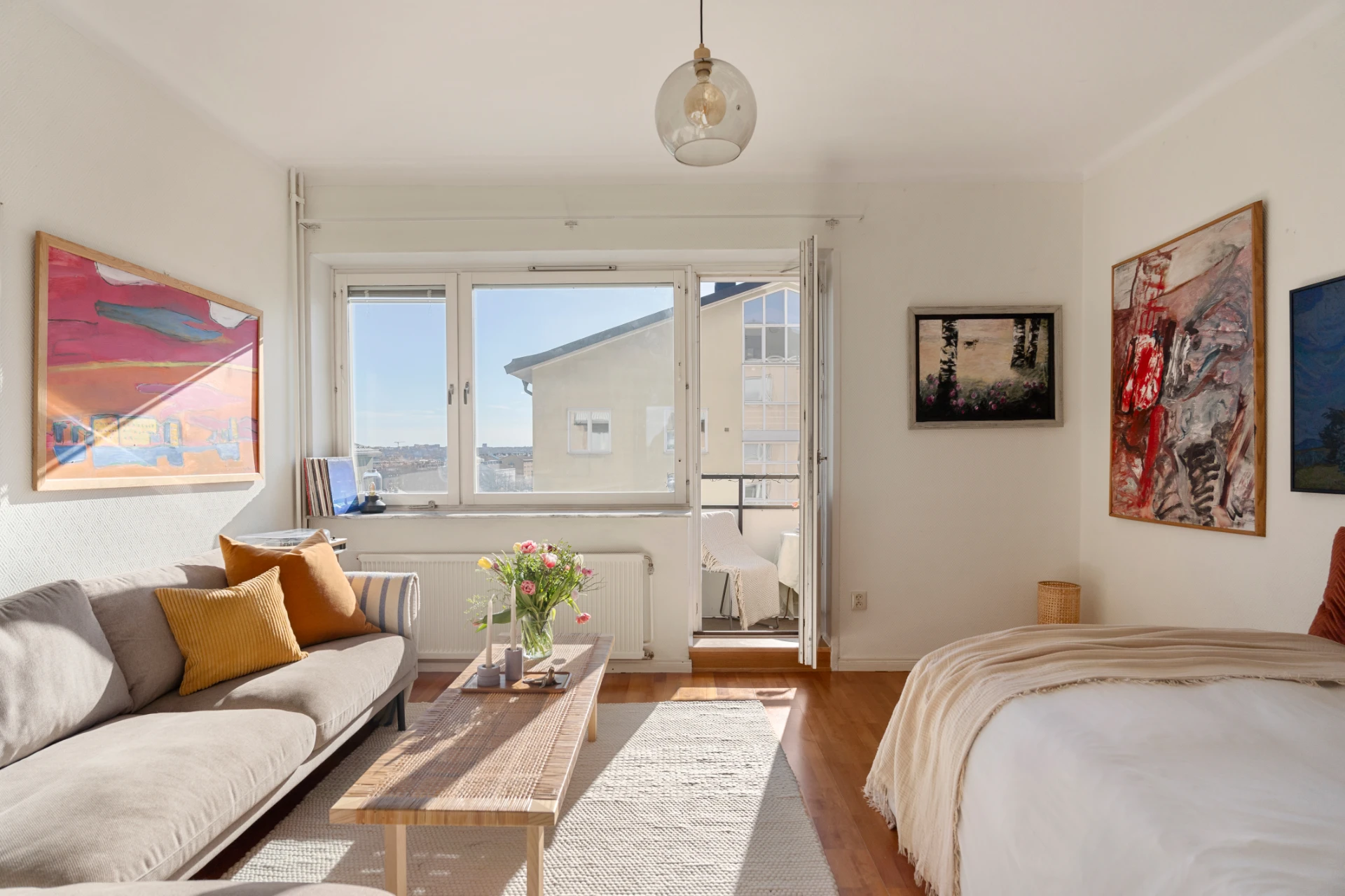 Öppet och ljust allrum med fantastiskt ljusinsläpp från stort fönster. Plats för soffa, soffbord samt säng. Från allrummet når du bostadens härliga balkong.