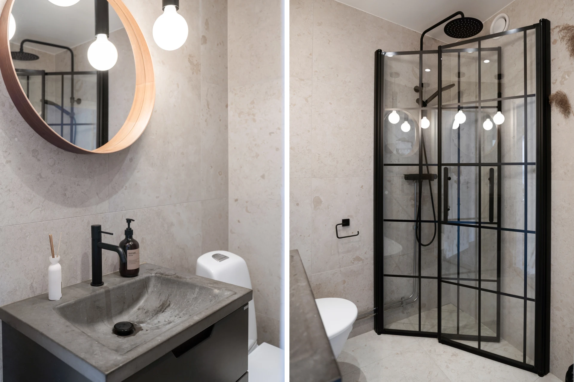 Modernt badrum i grått kakel och klinkergolv. Utrustat med WC, handfat med kommod och spegel ovan samt dusch med svarta detaljer och infällbara glasväggar.