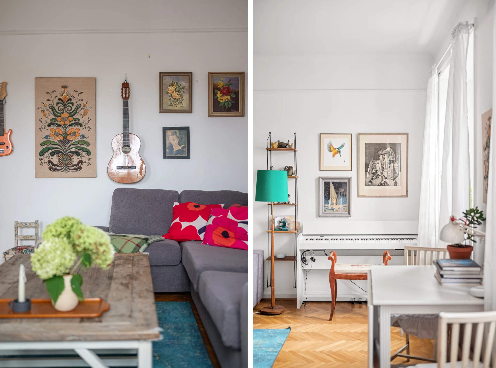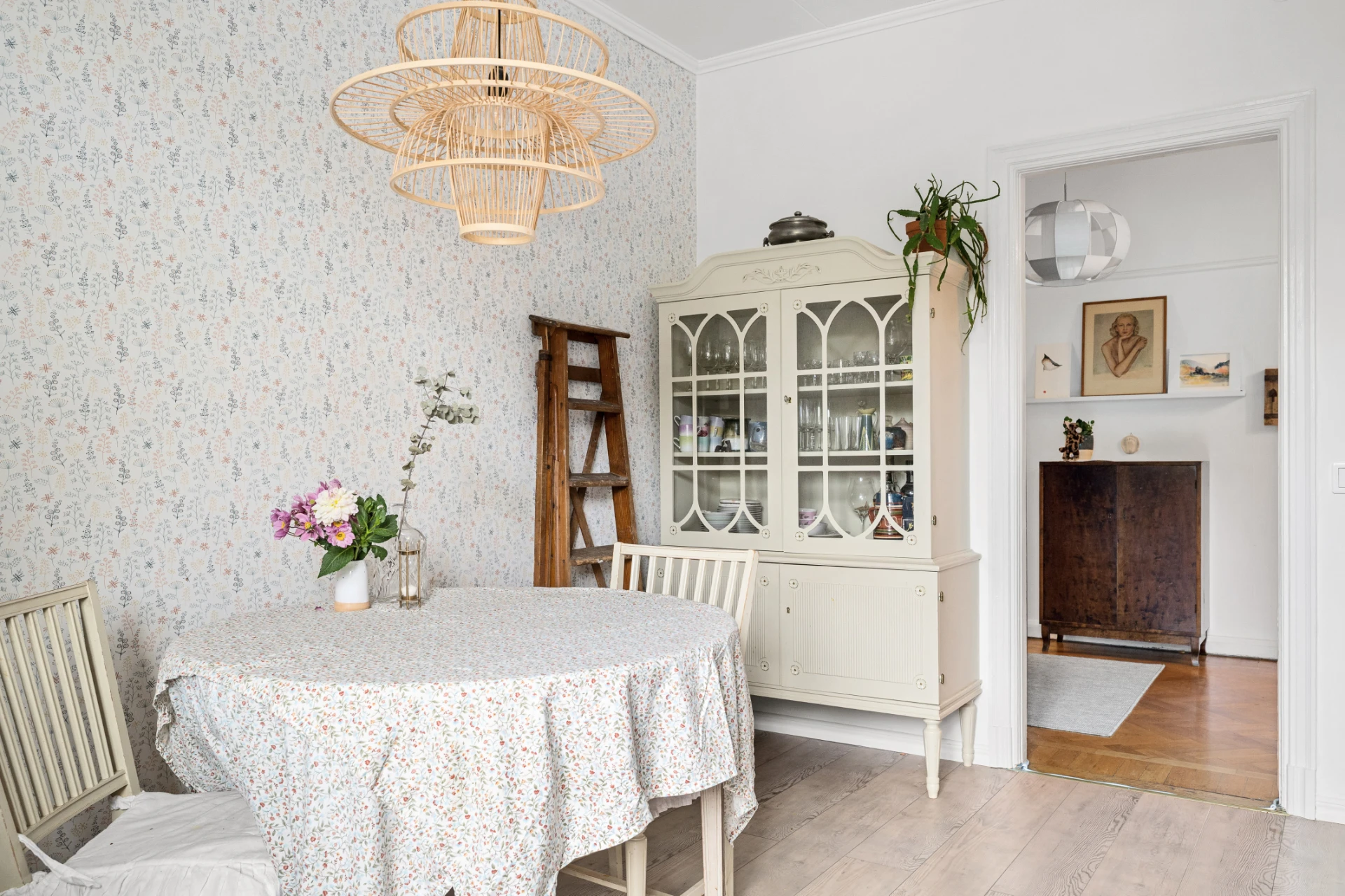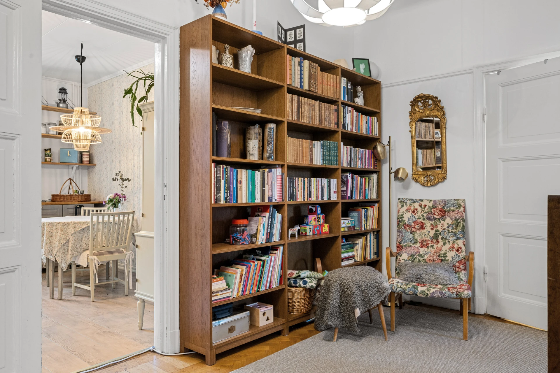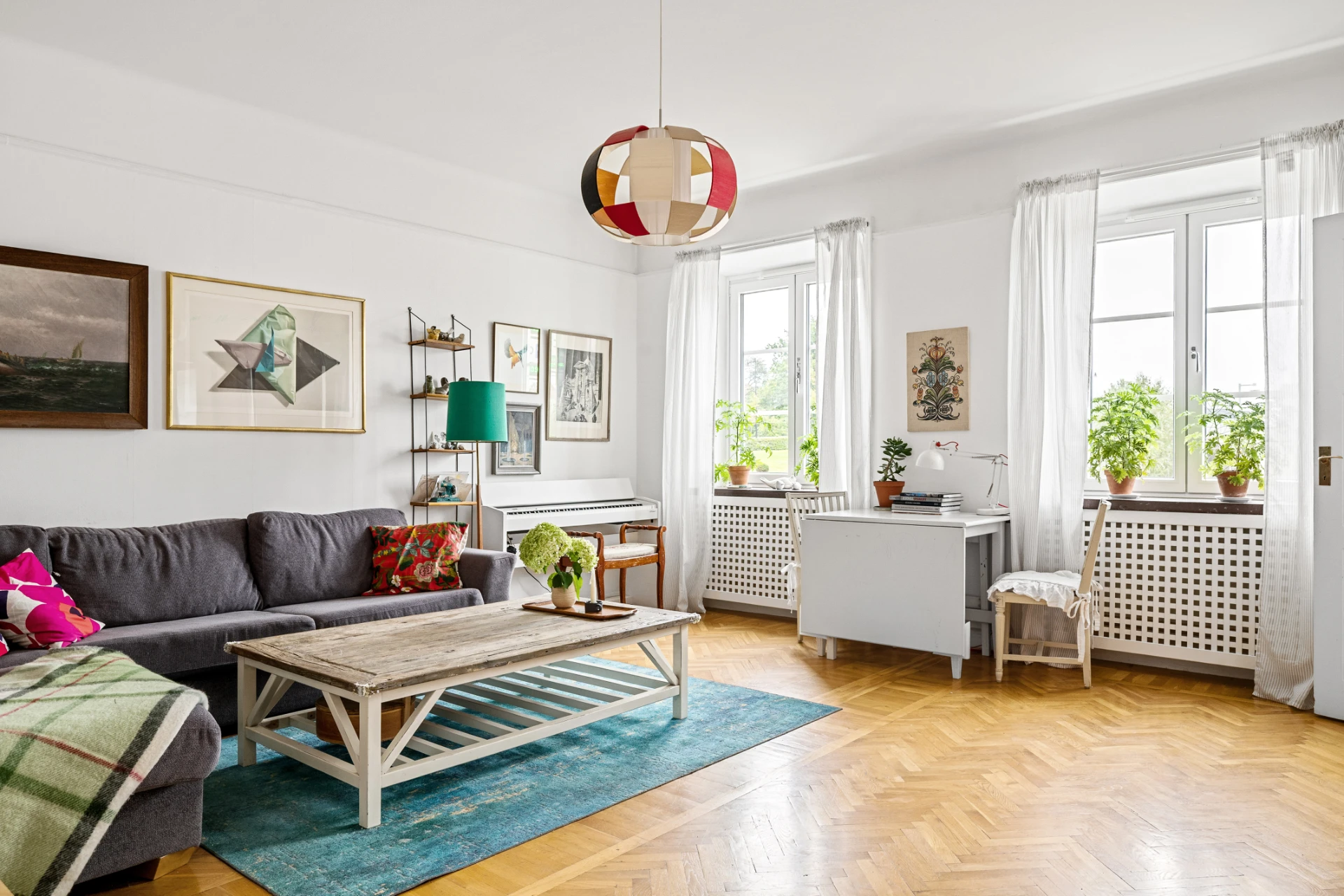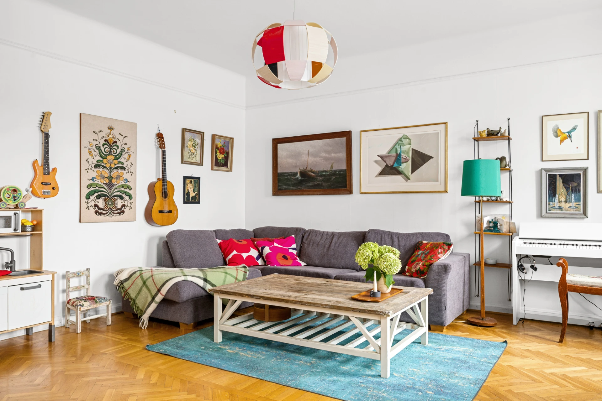 Parkettgolv, målade väggar.