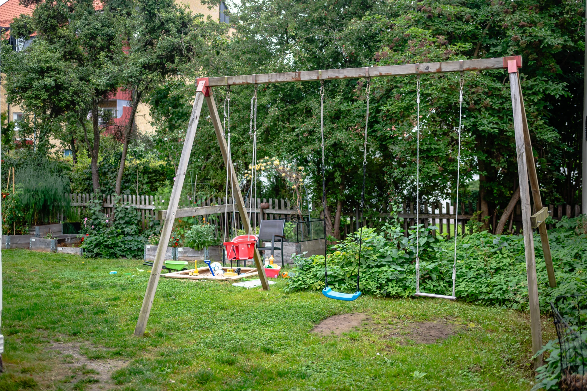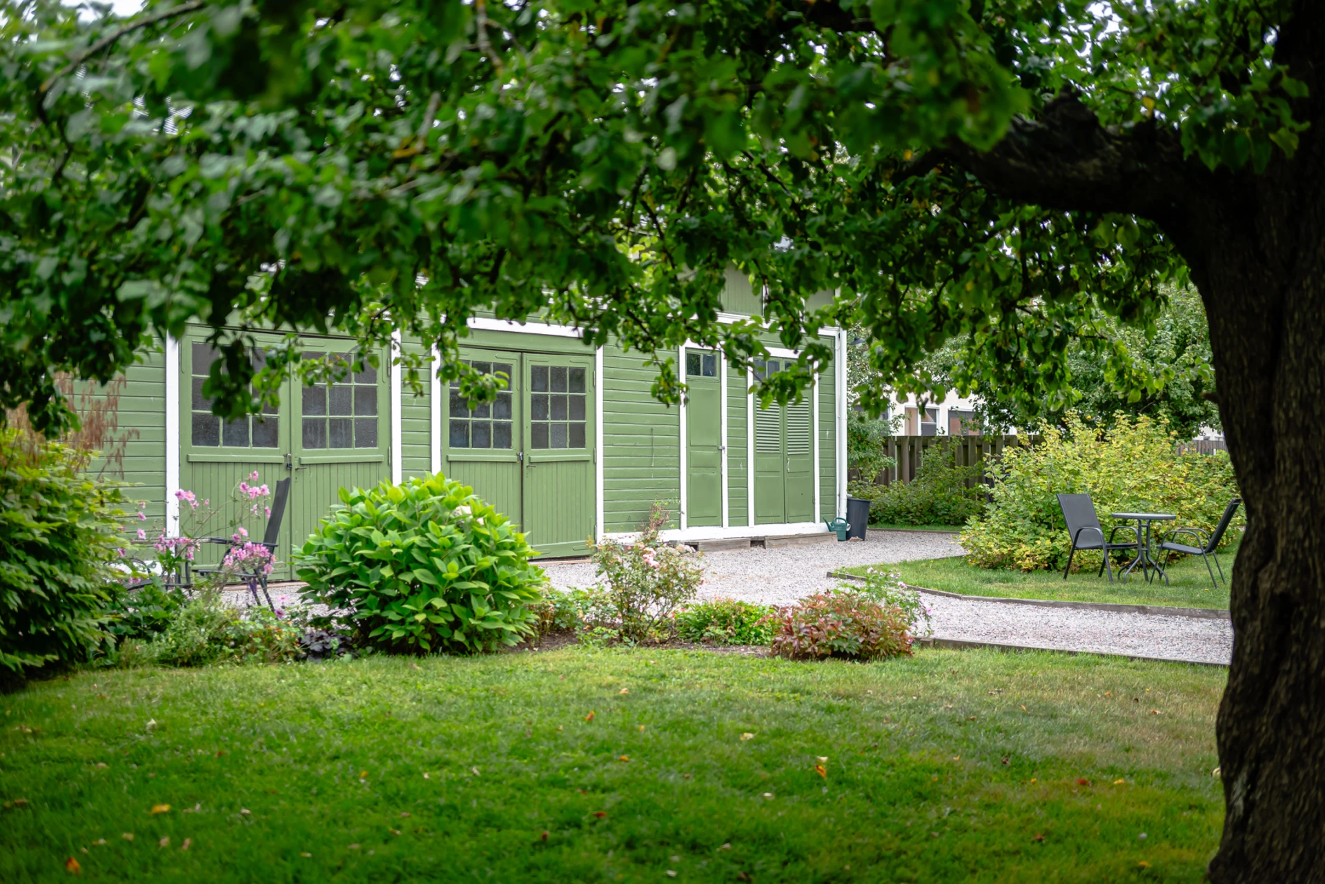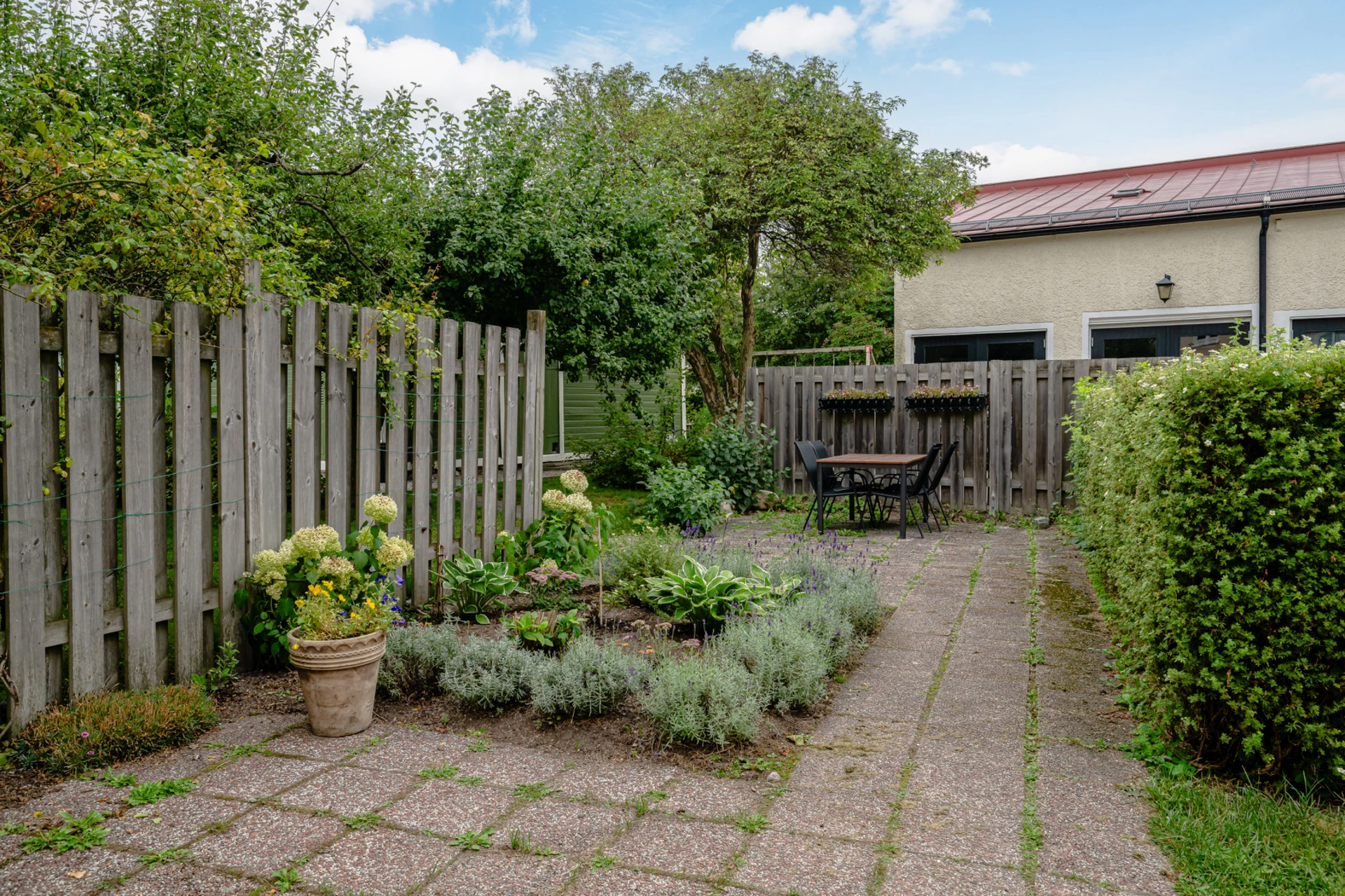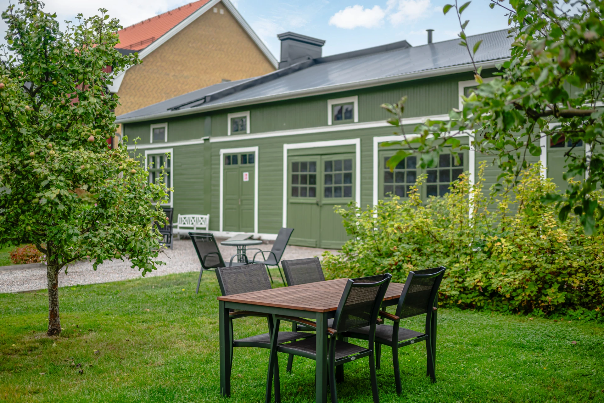 I trädgården finns en gemensam uteplats med odlingslotter.
