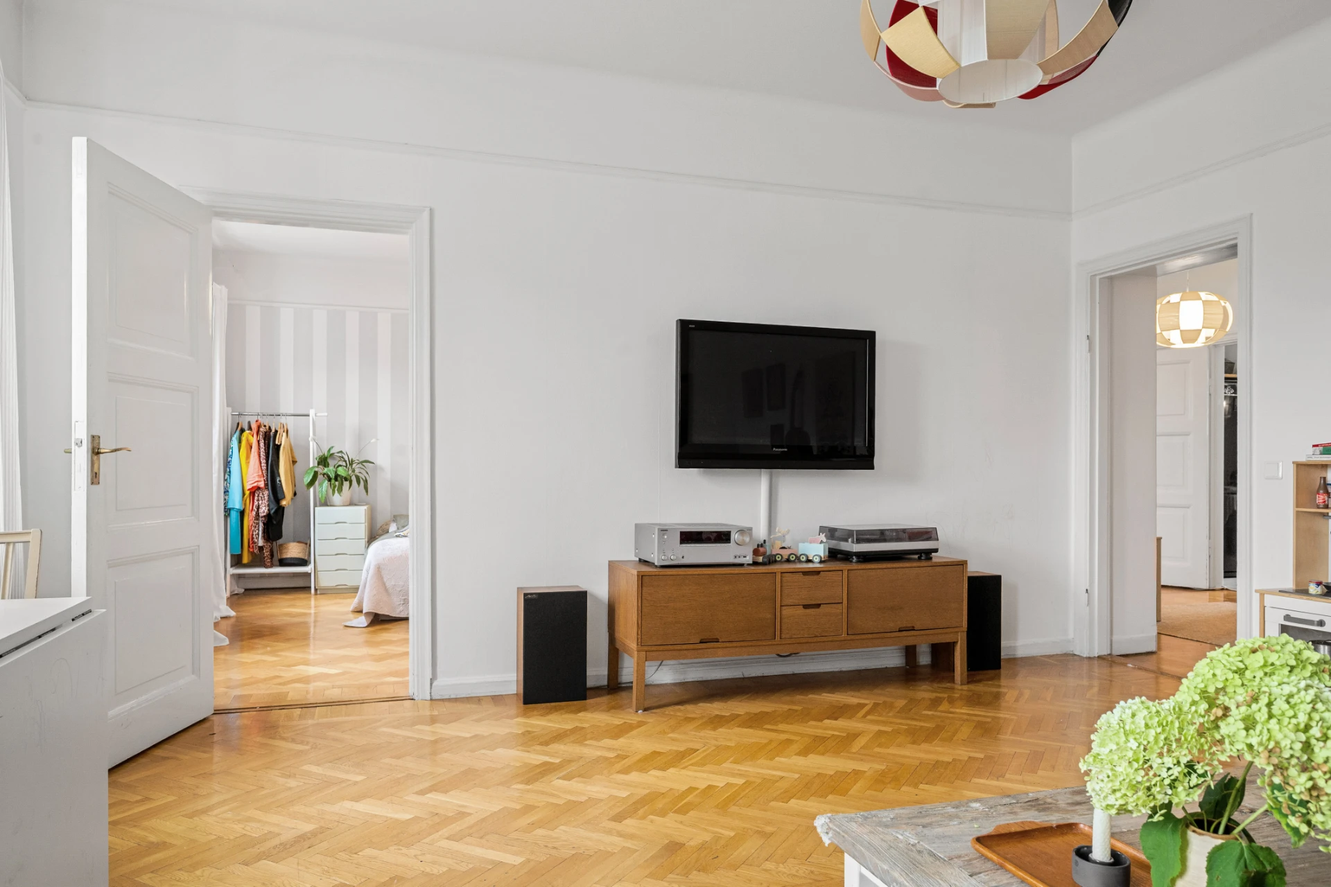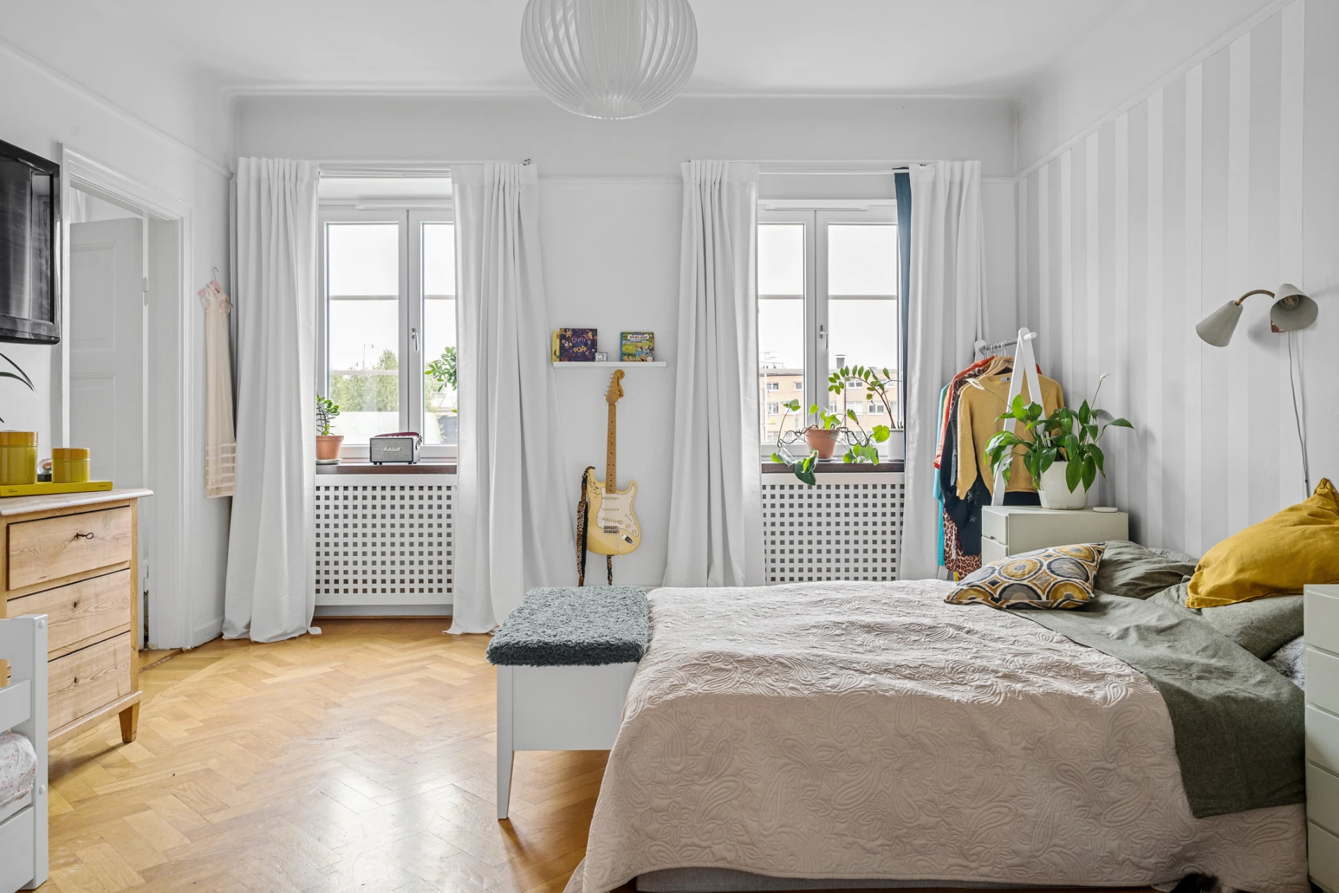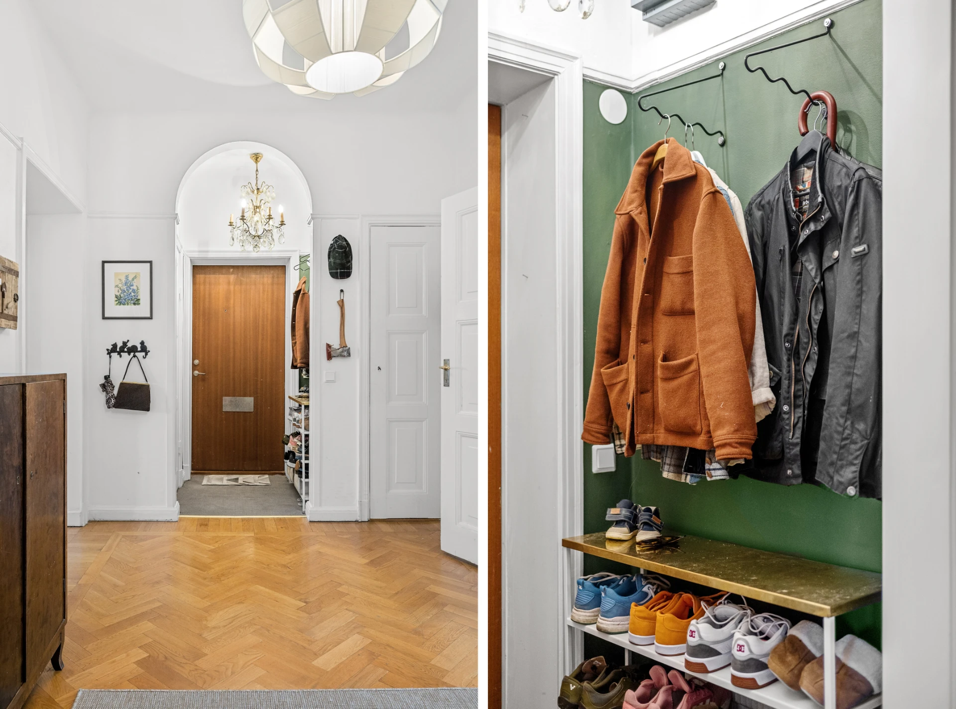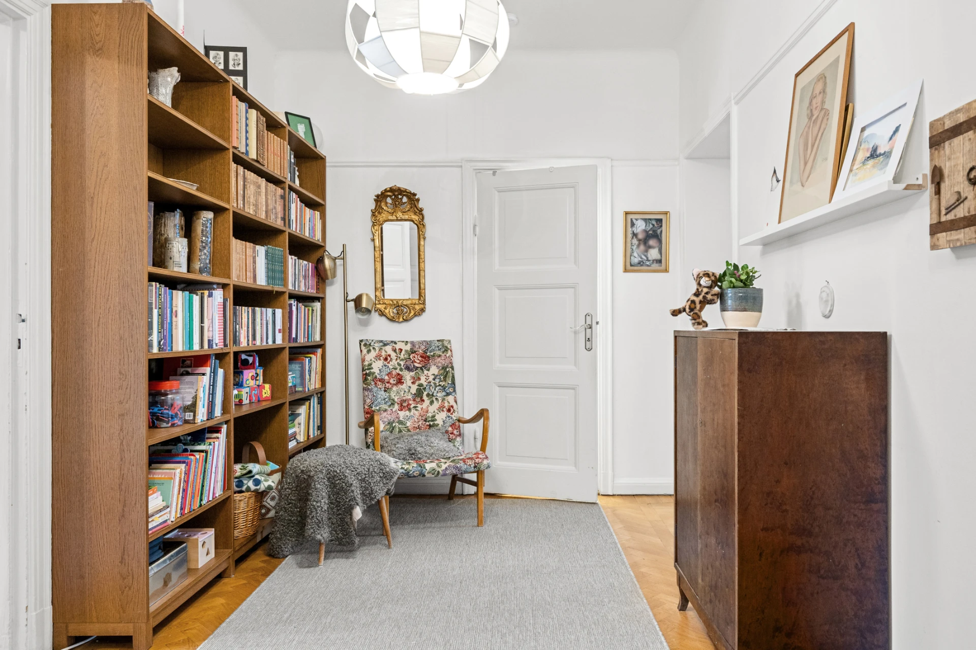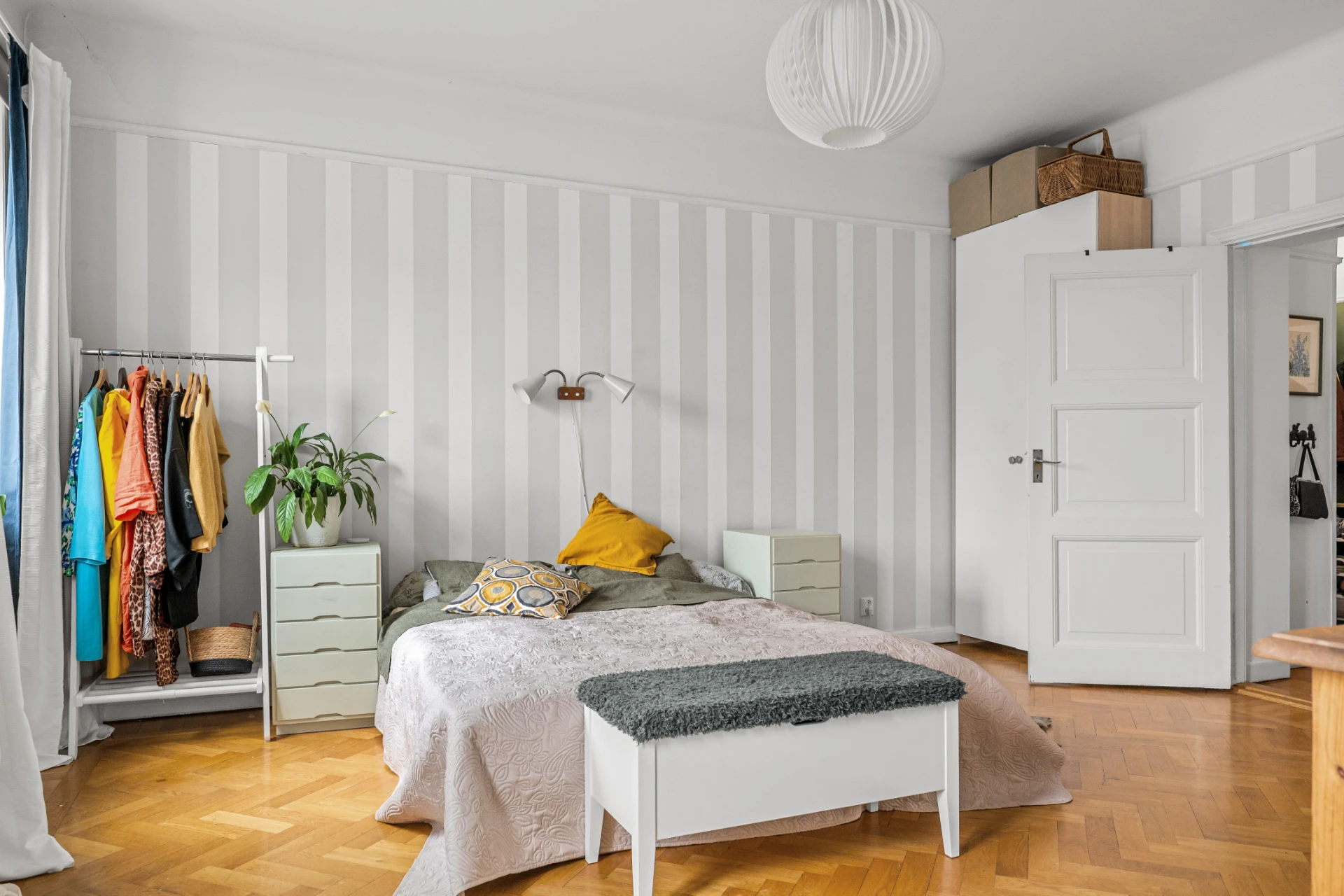 Parkettgolv, tapetserade väggar. Garderober.