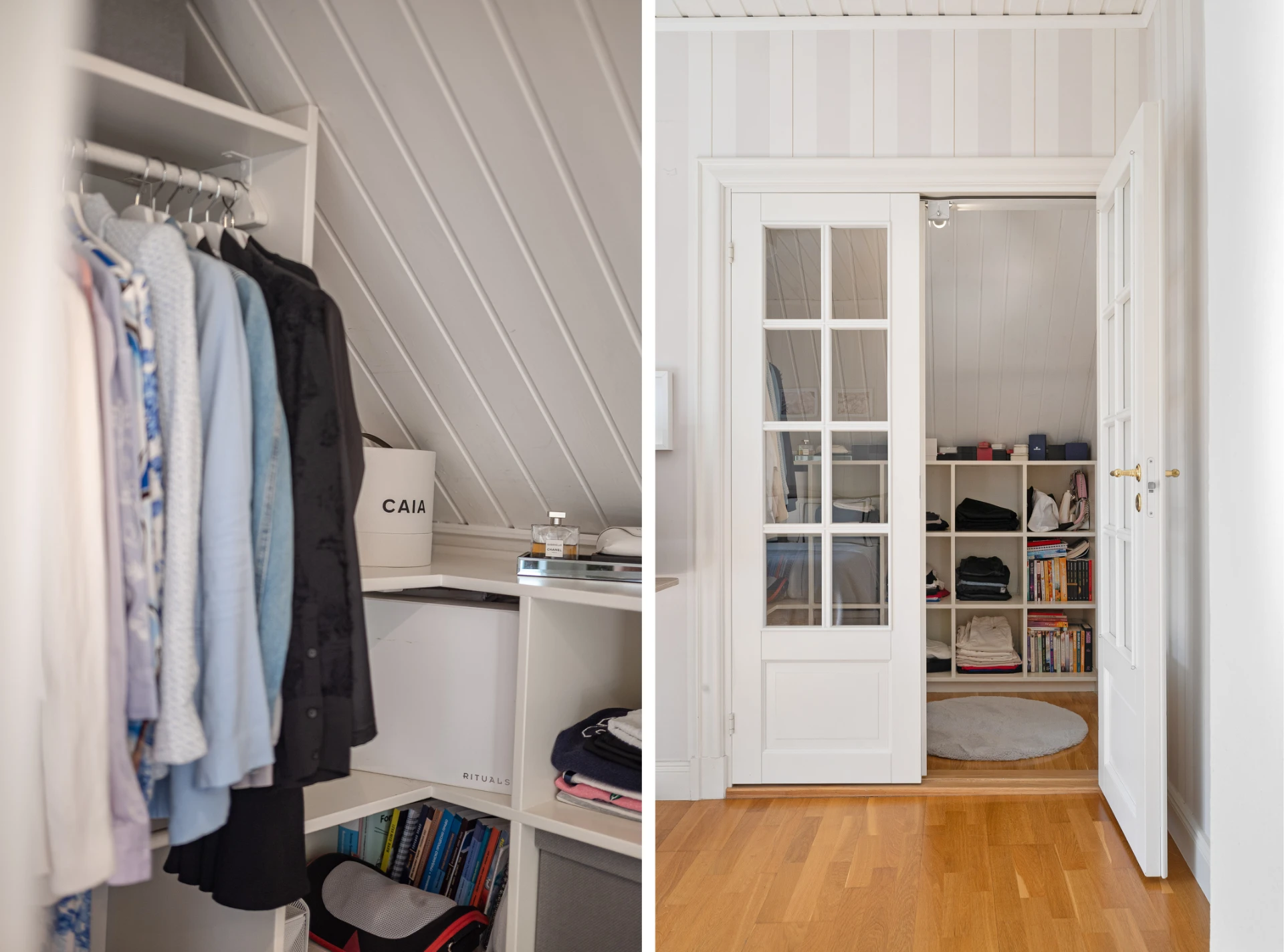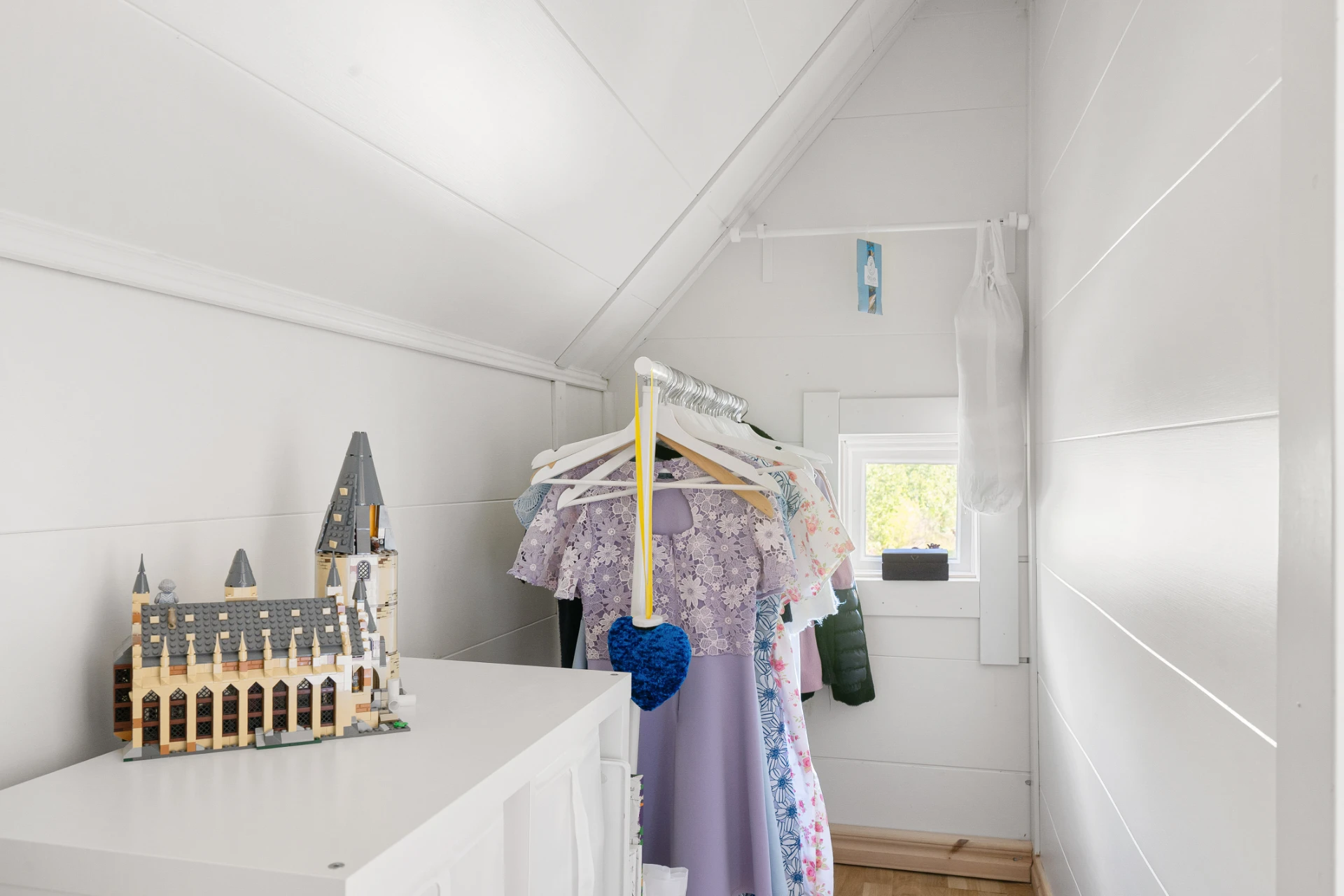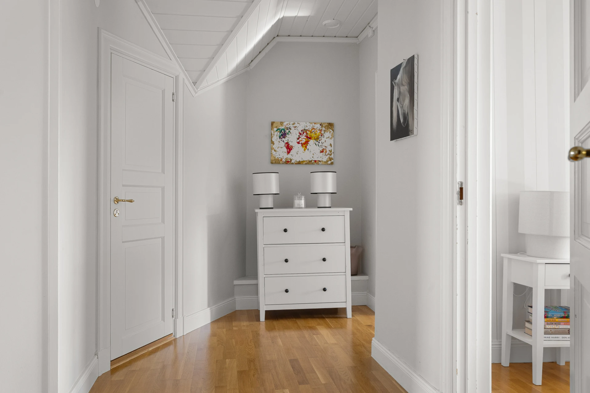 Laminatgolv och tapetserade väggar. Ingång till klädkammare i tidigare kattvind.