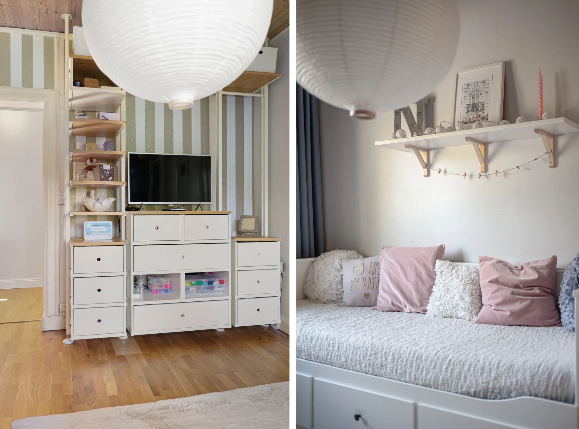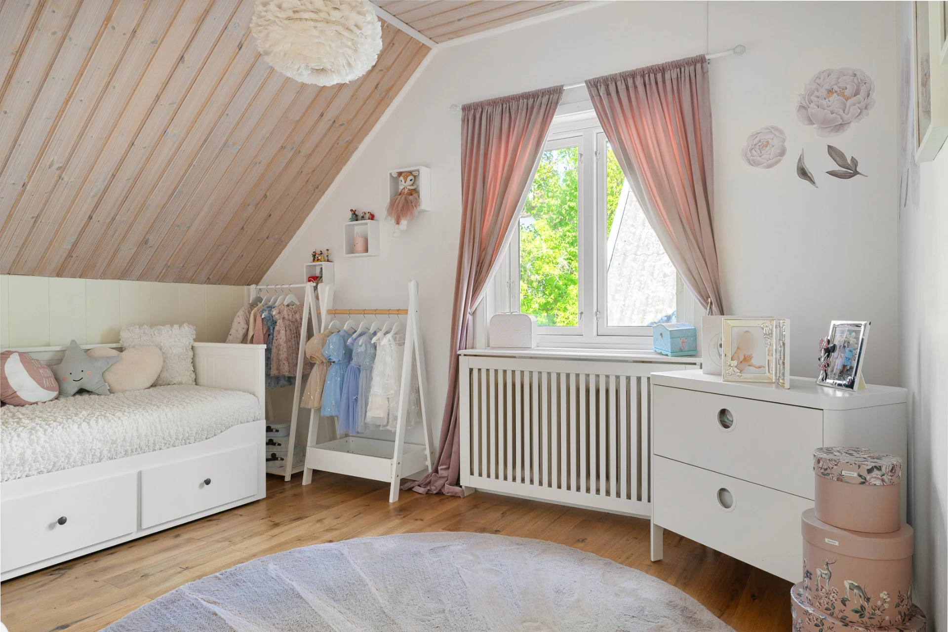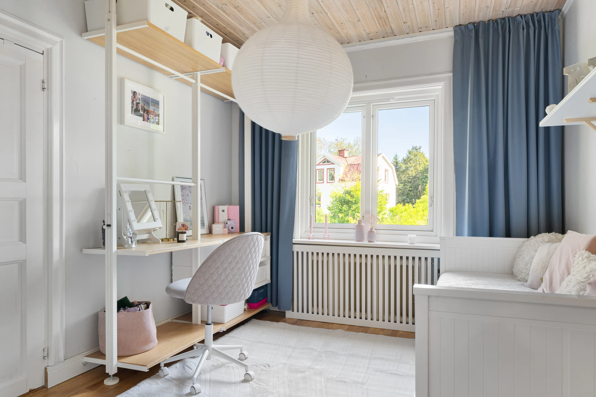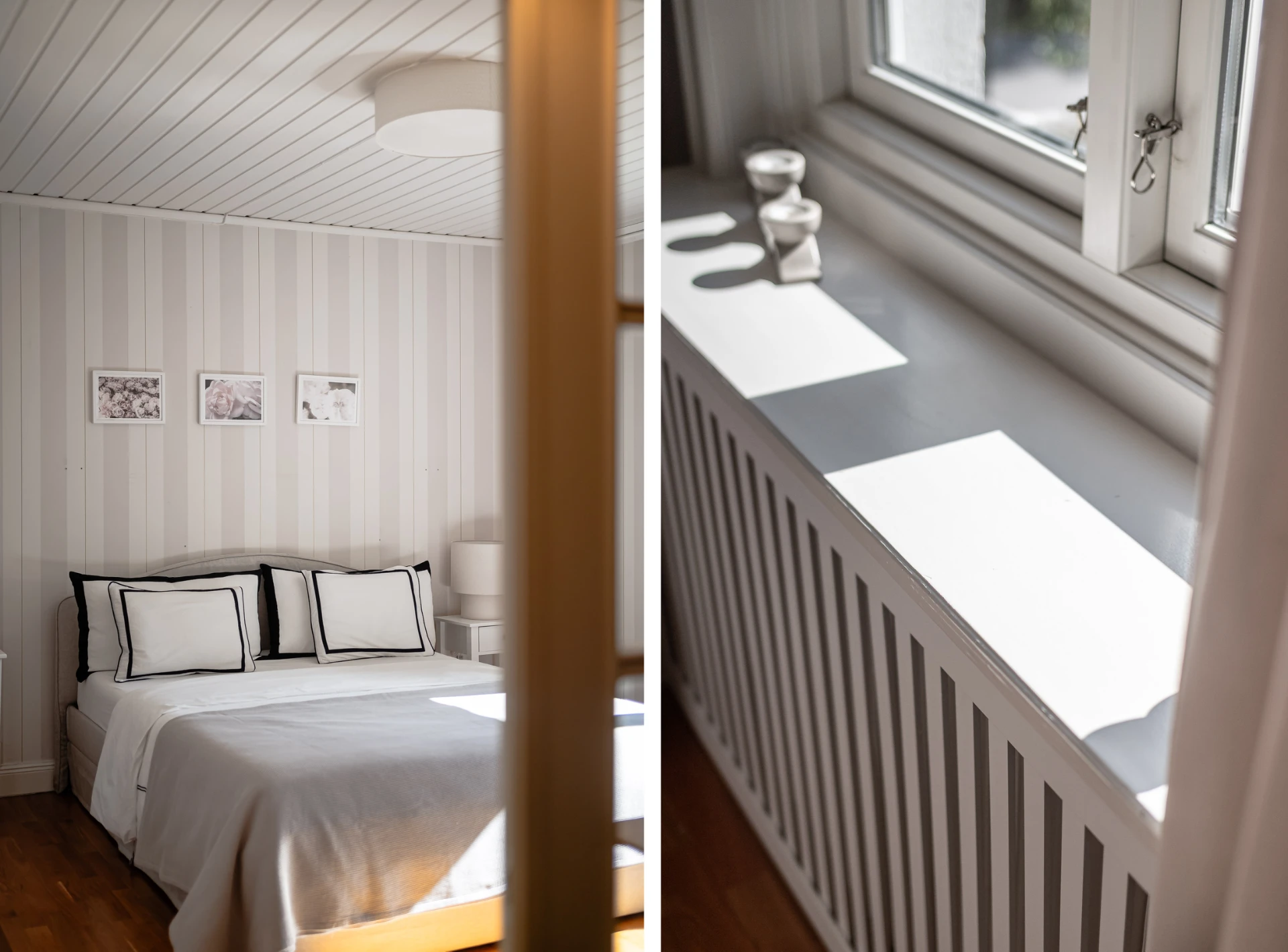 Laminatgolv och tapetserade väggar. Ingång till klädkammare i tidigare kattvind.