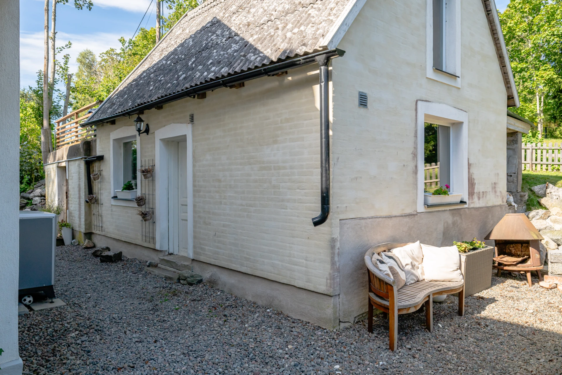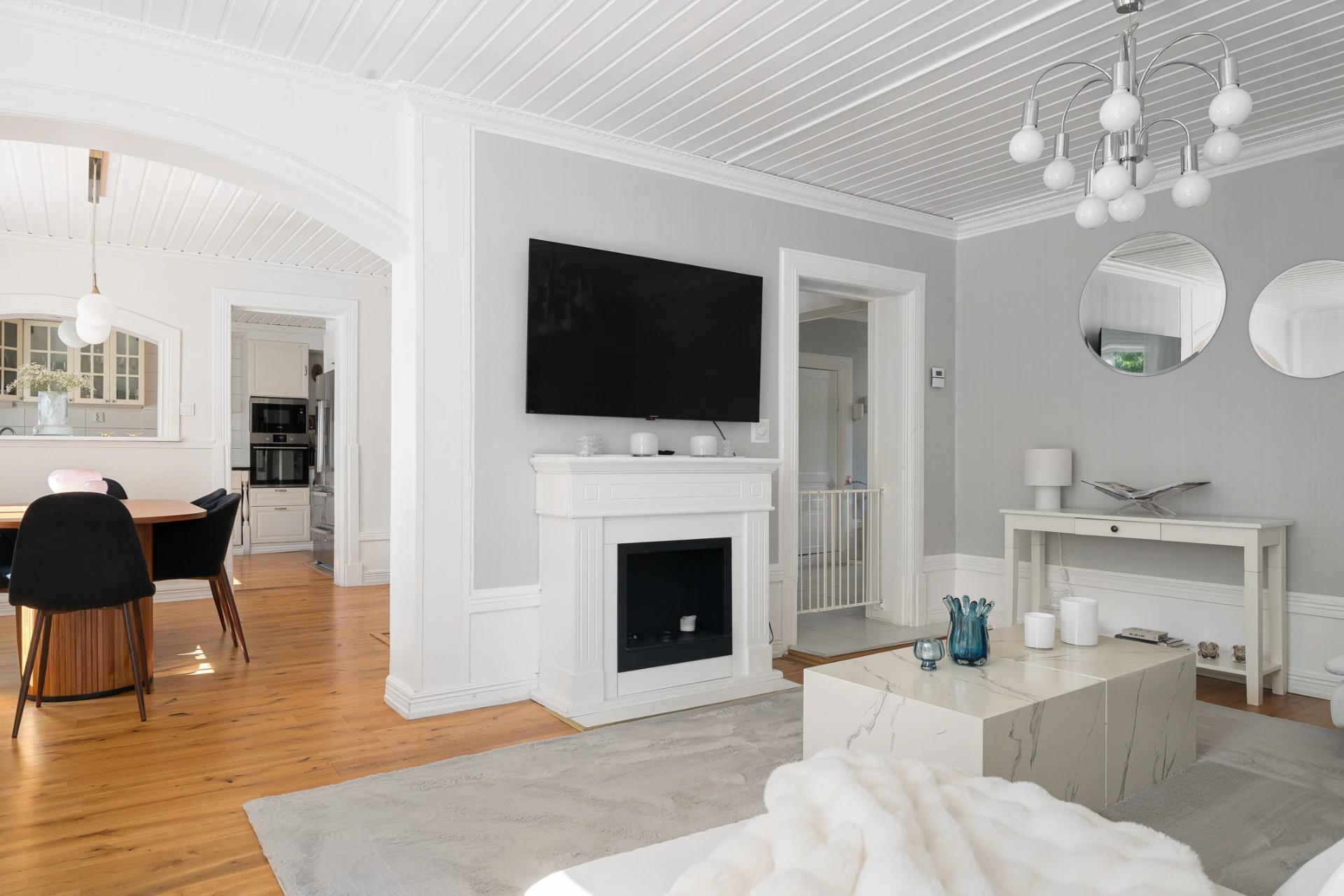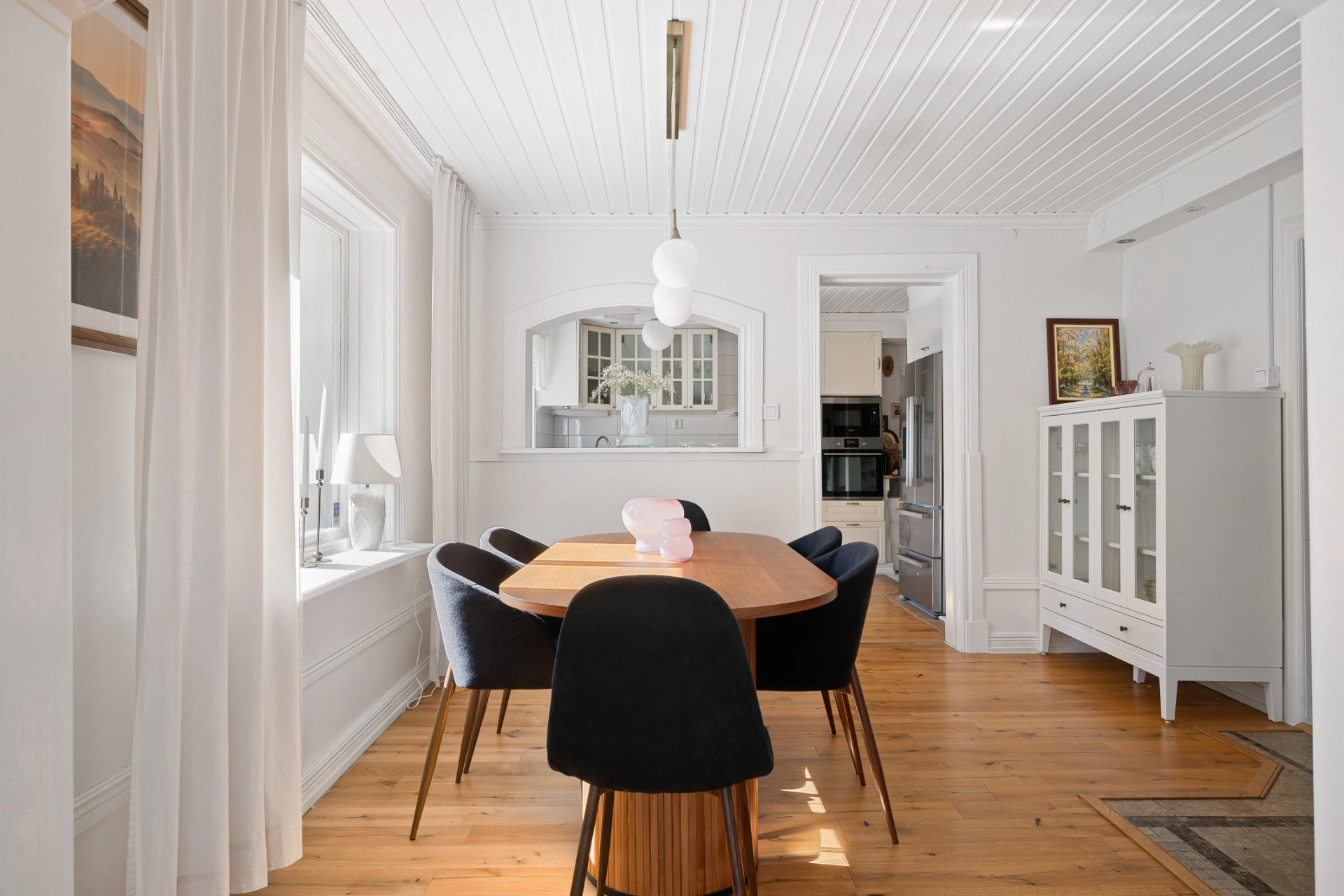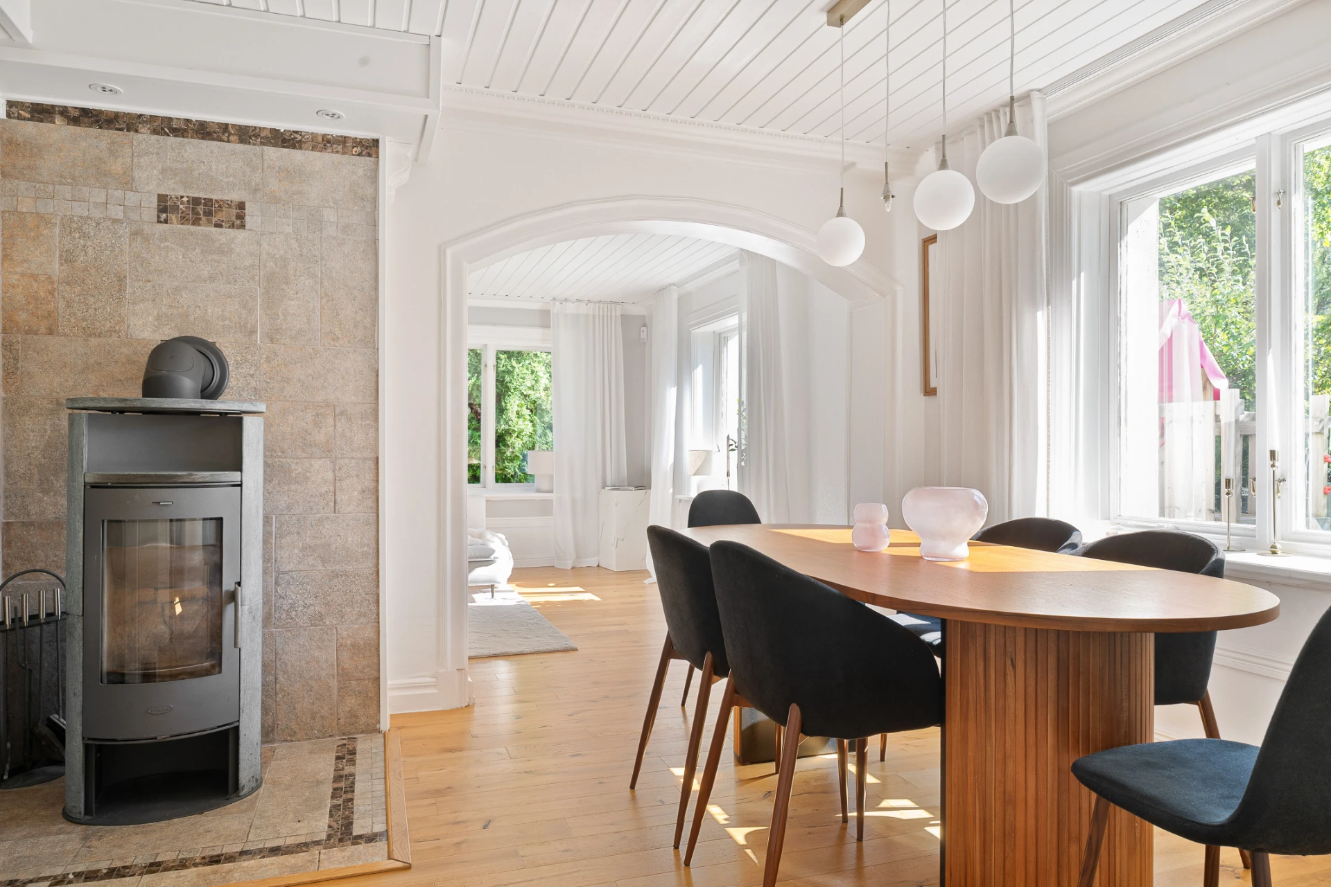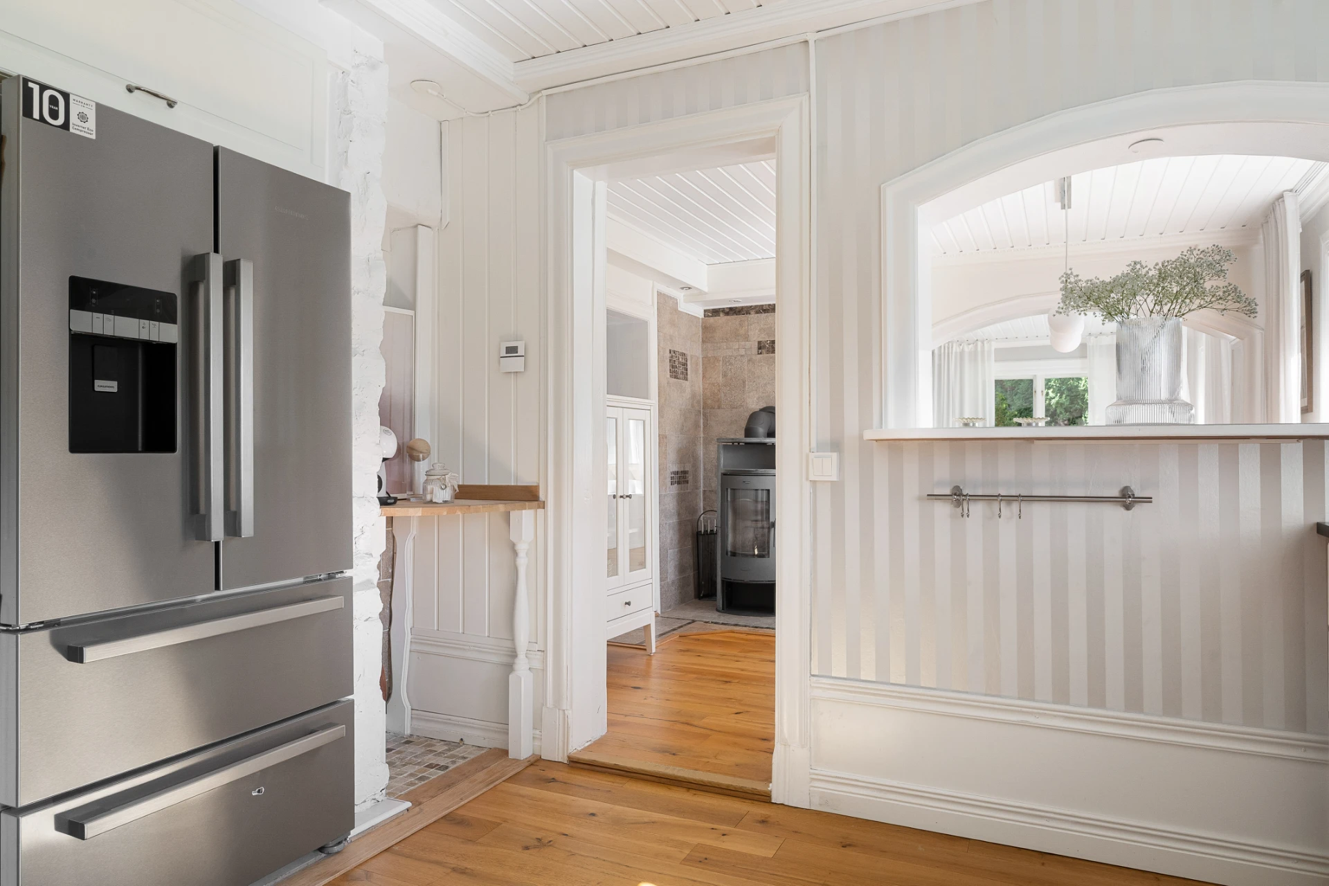 Laminatgolv med vattenburen golvvärme och tapetserade väggar. Braskamin och matplats för 6 personer. Stor öppning till vardagsrummet.