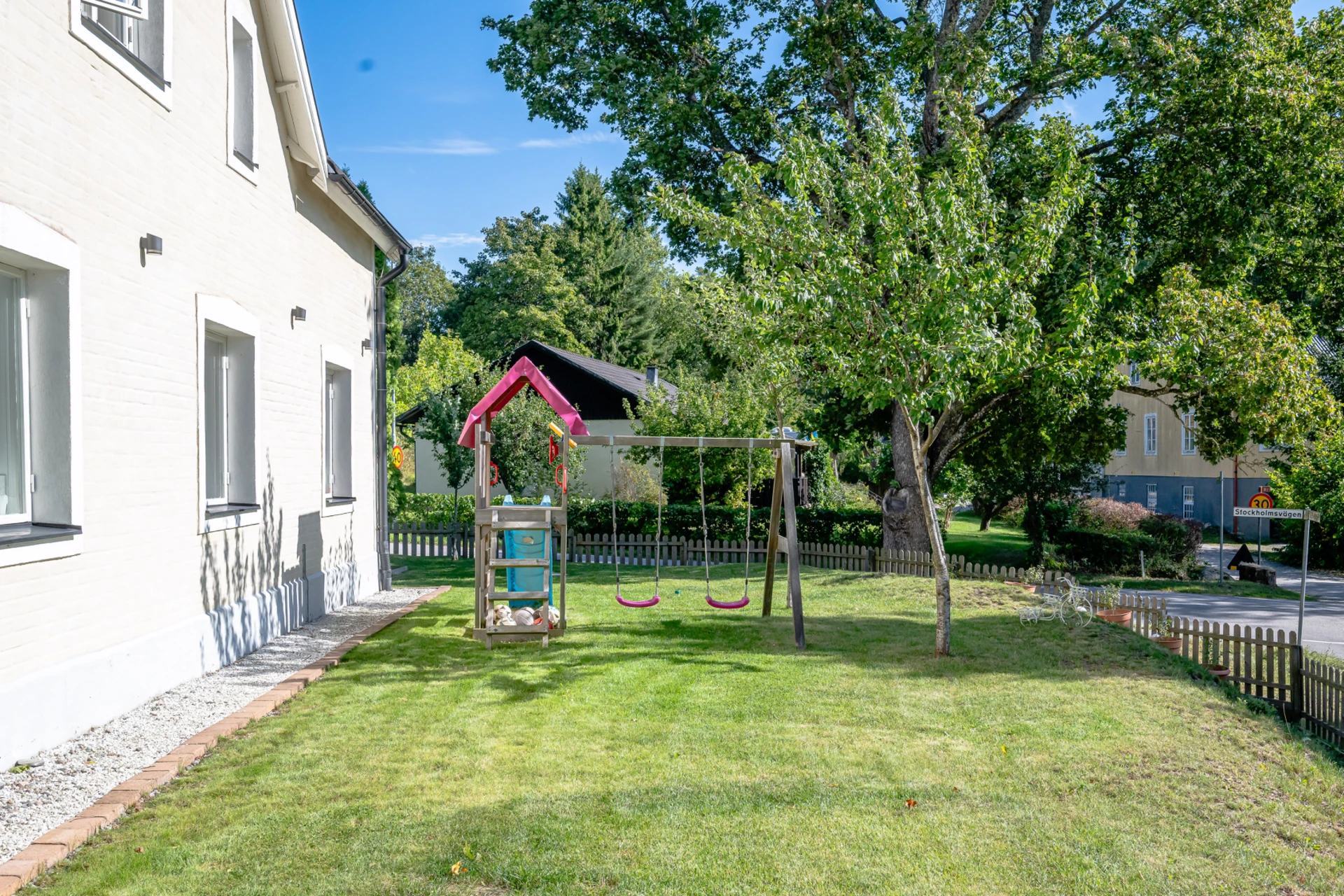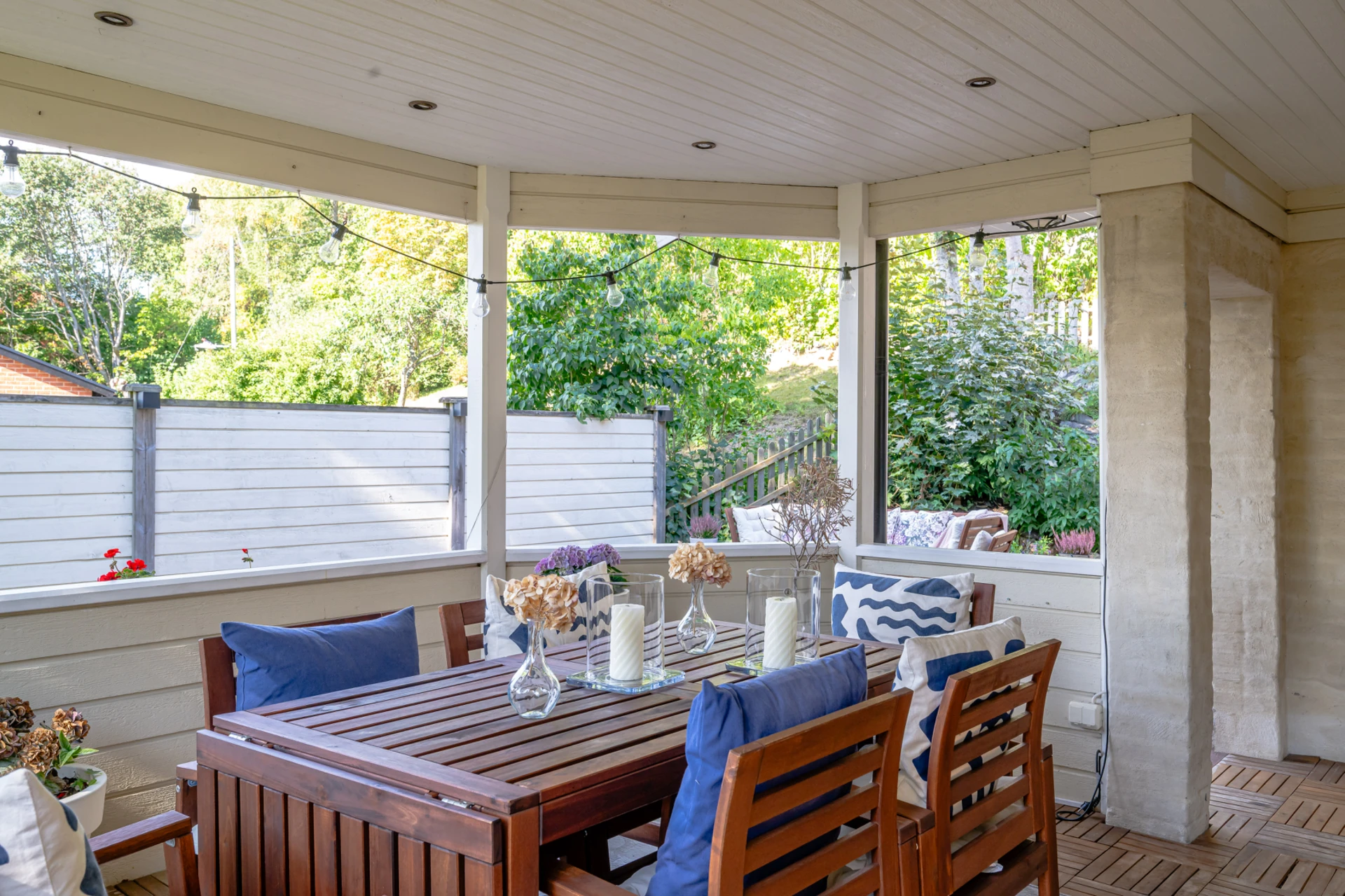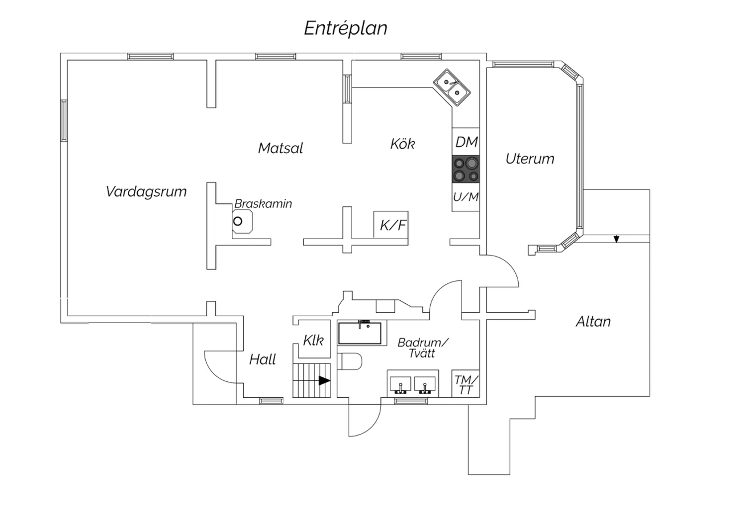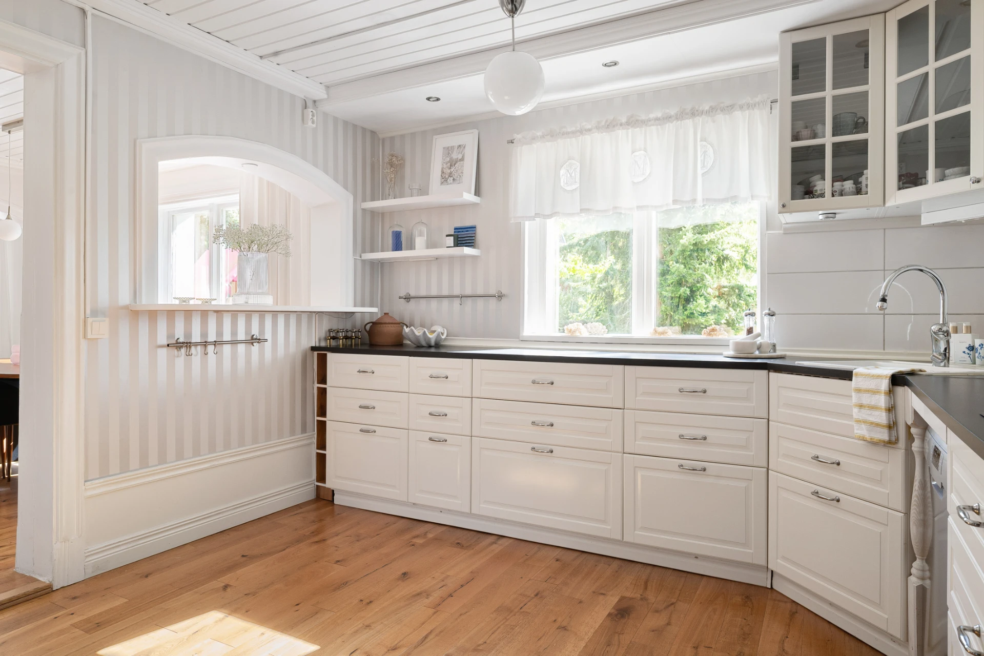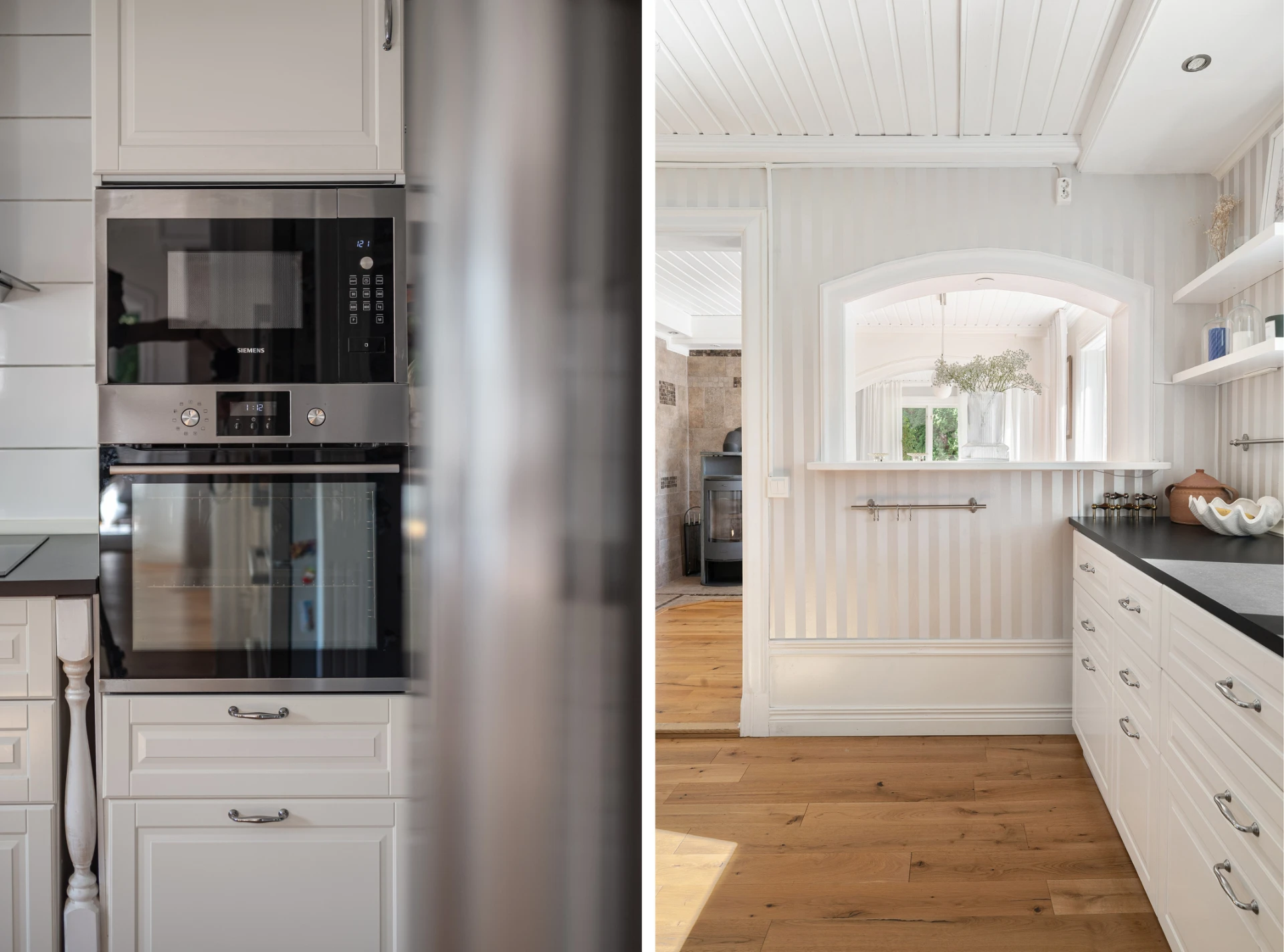 Laminatgolv med vattenburen golvvärme och tapetserade väggar. Braskamin och matplats för 6 personer. Stor öppning till vardagsrummet.