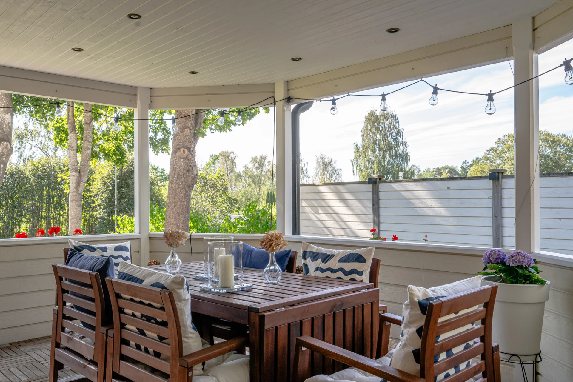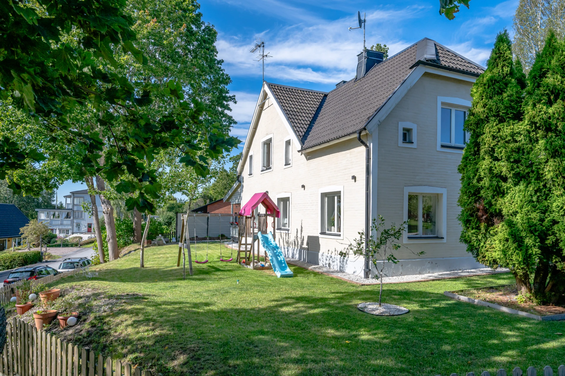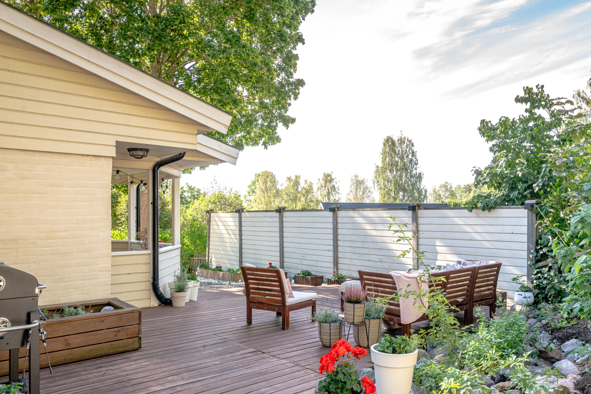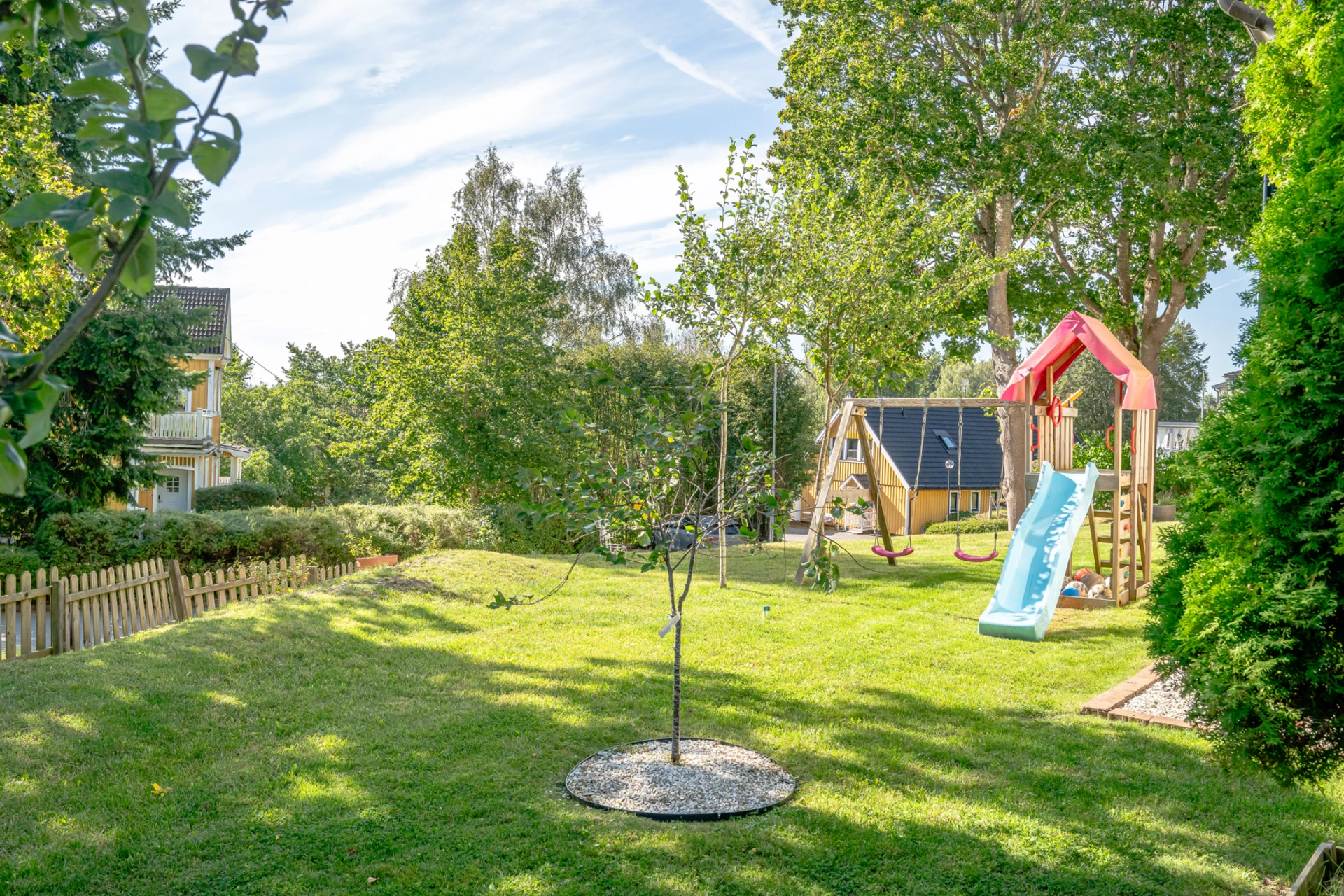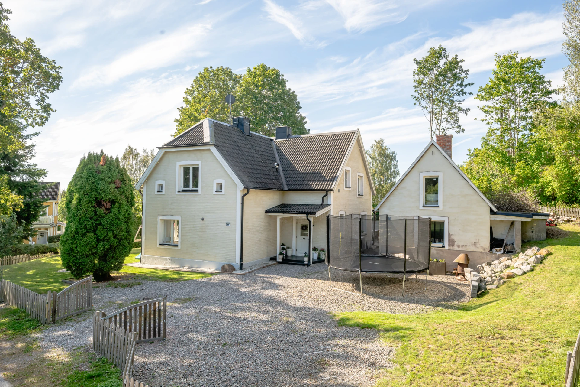 Laminatgolv med vattenburen golvvärme och tapetserade väggar. Braskamin och matplats för 6 personer. Stor öppning till vardagsrummet.
