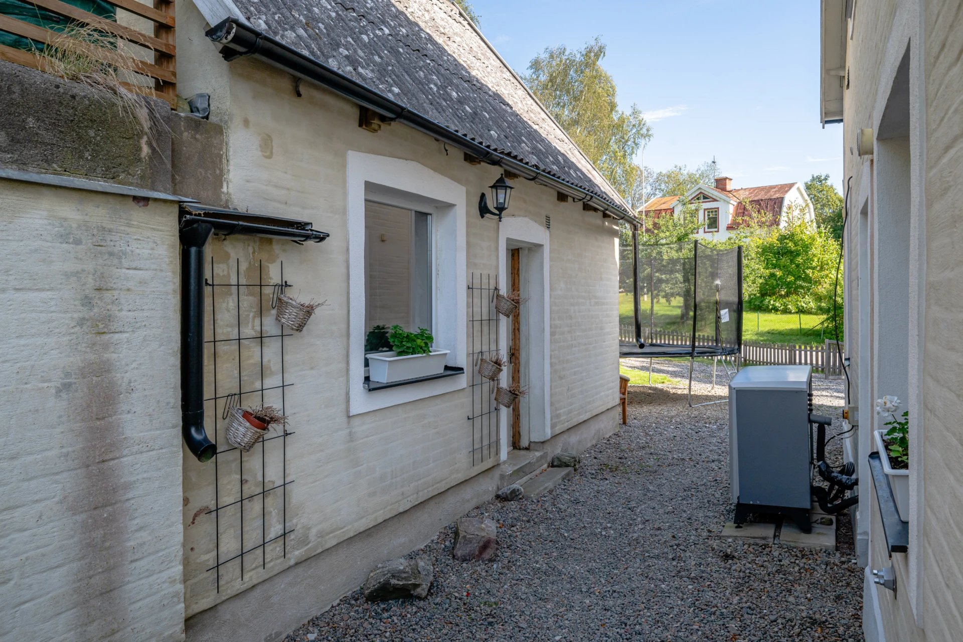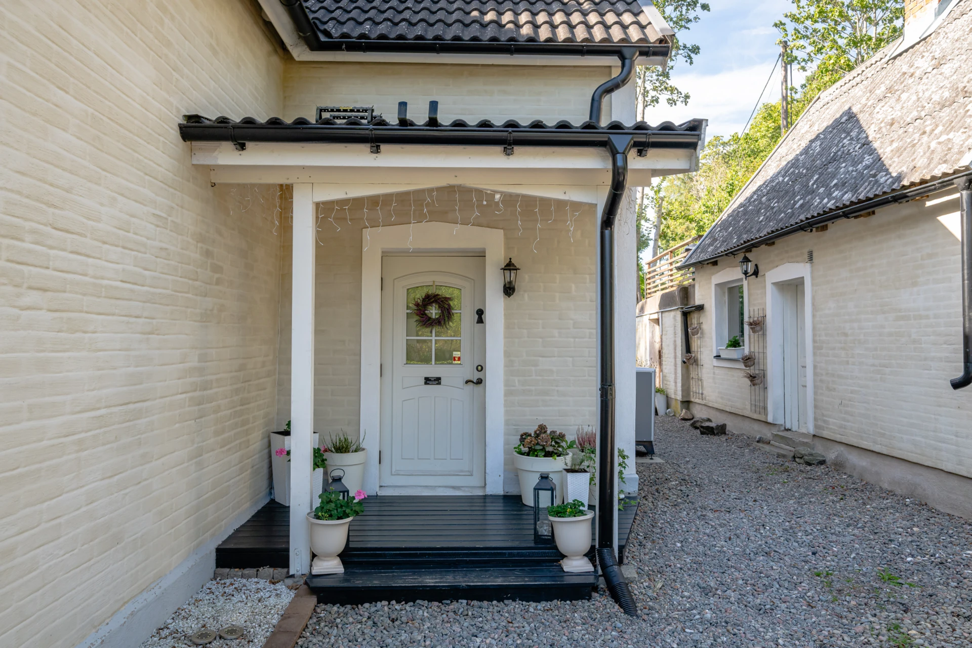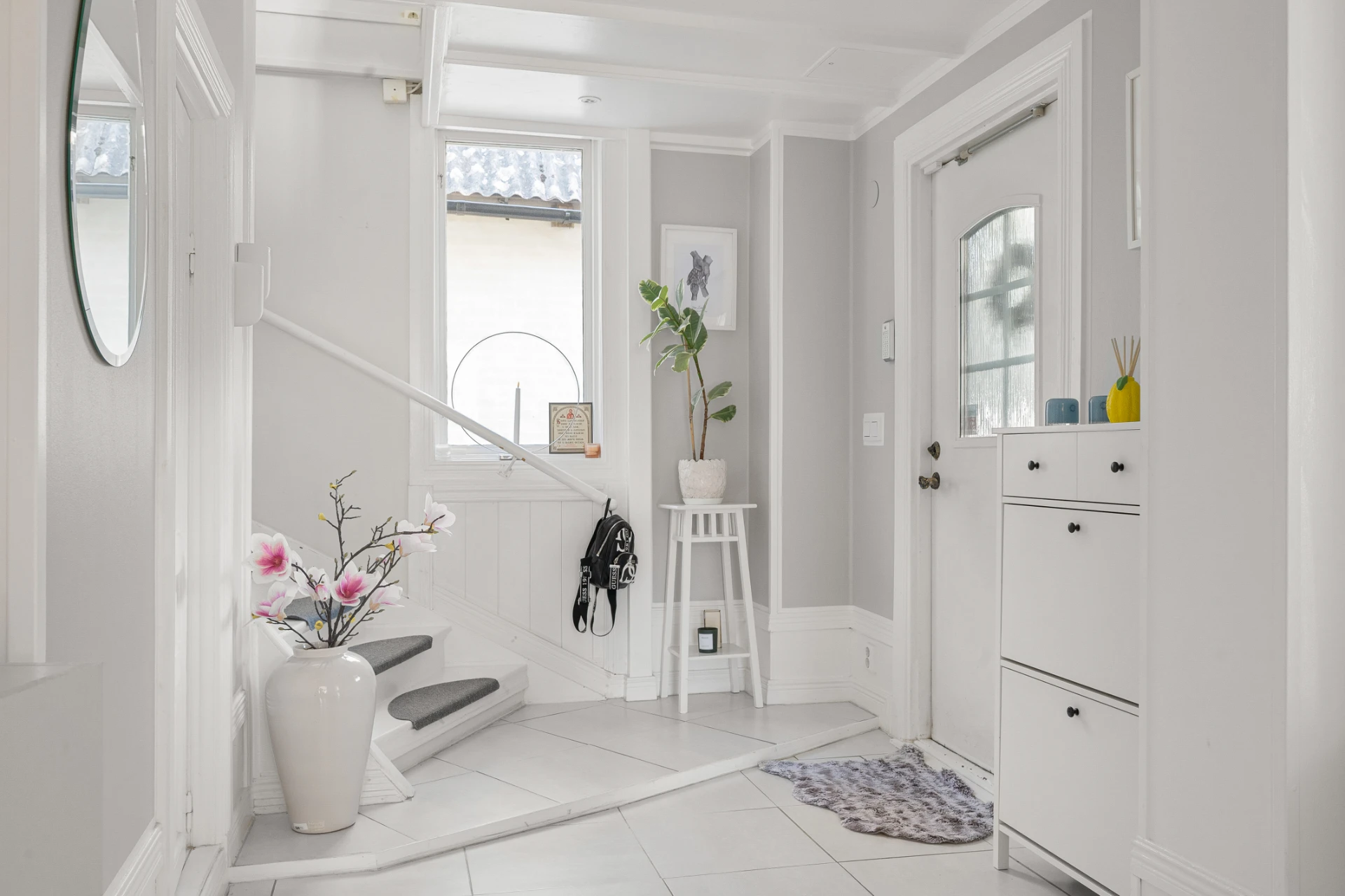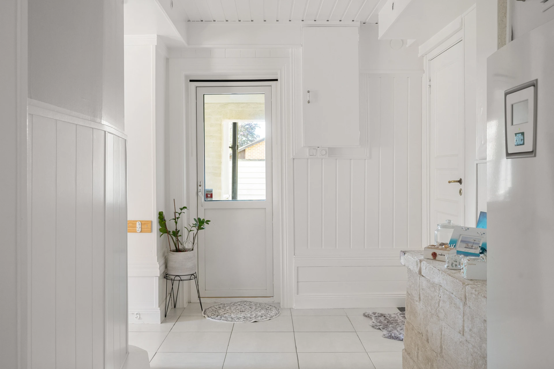 Klinkergolv med vattenburen golvvärme och vita väggar. Plats för avhängning och gott om extra förvaringsutrymme i angränsande klädkammare under trappan.