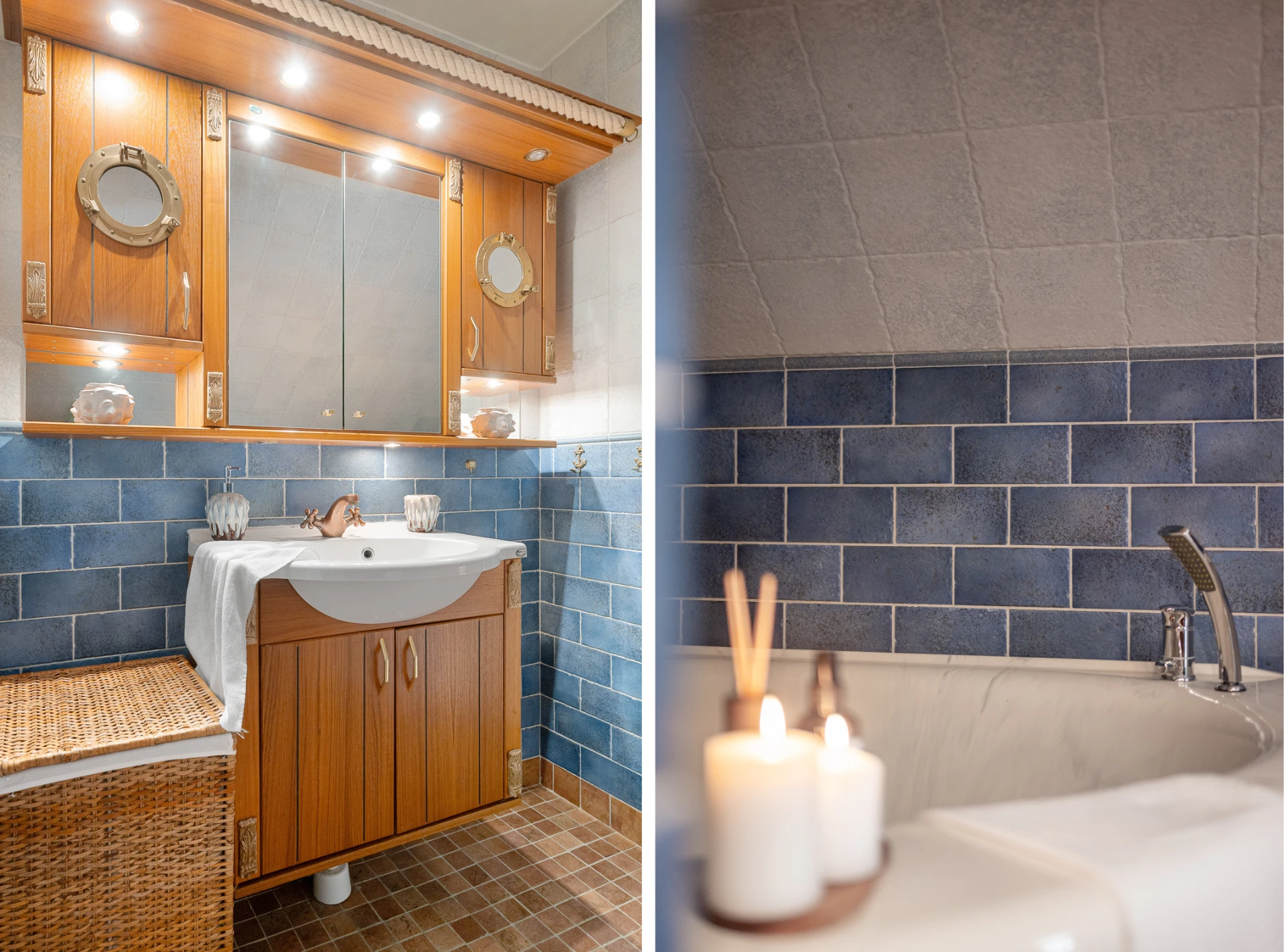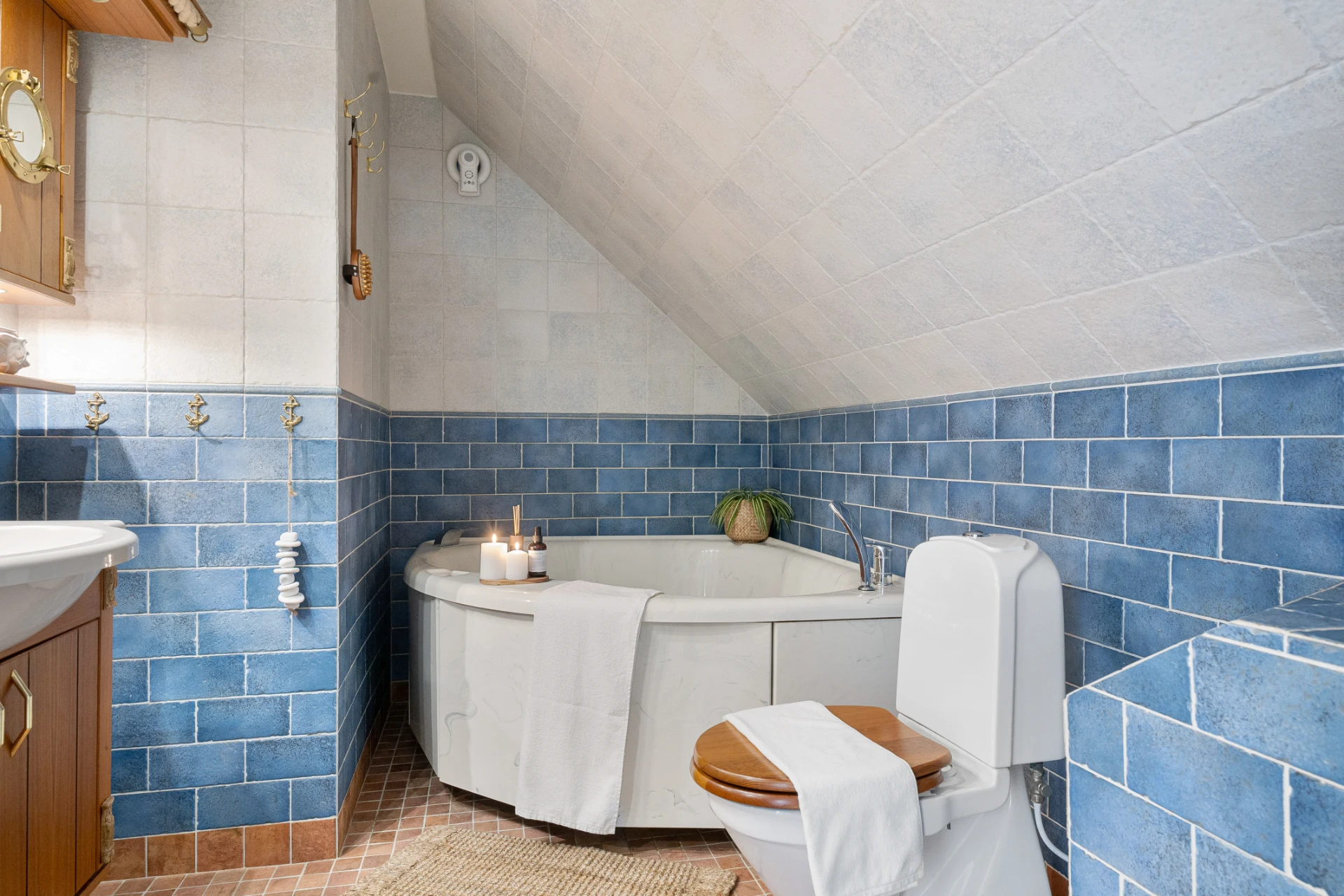 Sandfärgat klinkergolv med golvvärme (el) och blått/ljusgrått kaklade väggar. Badrummet är utrustat med WC, handfat med kommod, spegelskåp samt badkar.