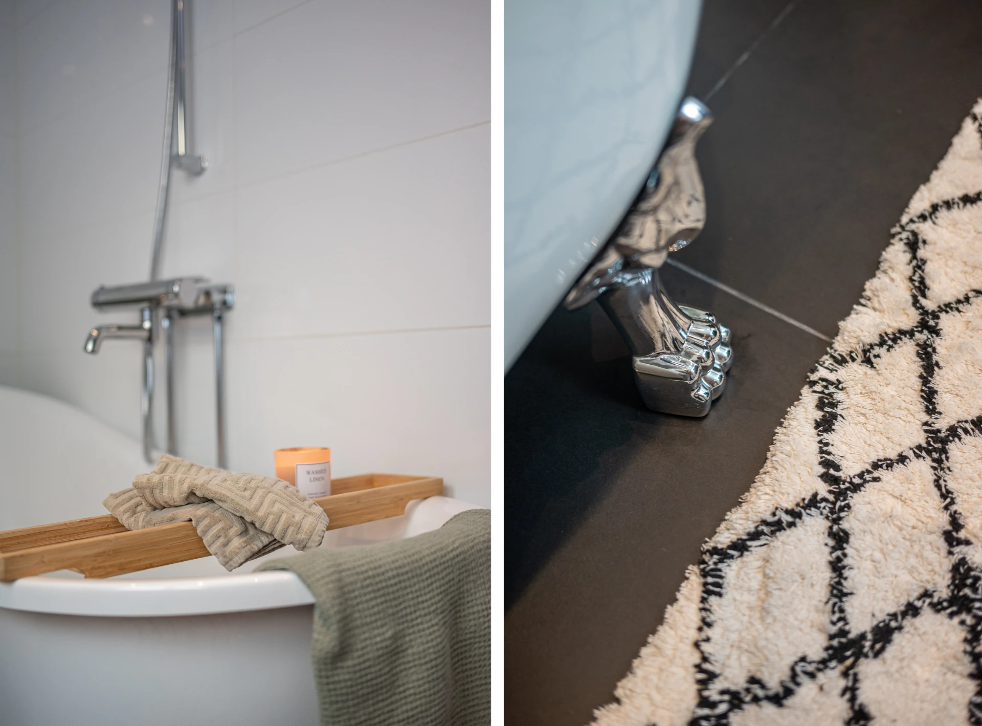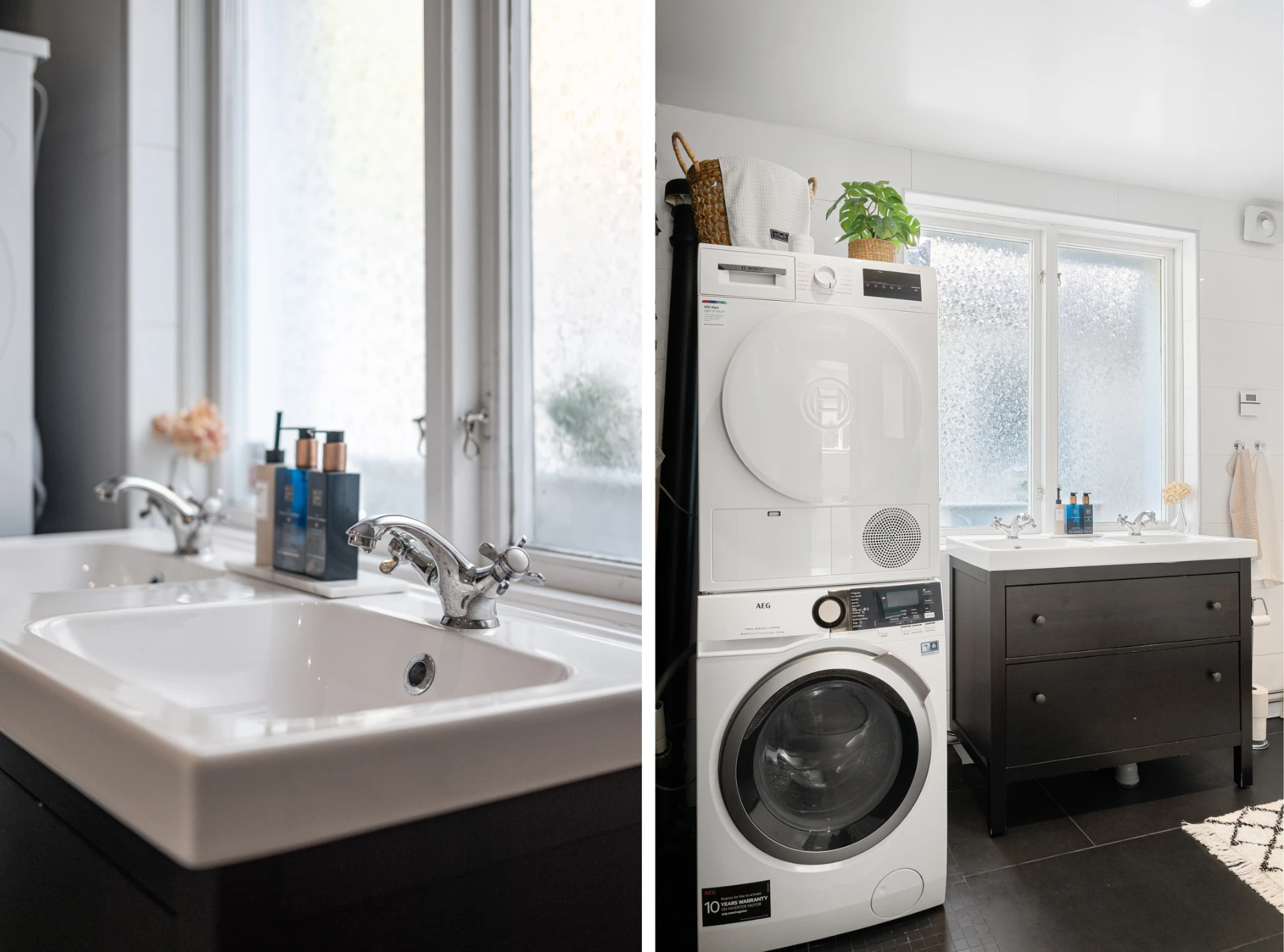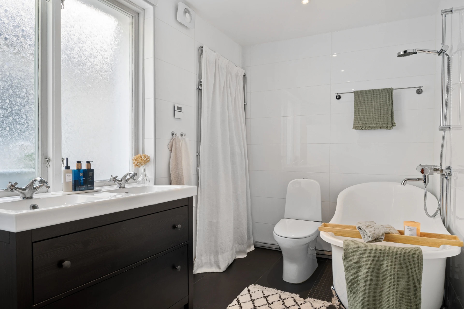 Mörkt klinkergolv med vattenburen golvvärme och vitt kaklade väggar. Badrummet är utrustat med WC, dubbelhandfat med svart kommod, badkar, tvättmaskin (AEG) samt torktumlare (Bosch) i tvättpelare och grovingång.