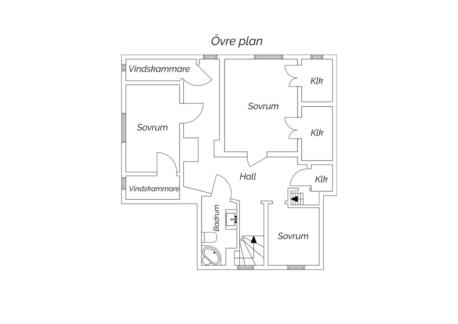 Laminatgolv och tapetserade väggar. Ingång till två klädkammare i anslutning till de olika sovrummen. Trappuppång till vinden bakom en av dörrarna.