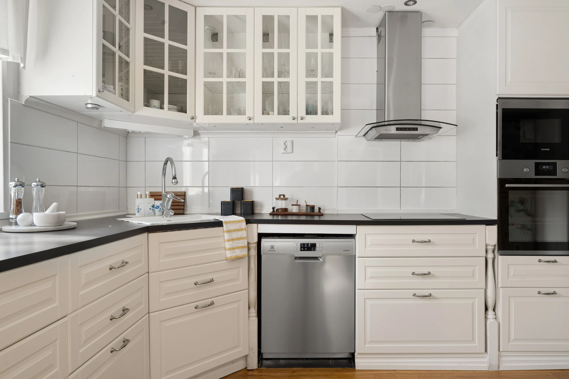 Laminatgolv med vattenburen golvvärme och tapetserade väggar. Köksinredning i vit/beige med arbetsbänk i mörk laminat samt vitt kakel som stänkskydd. Köket är utrustat med induktionshäll, inbyggd ugn (Siemens), fläkt (Thermex), inbyggd mikro (Siemens), diskmaskin (Electrolux) samt kombinerad extra bred kyl och frys. Öppning i väggen sammanflätar köket med matsalen.